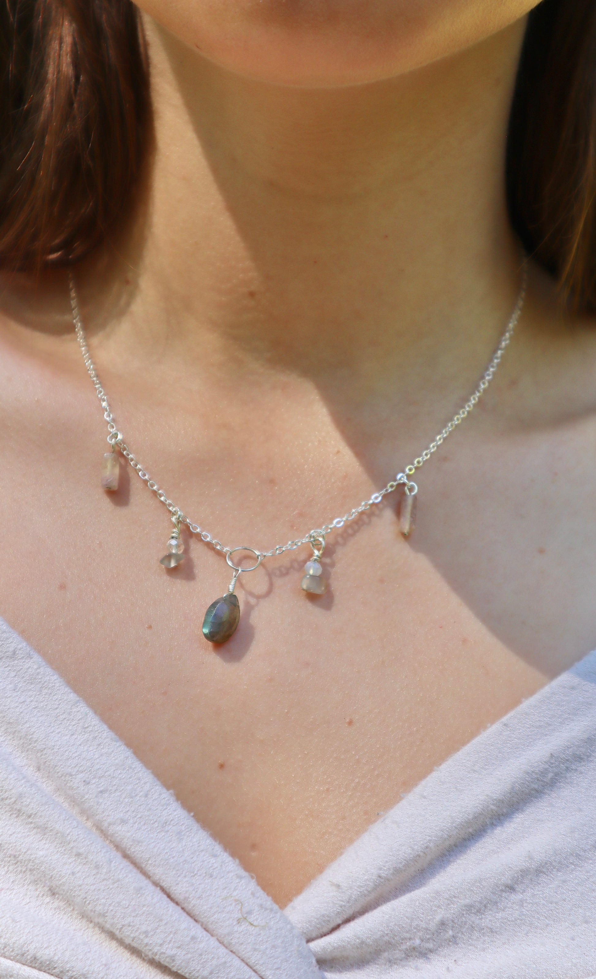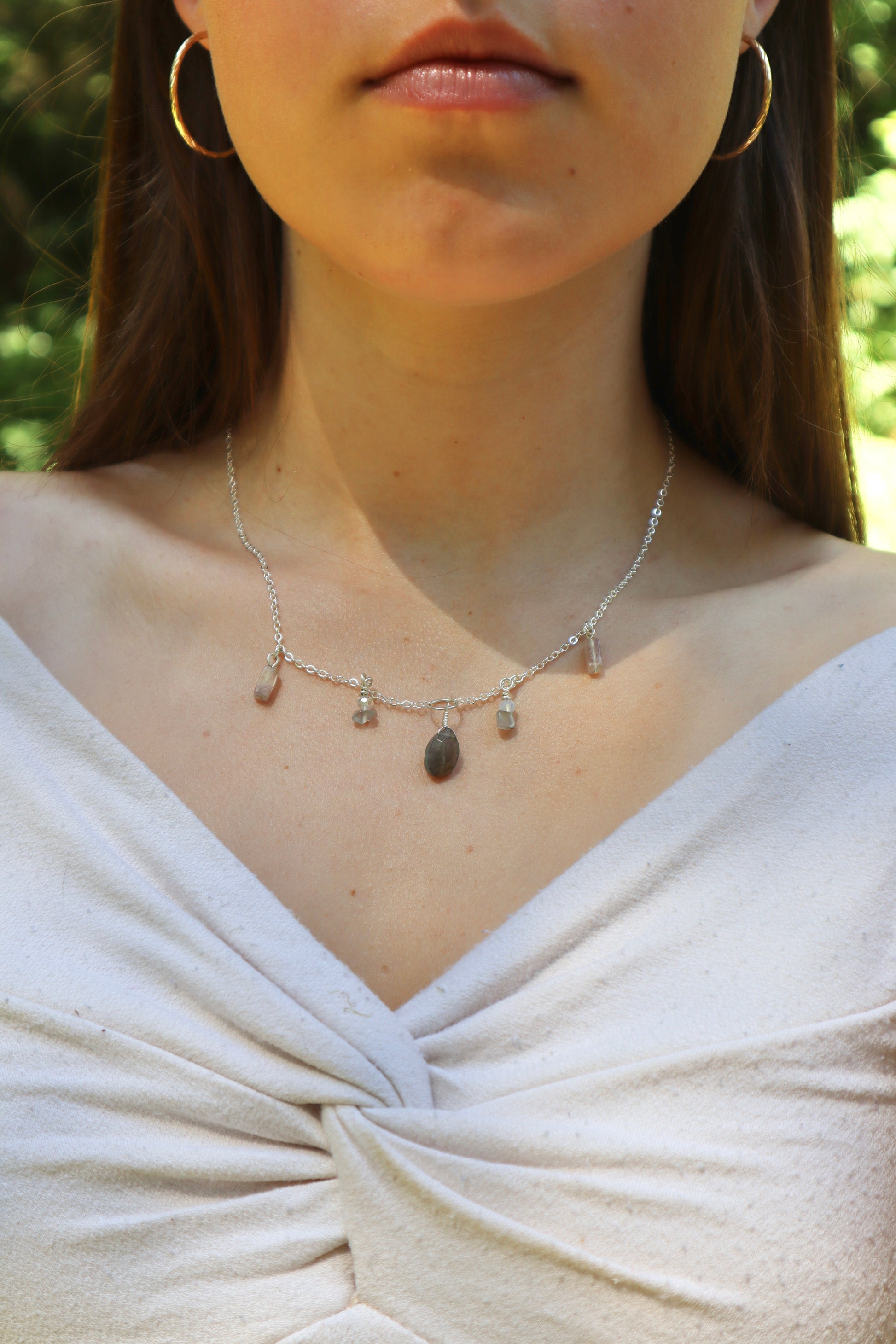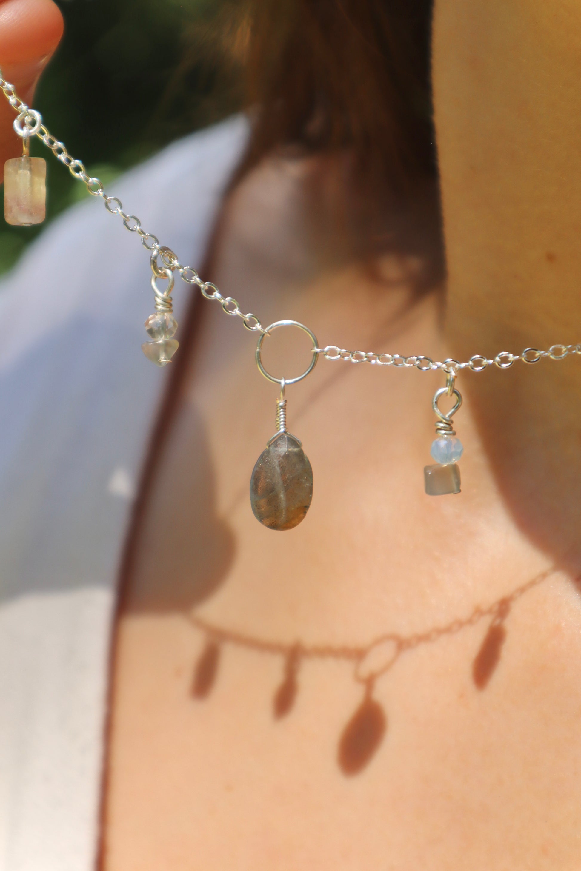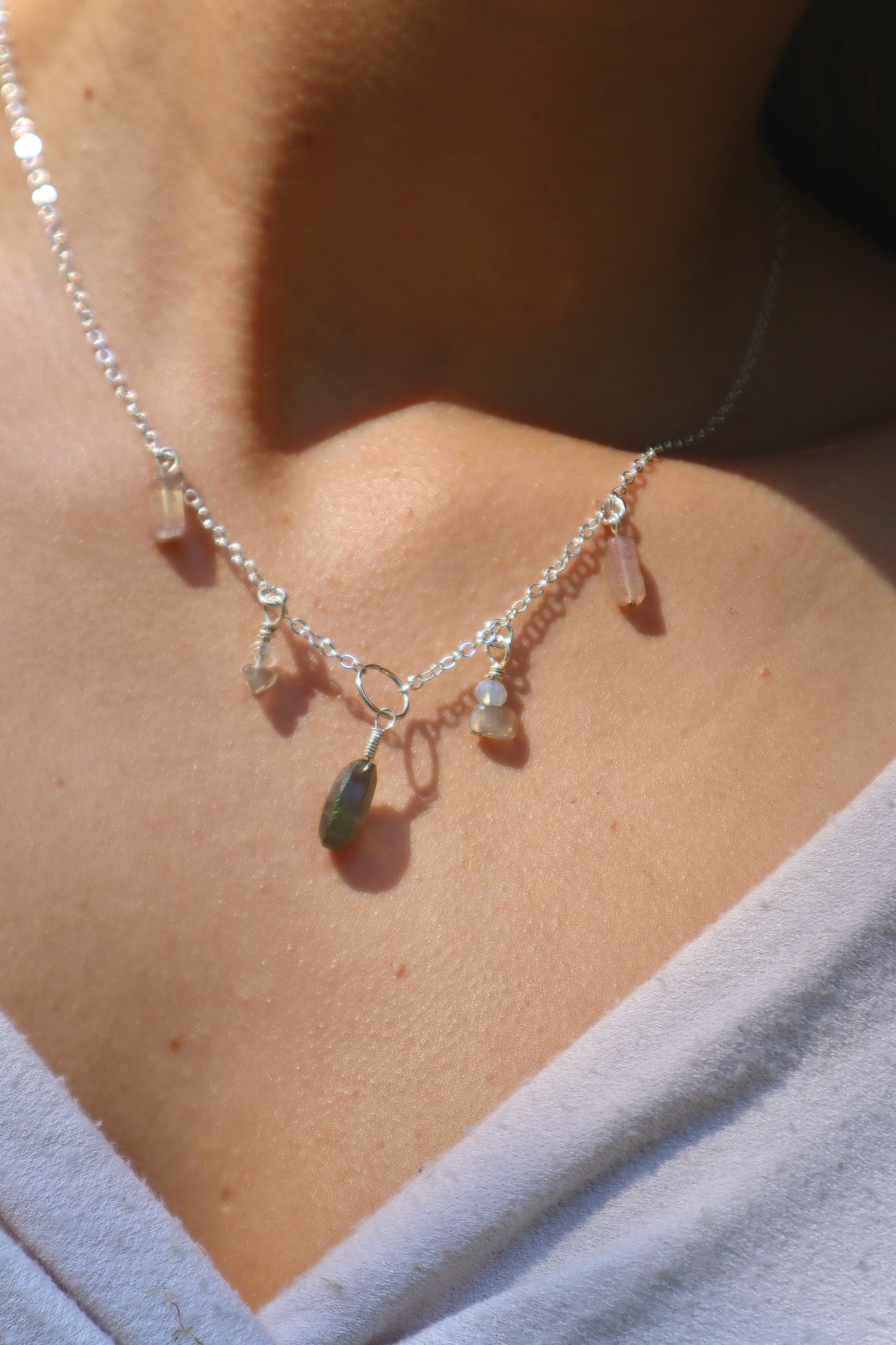 Introducing our Adorned Labradorite Gem Chain Necklace. Made with genuine labradorite, moonstone, and amethyst gemstones. This dainty yet striking beauty will add a touch of elegance as your everyday wear. These flashy crystals are strung along on a shiny stainless steel chain, ensuring durability and tarnish resistance. Available in silver with options to add an adjustable chain.