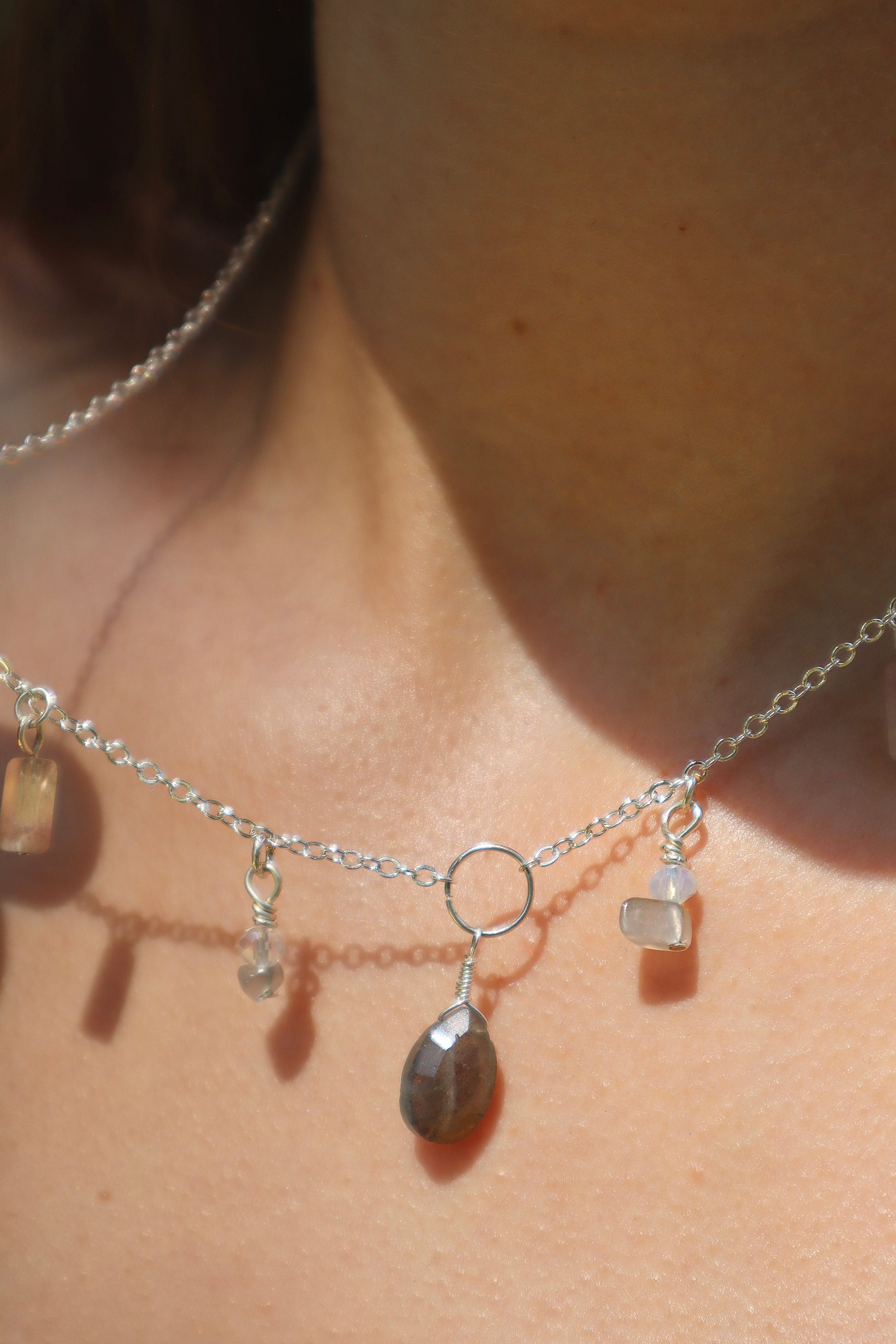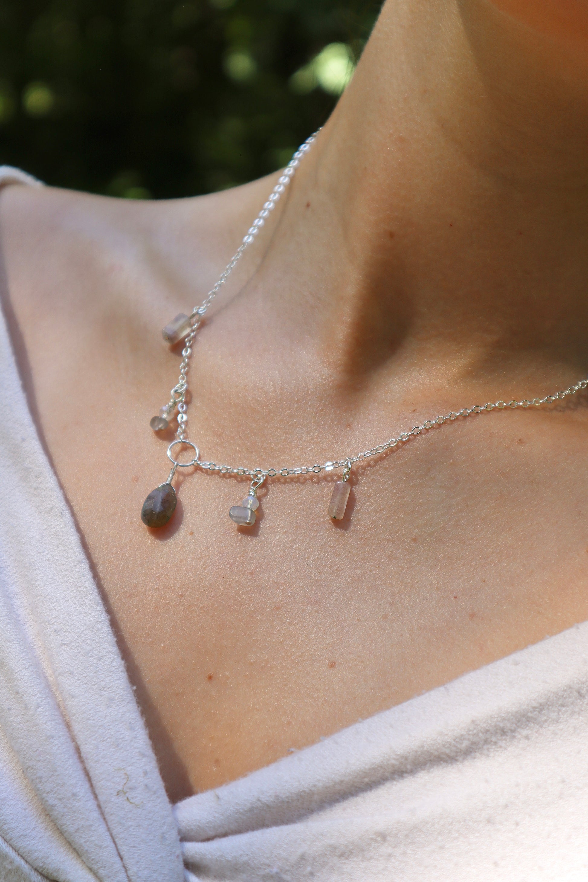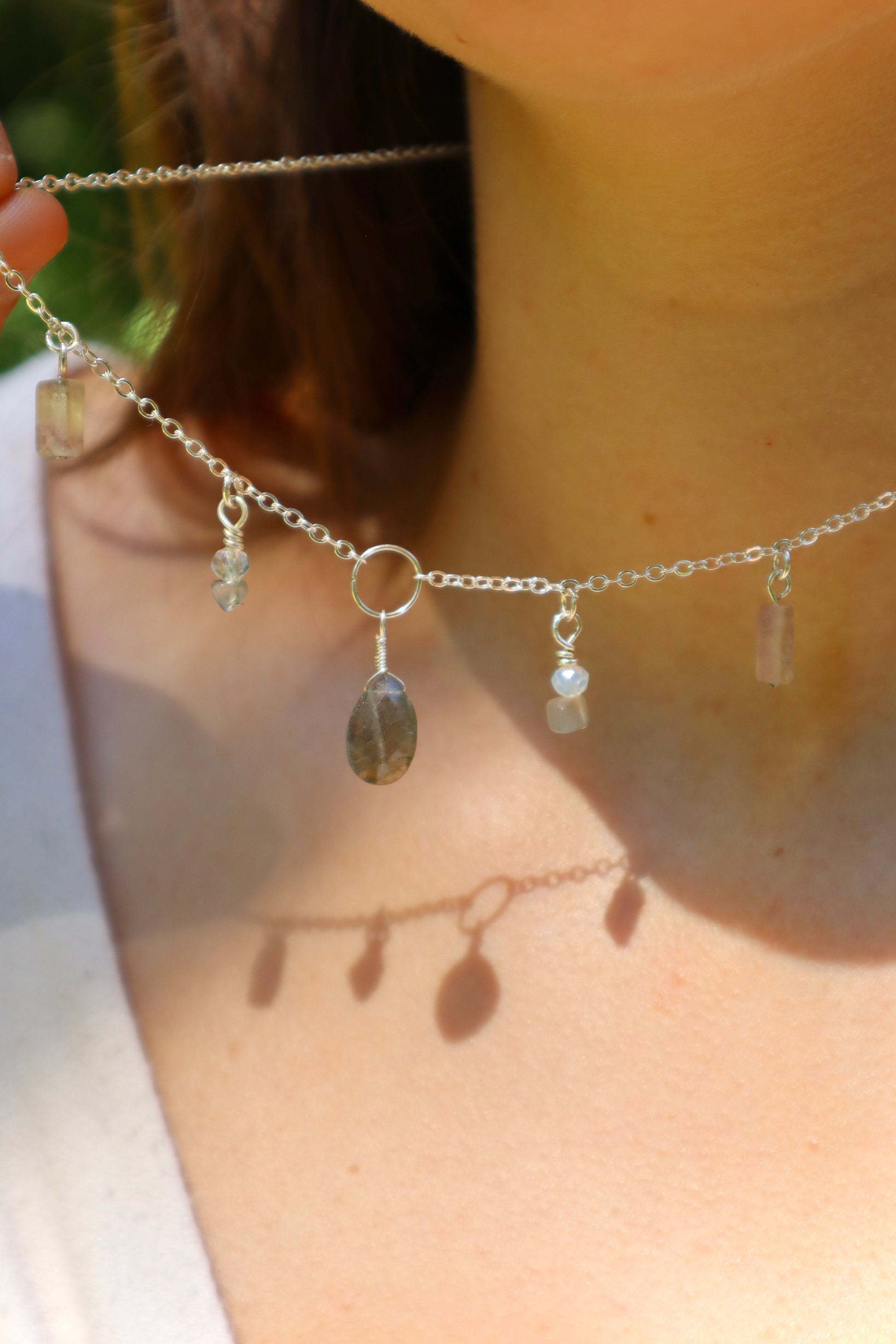 Introducing our Adorned Labradorite Gem Chain Necklace. Made with genuine labradorite, moonstone, and amethyst gemstones. This dainty yet striking beauty will add a touch of elegance as your everyday wear. These flashy crystals are strung along on a shiny stainless steel chain, ensuring durability and tarnish resistance. Available in silver with options to add an adjustable chain.