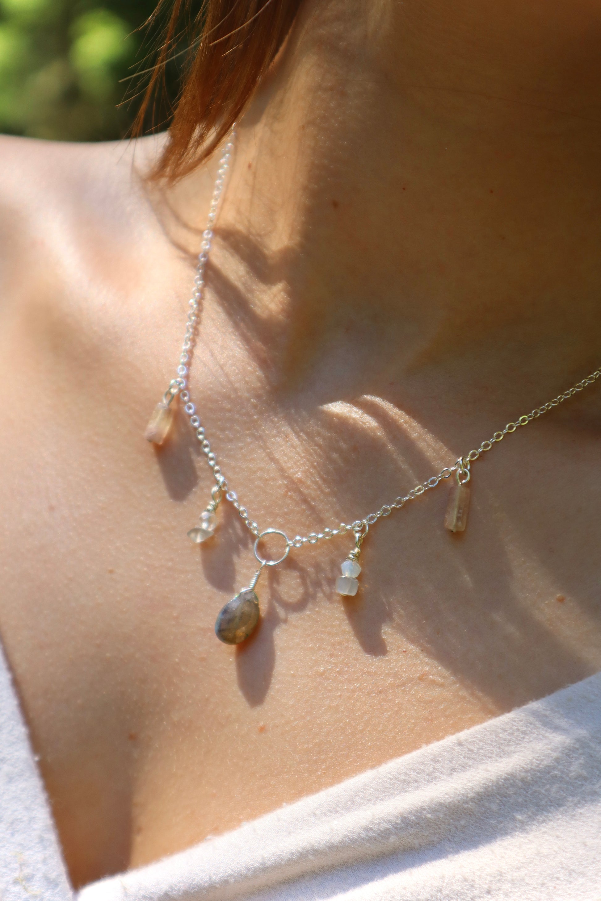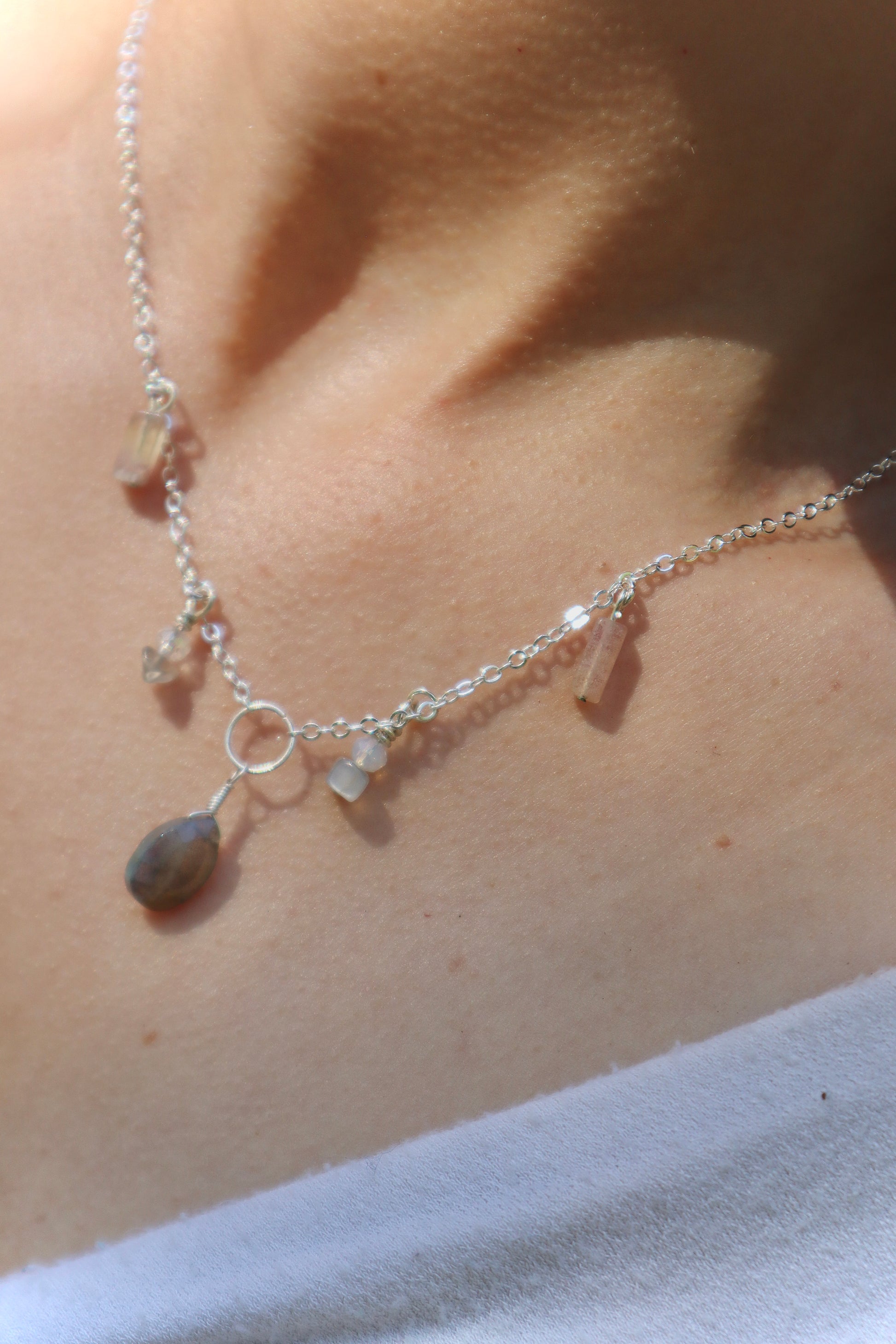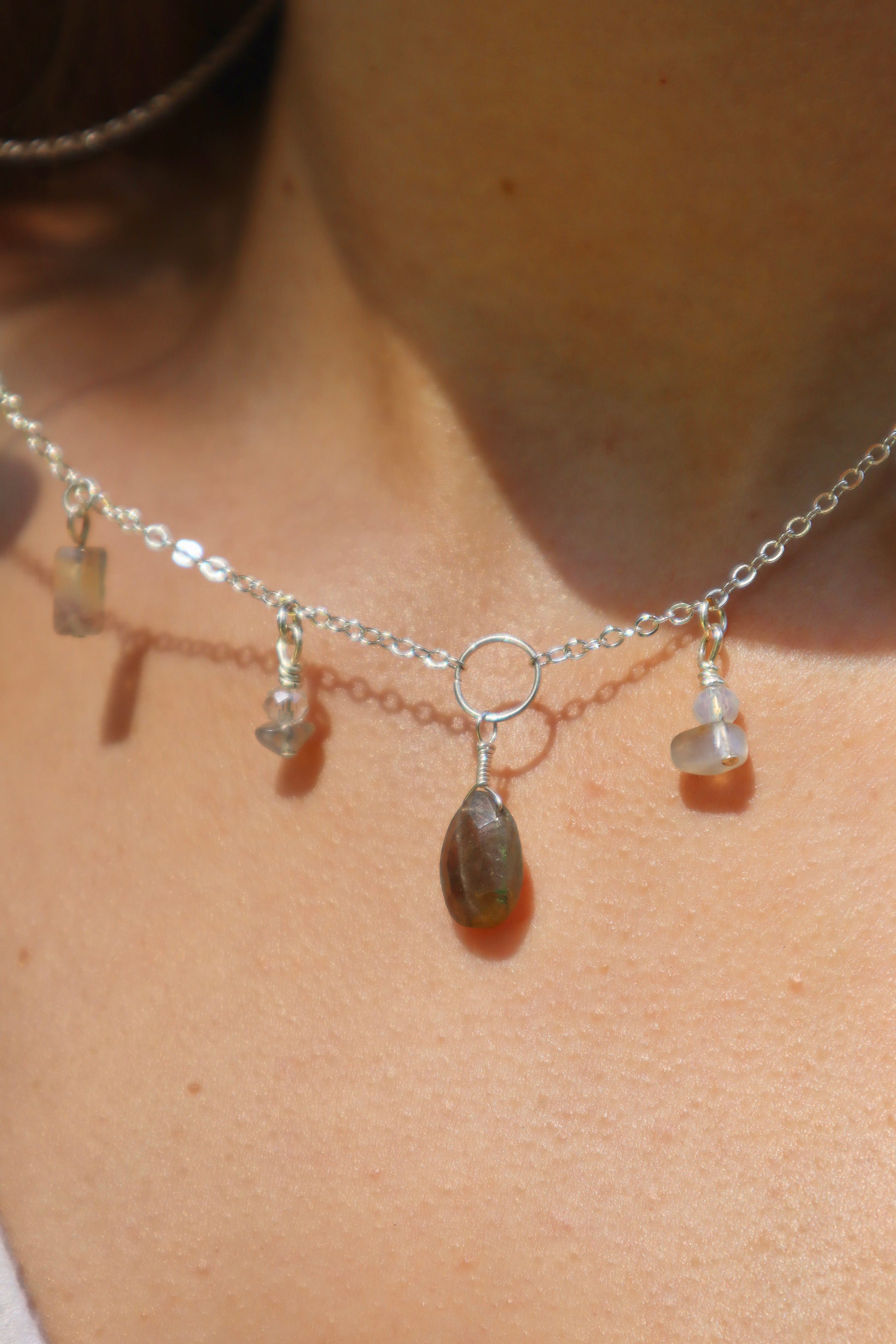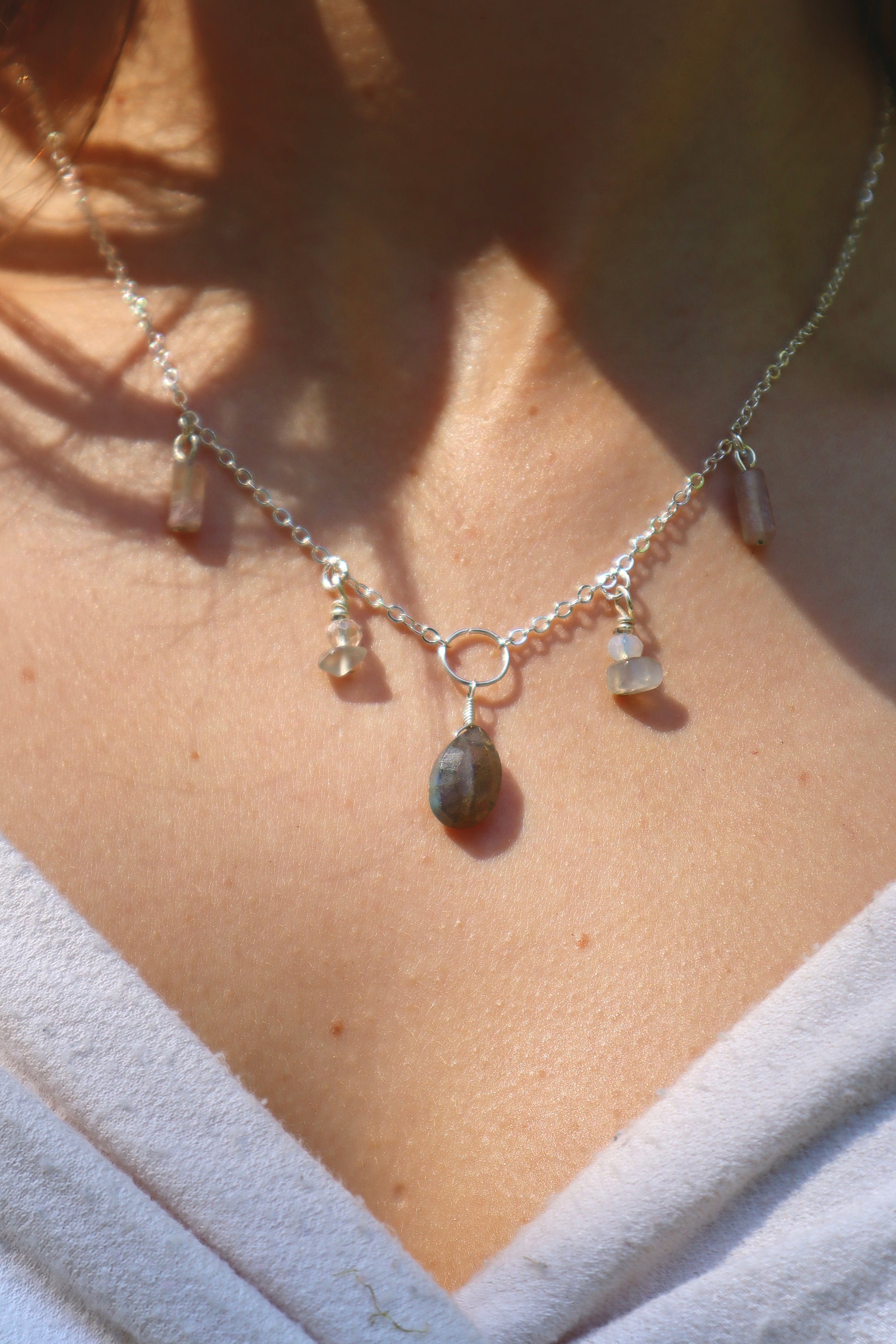 Introducing our Adorned Labradorite Gem Chain Necklace. Made with genuine labradorite, moonstone, and amethyst gemstones. This dainty yet striking beauty will add a touch of elegance as your everyday wear. These flashy crystals are strung along on a shiny stainless steel chain, ensuring durability and tarnish resistance. Available in silver with options to add an adjustable chain.
