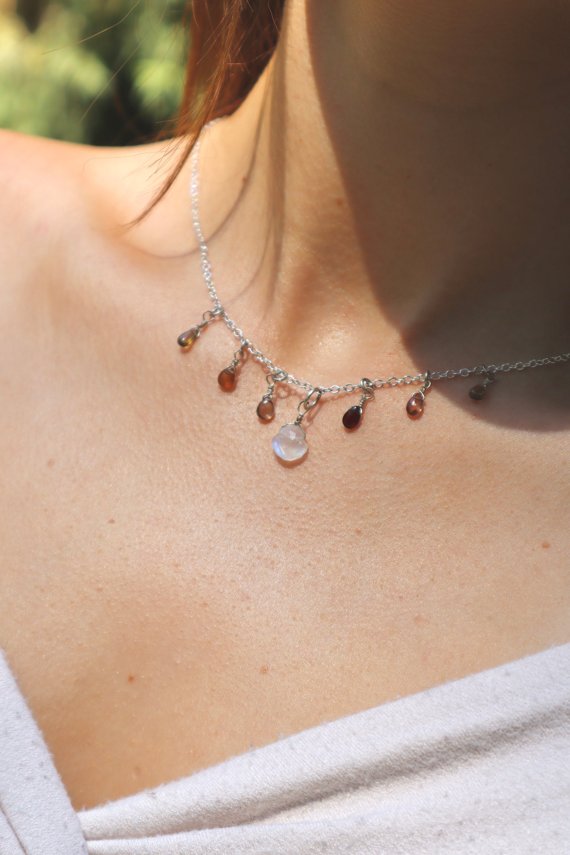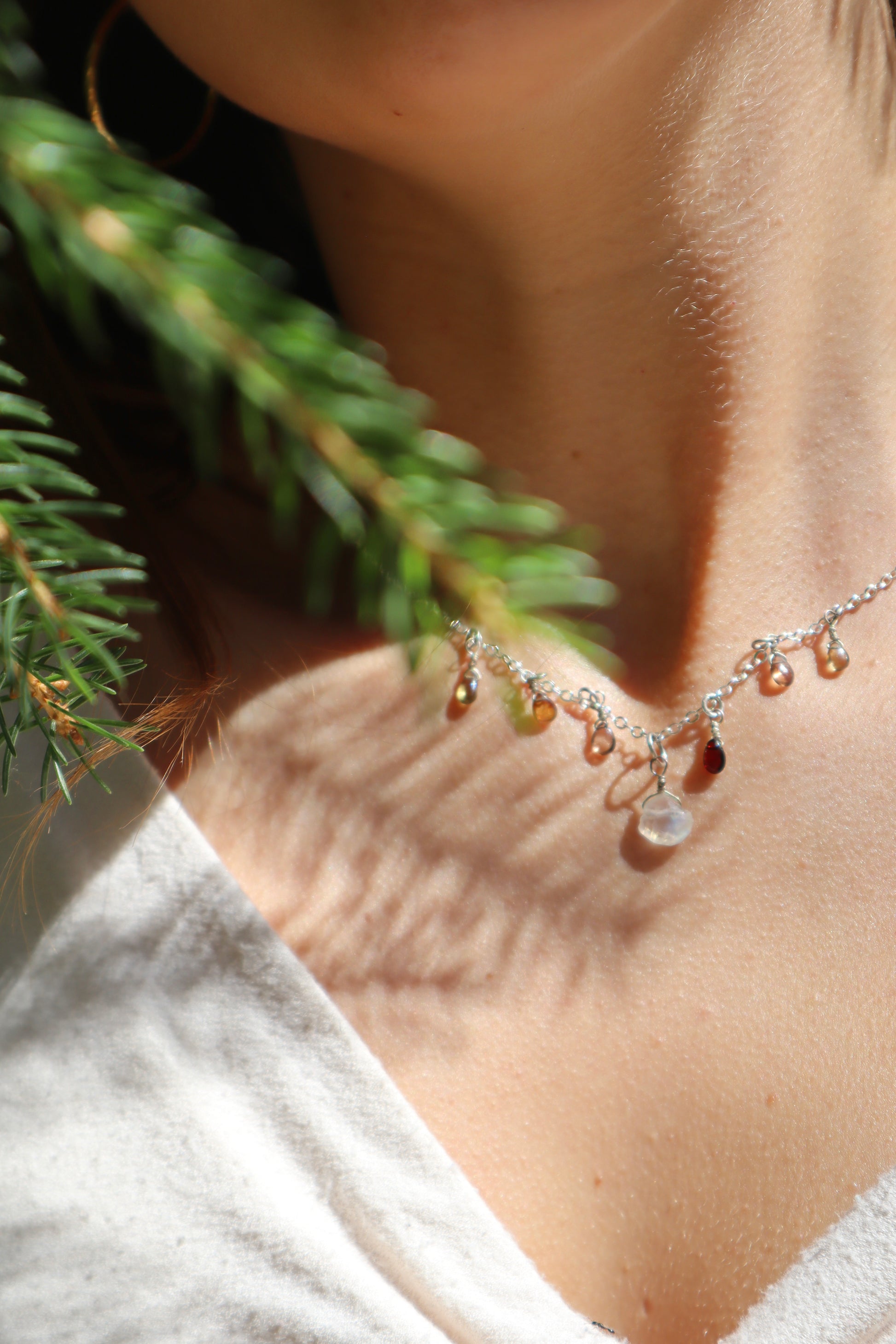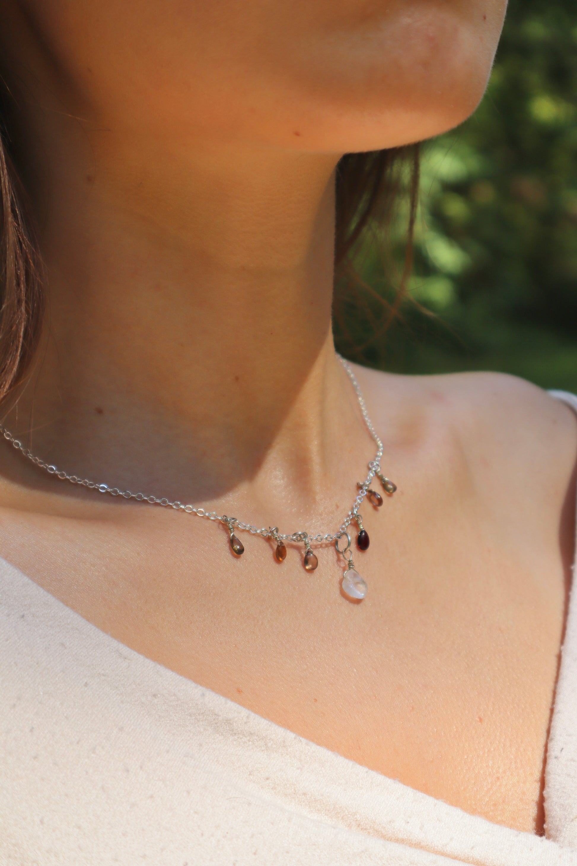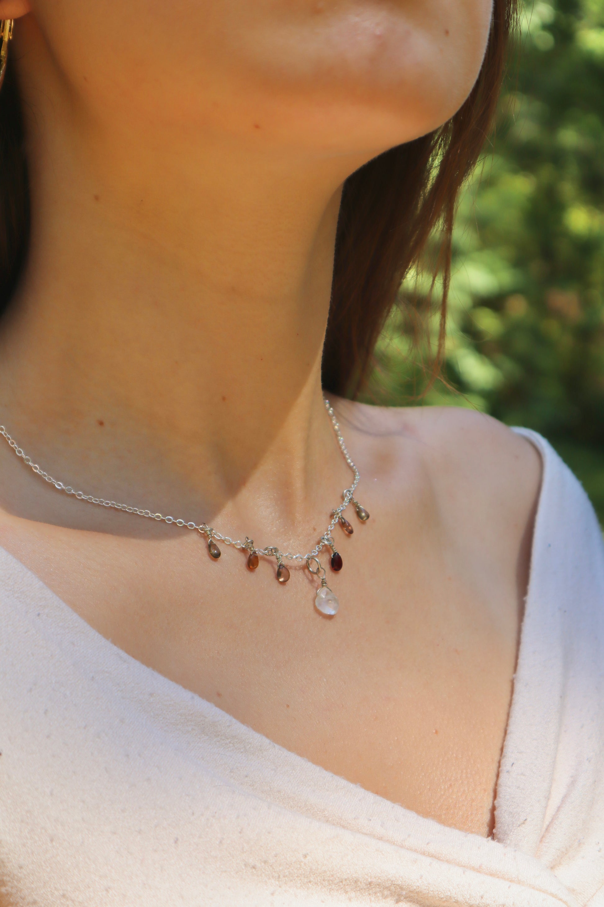 Introducing our Aura Opal Gem Charm Necklace. Made with a genuine opal crystal along with stunning teardrop gems. This dainty yet striking beauty will add a touch of elegance as your everyday wear. These flashy crystals are strung along on a shiny stainless steel chain, ensuring durability and tarnish resistance. Available in silver with options to add an adjustable chain.