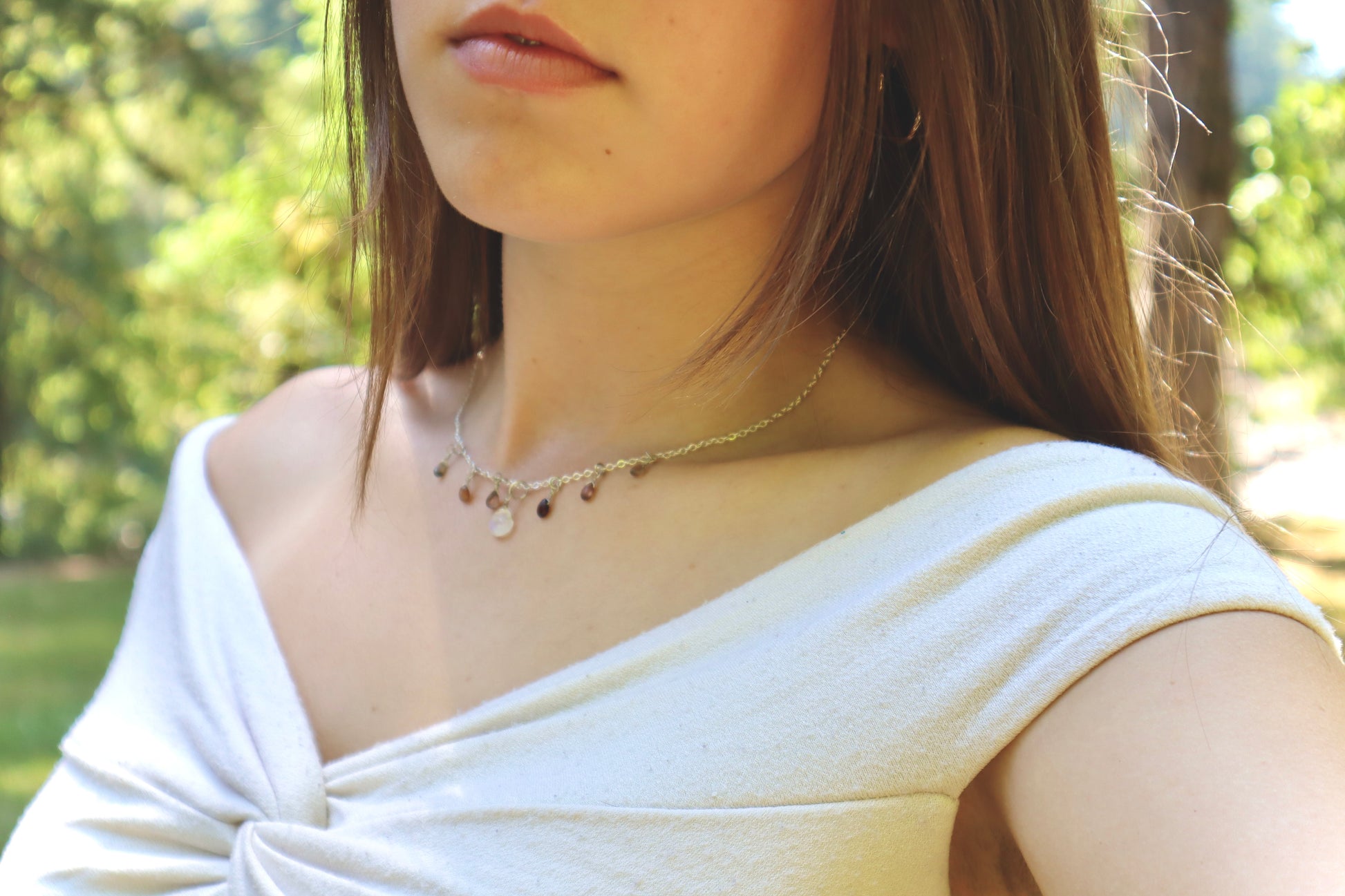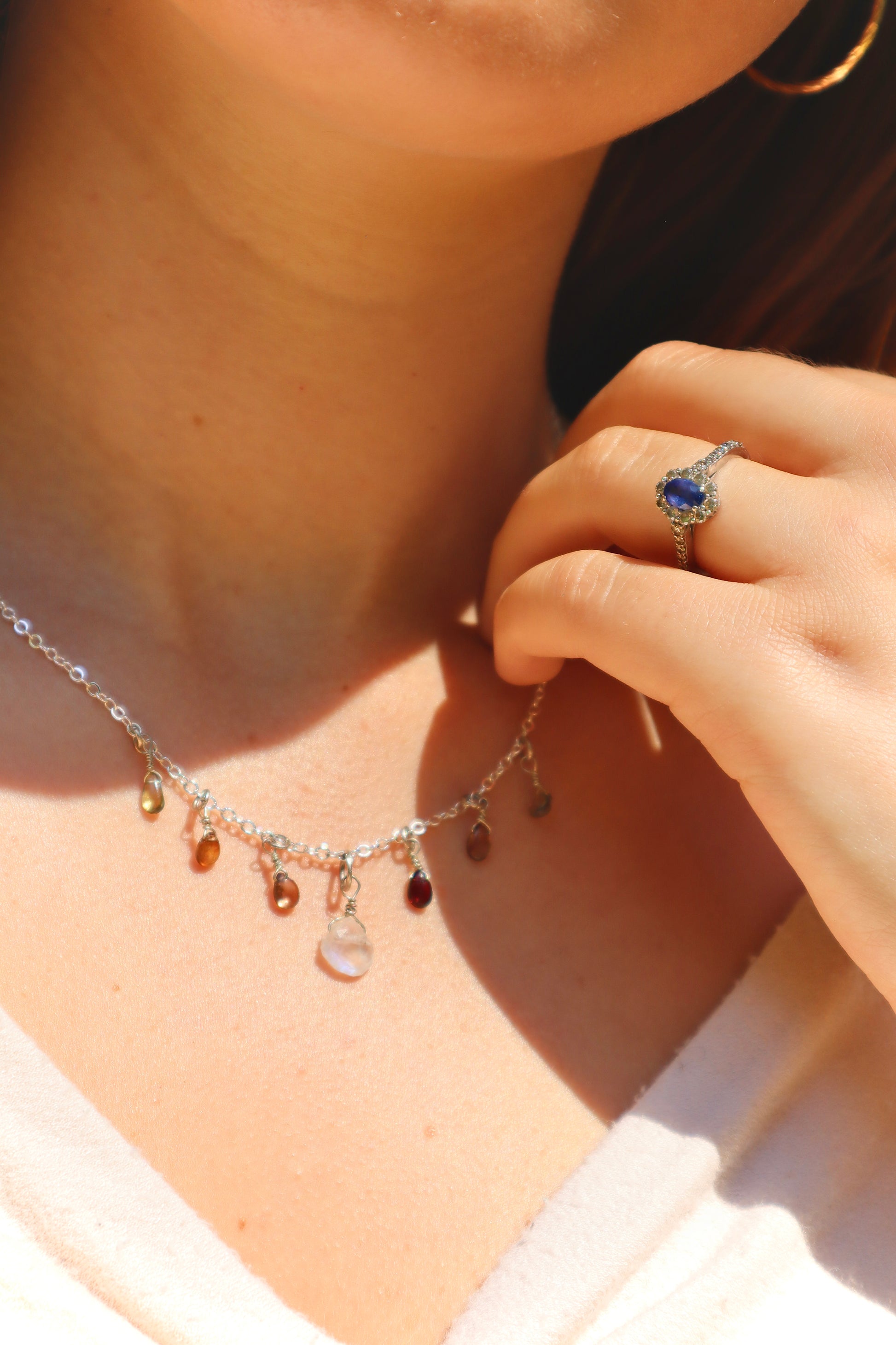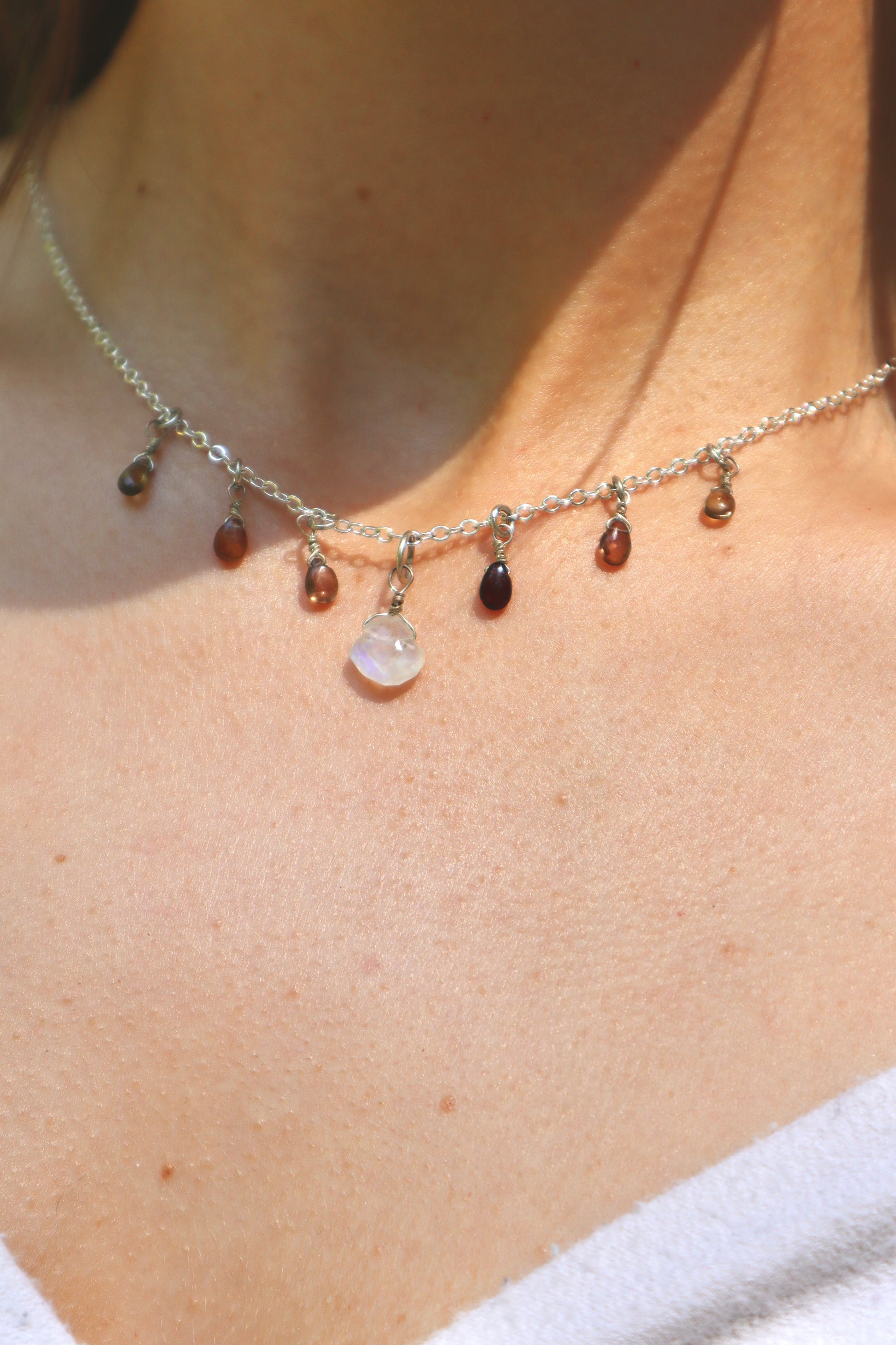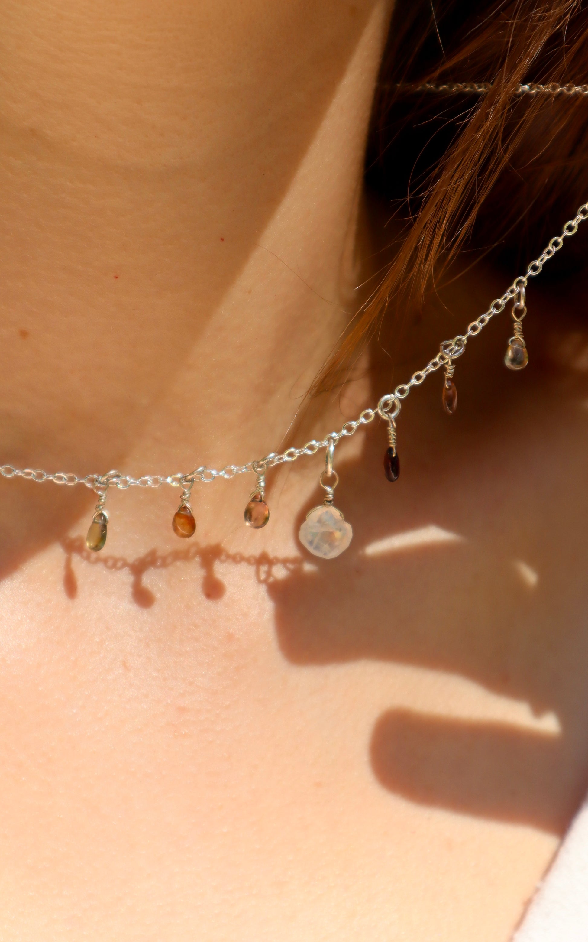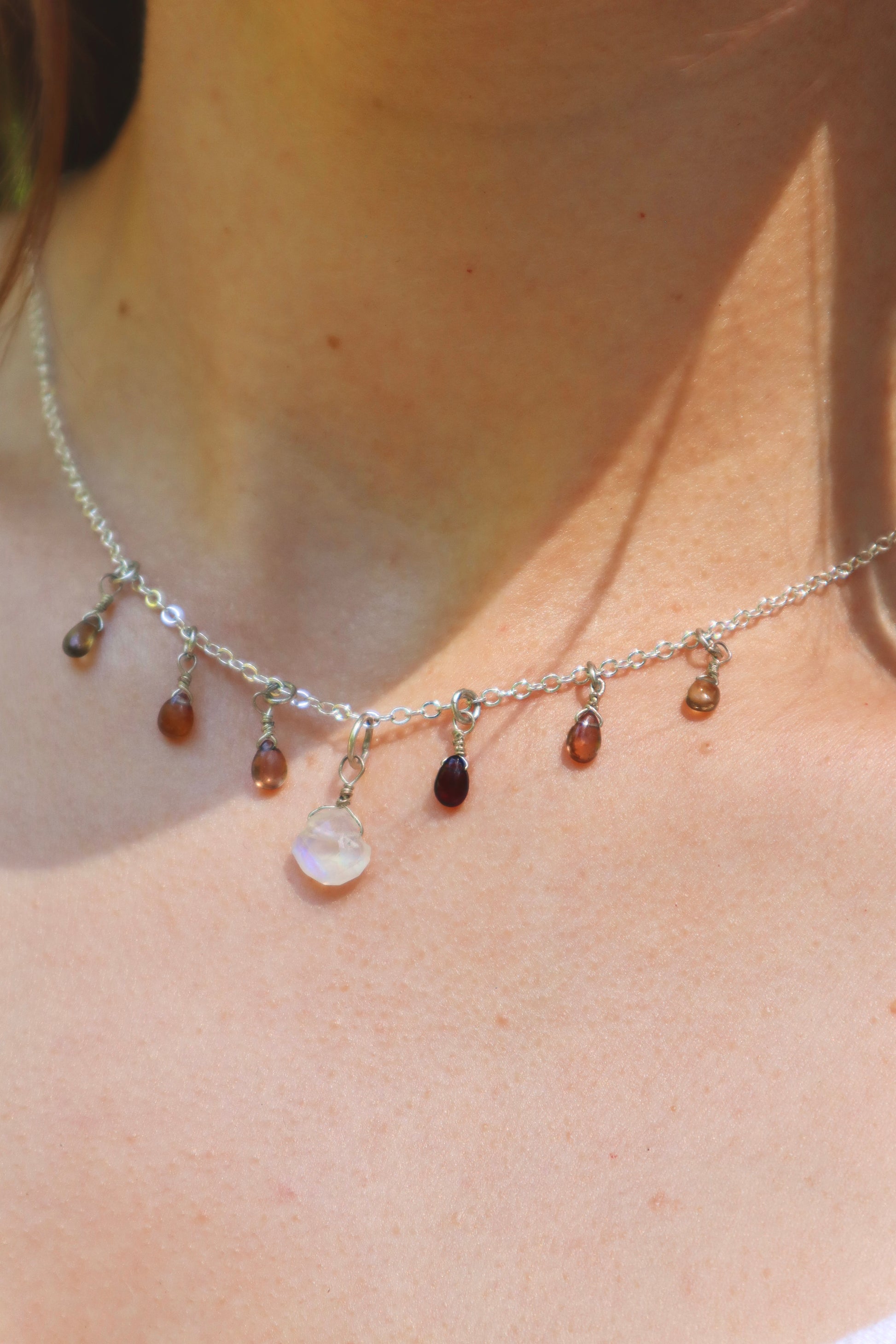 Introducing our Aura Opal Gem Charm Necklace. Made with a genuine opal crystal along with stunning teardrop gems. This dainty yet striking beauty will add a touch of elegance as your everyday wear. These flashy crystals are strung along on a shiny stainless steel chain, ensuring durability and tarnish resistance. Available in silver with options to add an adjustable chain.