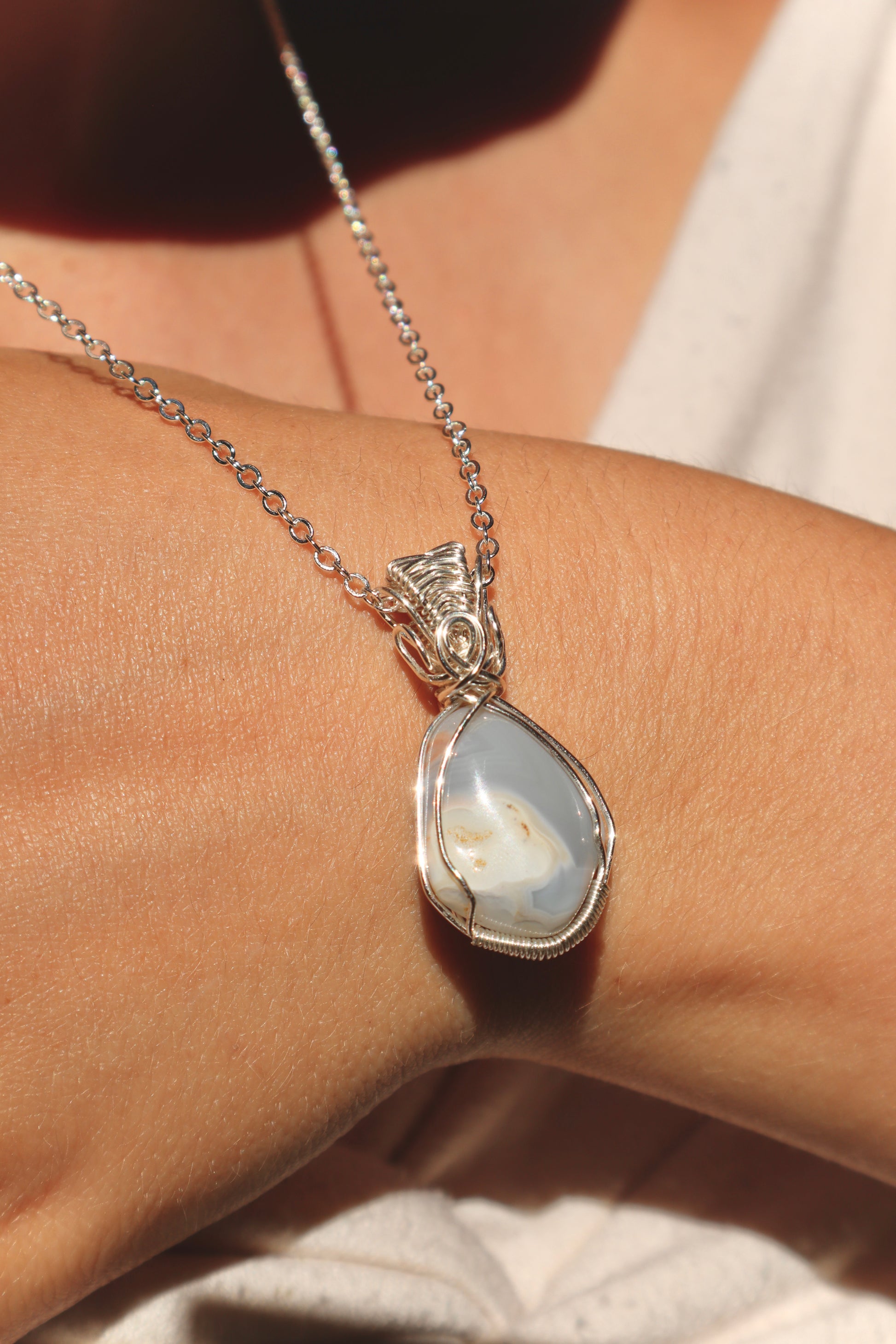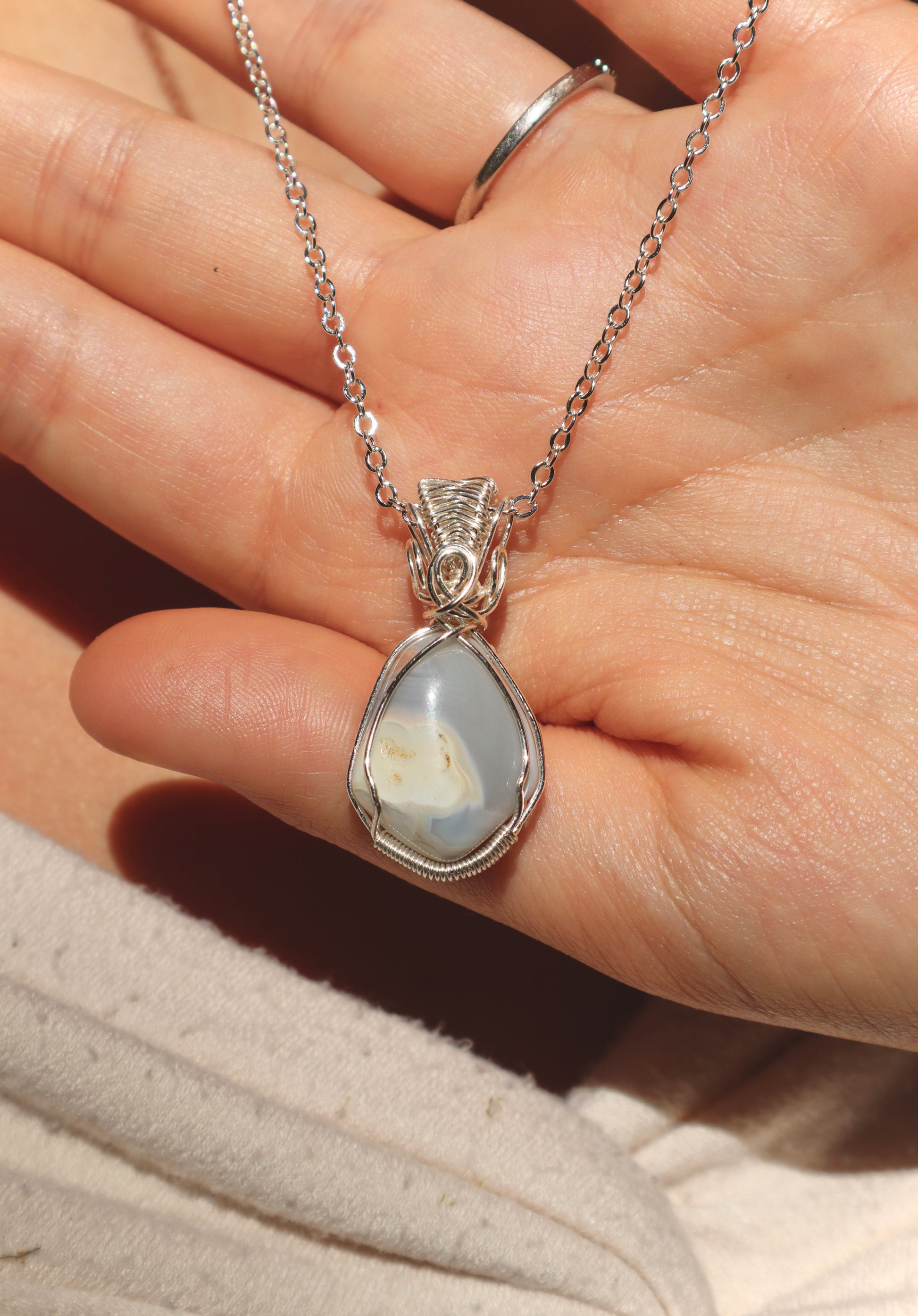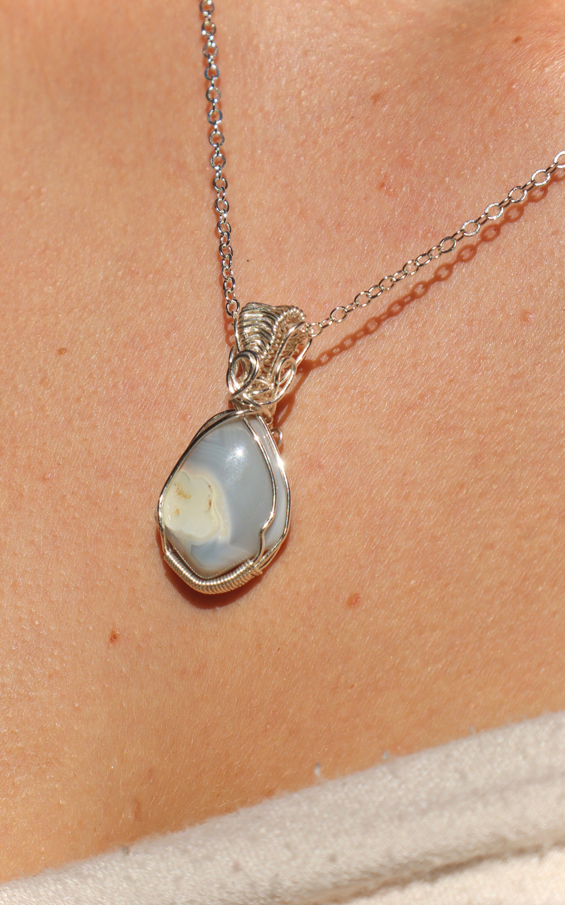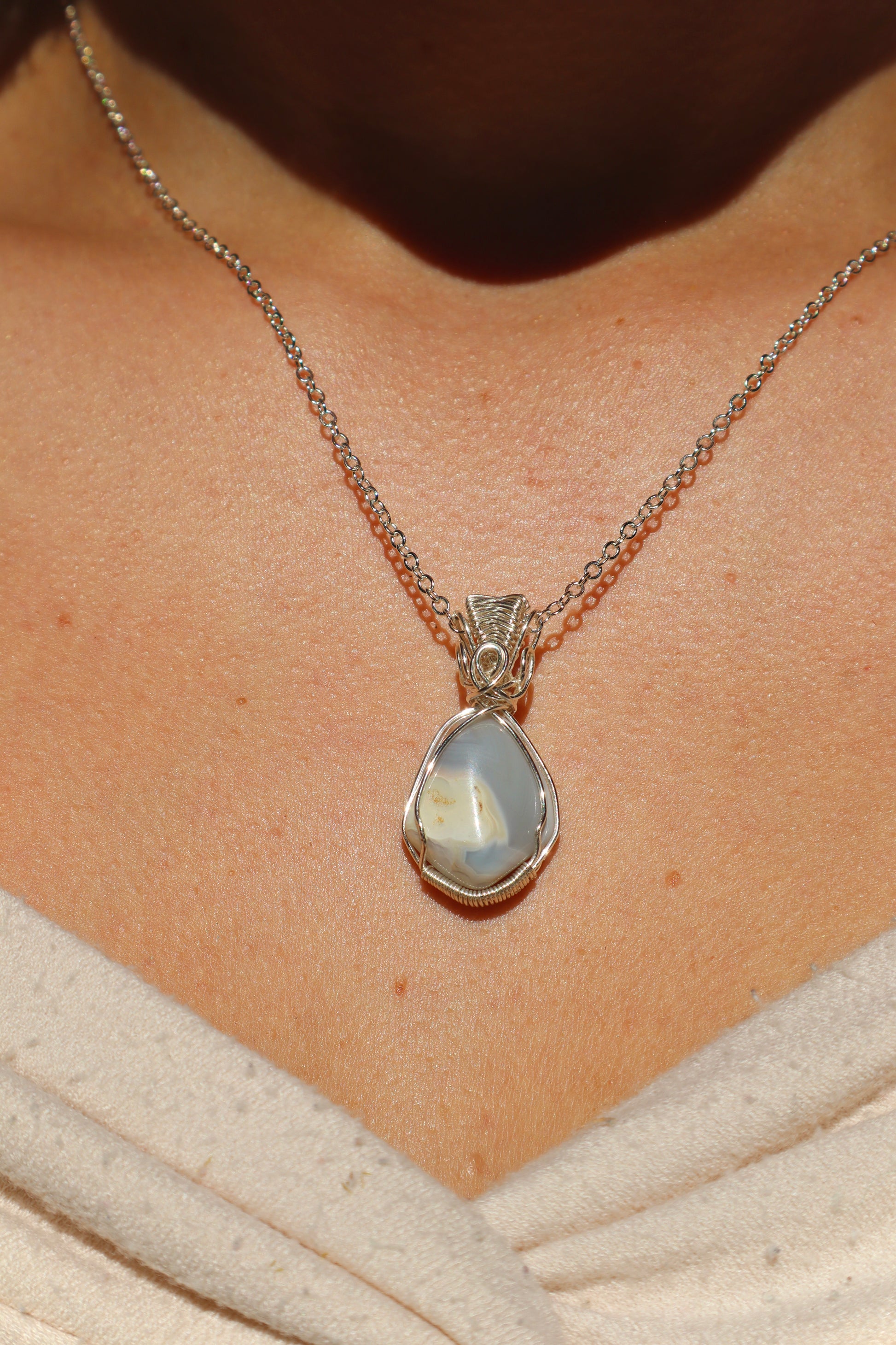 Introducing our Blue Lace Botswana Agate Pendant. This pendant showcases a range of stunning pastel blue colors. Its intricate design is wrapped with tarnish-resistant copper wire, adding a touch of beauty and elegance. Paired with your choice of chain, this pendant is the perfect addition to your collection.