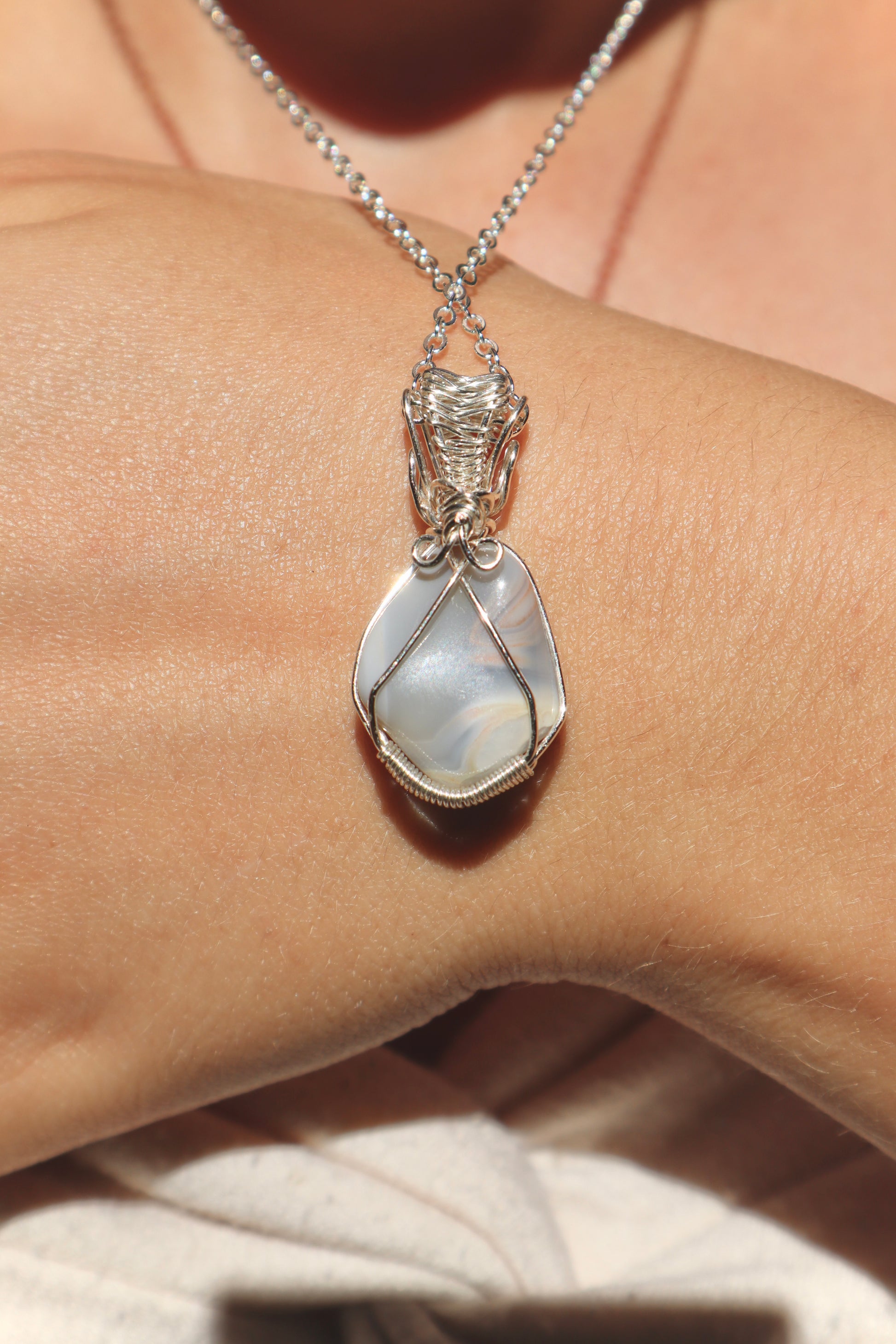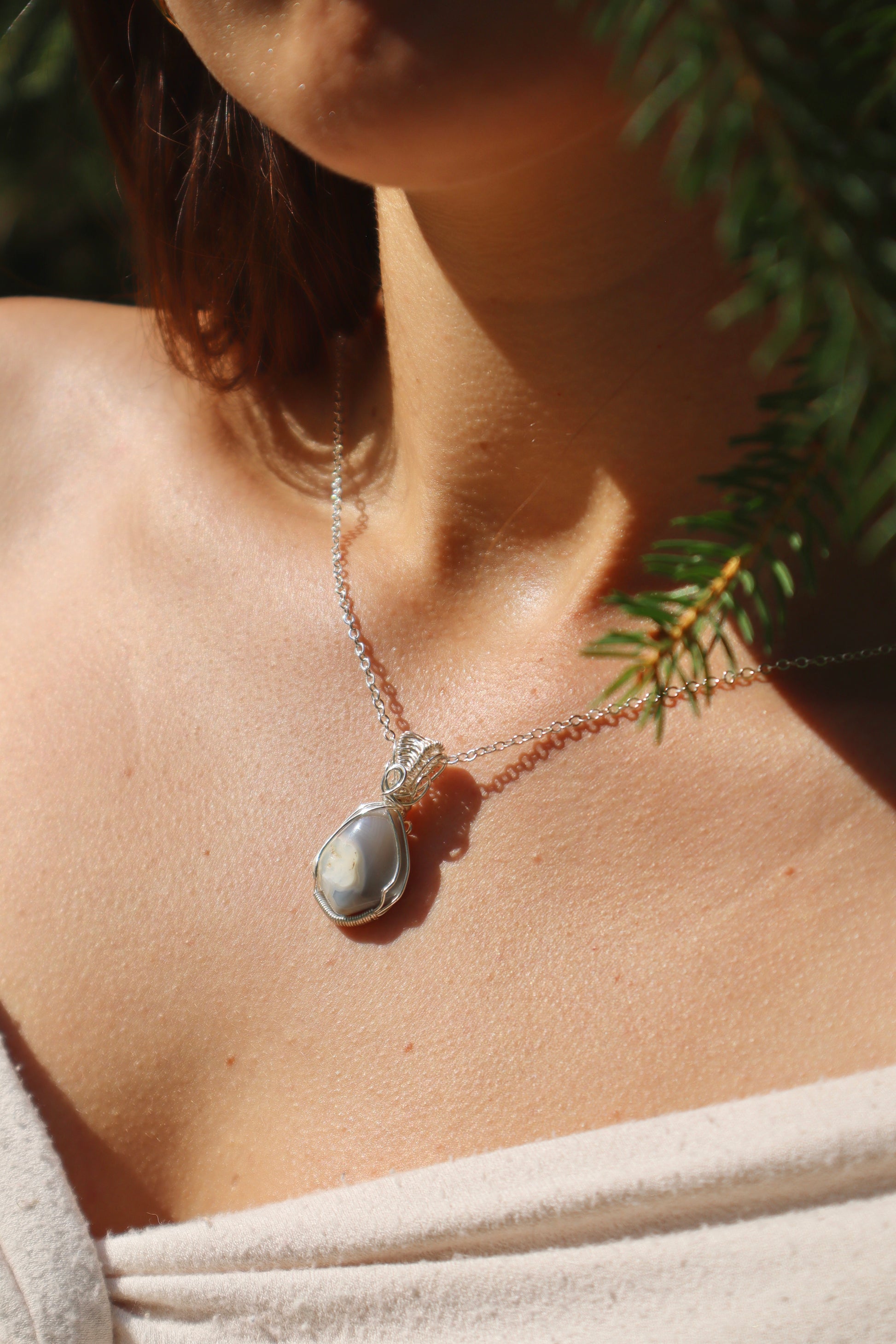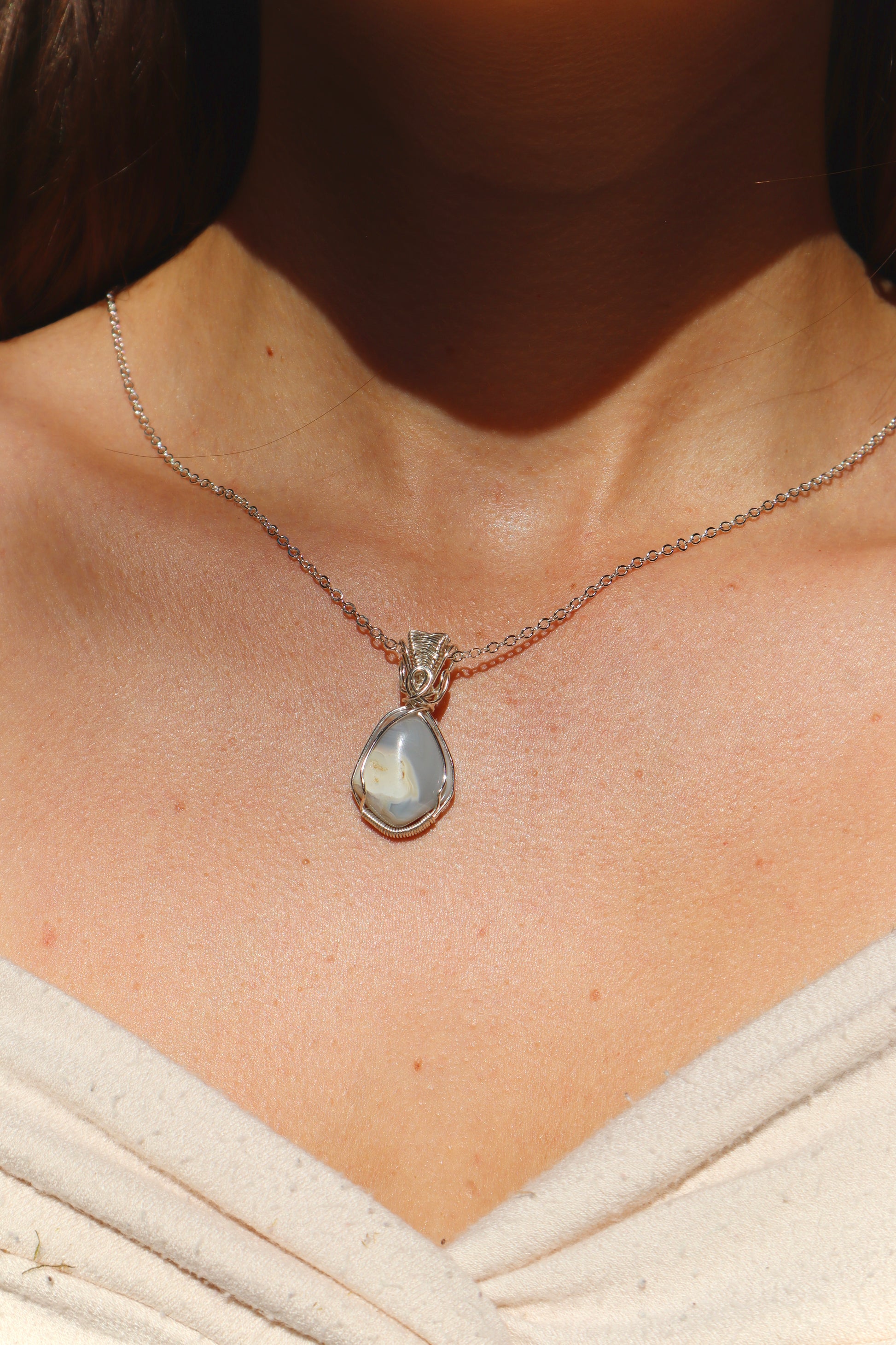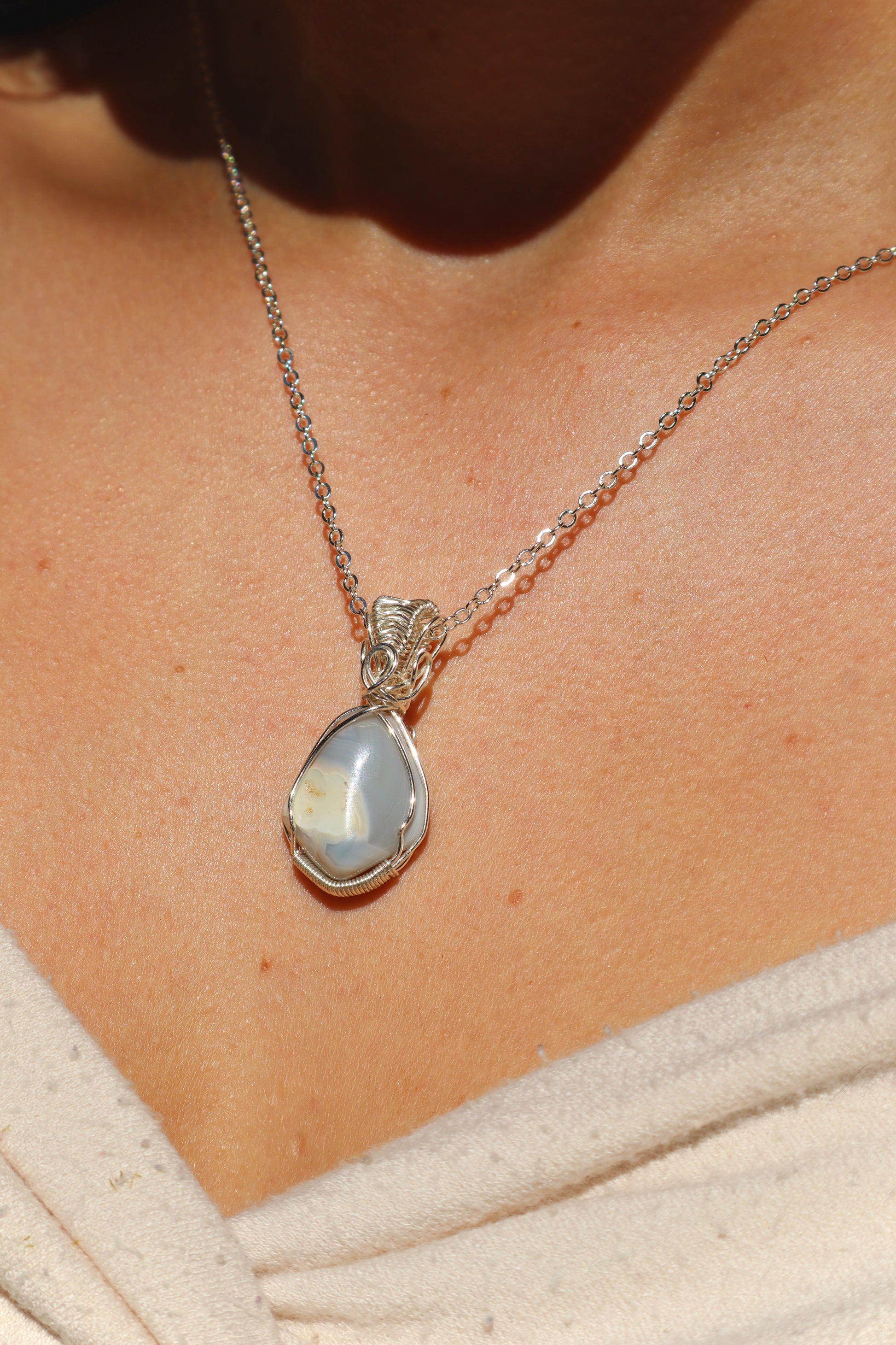 Introducing our Blue Lace Botswana Agate Pendant. This pendant showcases a range of stunning pastel blue colors. Its intricate design is wrapped with tarnish-resistant copper wire, adding a touch of beauty and elegance. Paired with your choice of chain, this pendant is the perfect addition to your collection.