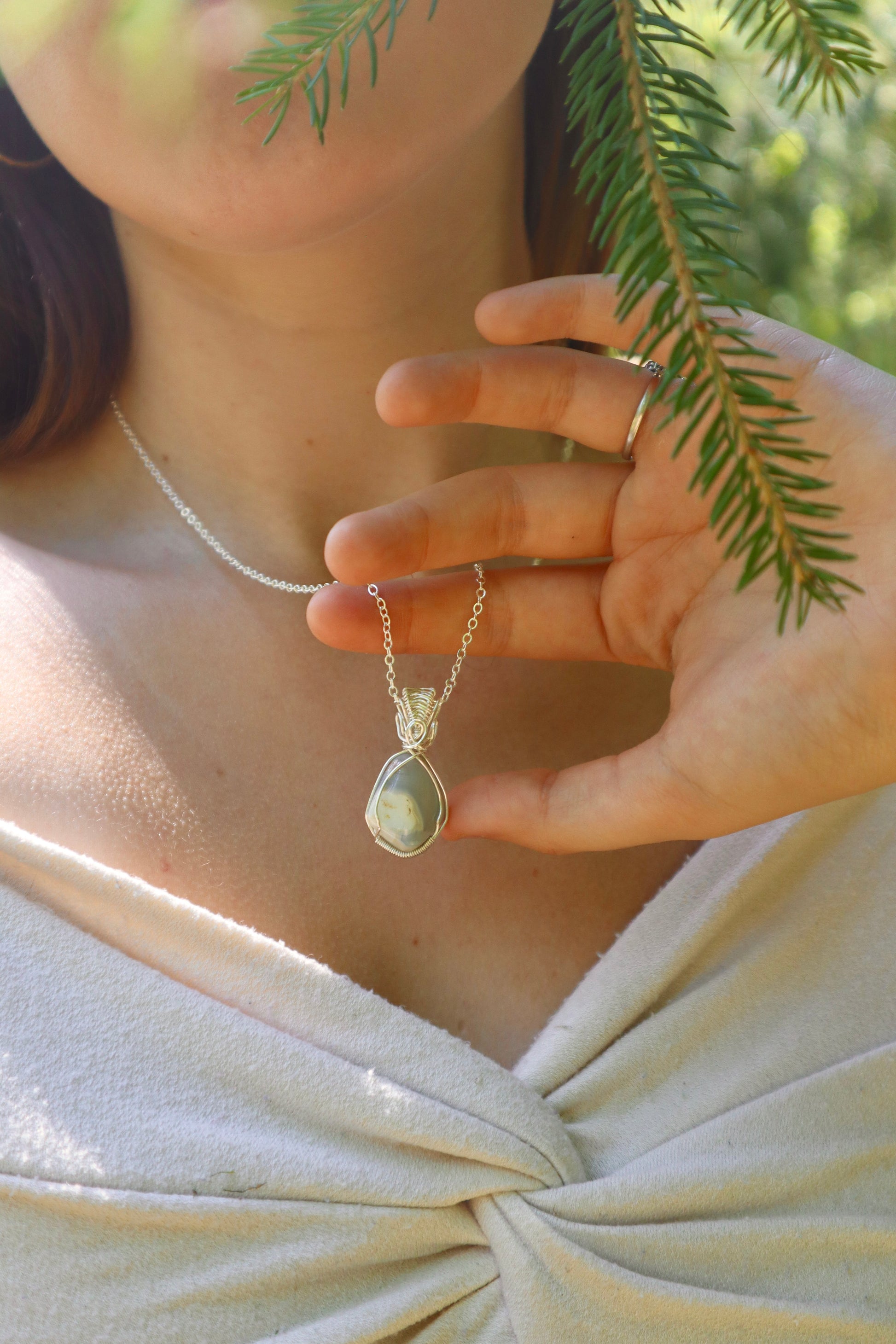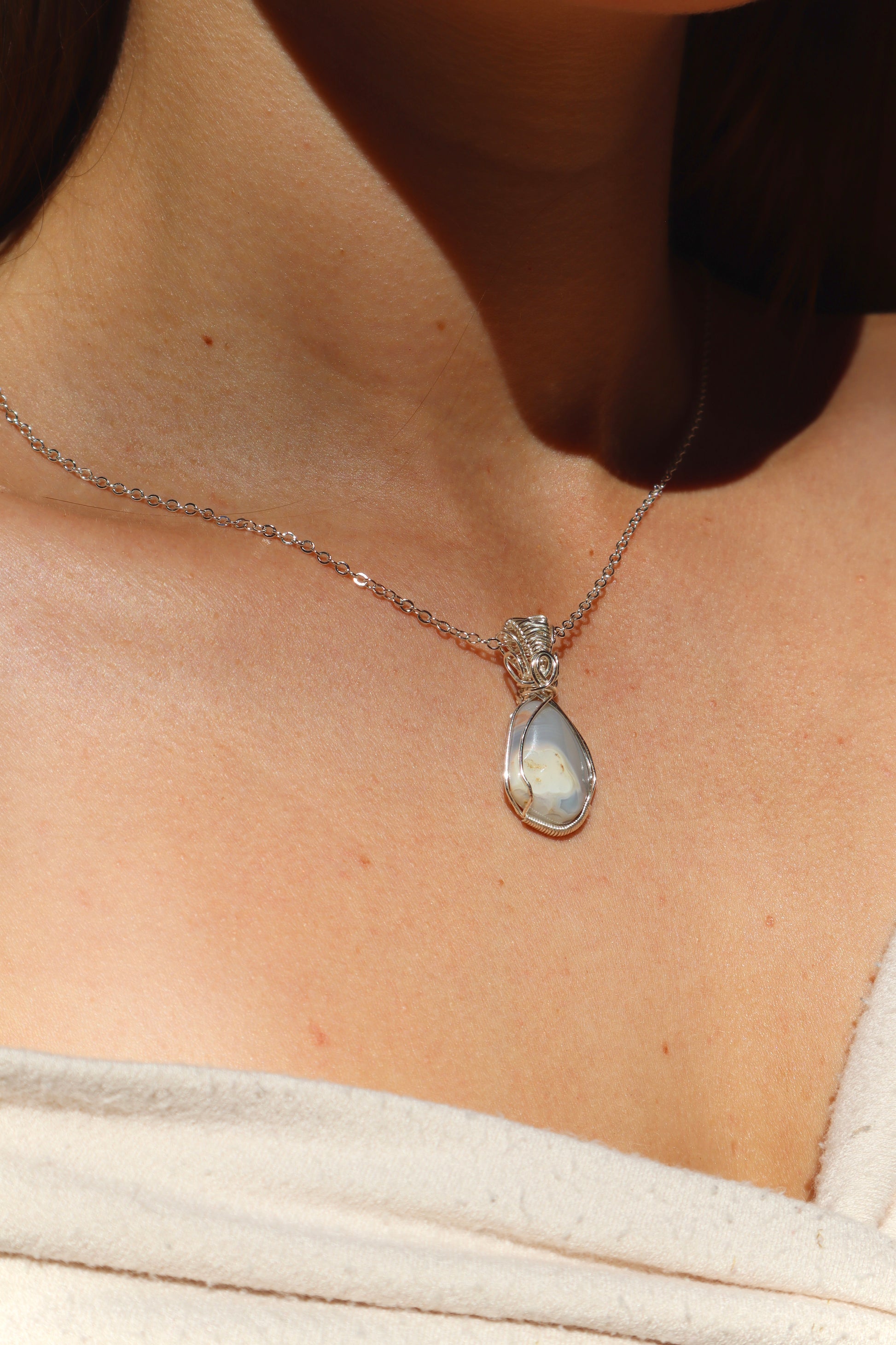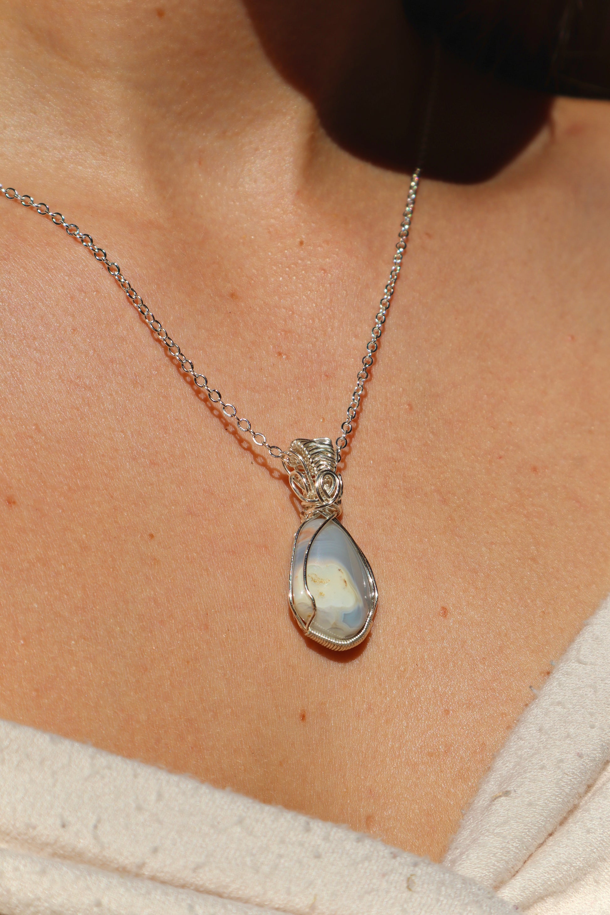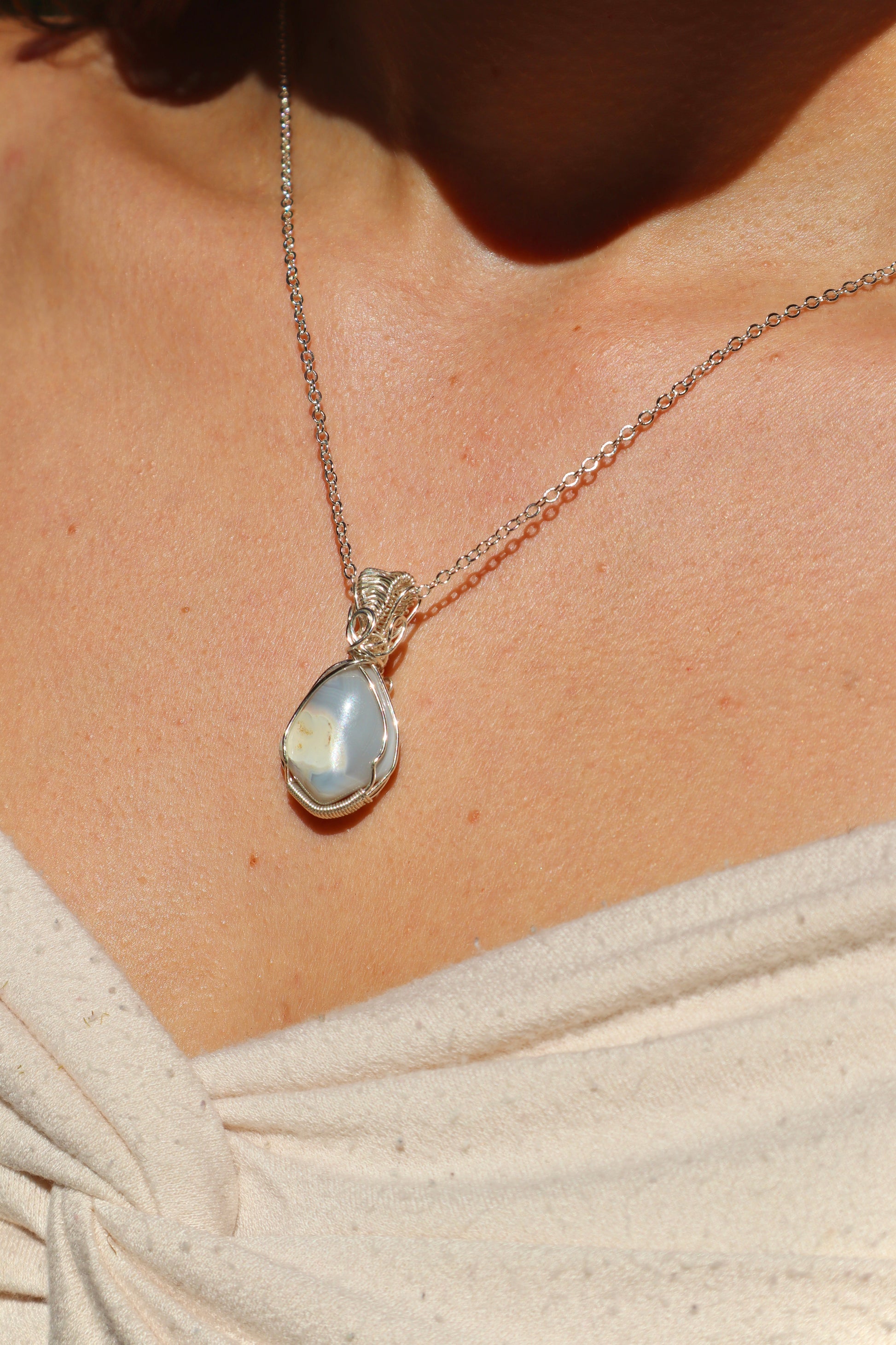 Introducing our Blue Lace Botswana Agate Pendant. This pendant showcases a range of stunning pastel blue colors. Its intricate design is wrapped with tarnish-resistant copper wire, adding a touch of beauty and elegance. Paired with your choice of chain, this pendant is the perfect addition to your collection.