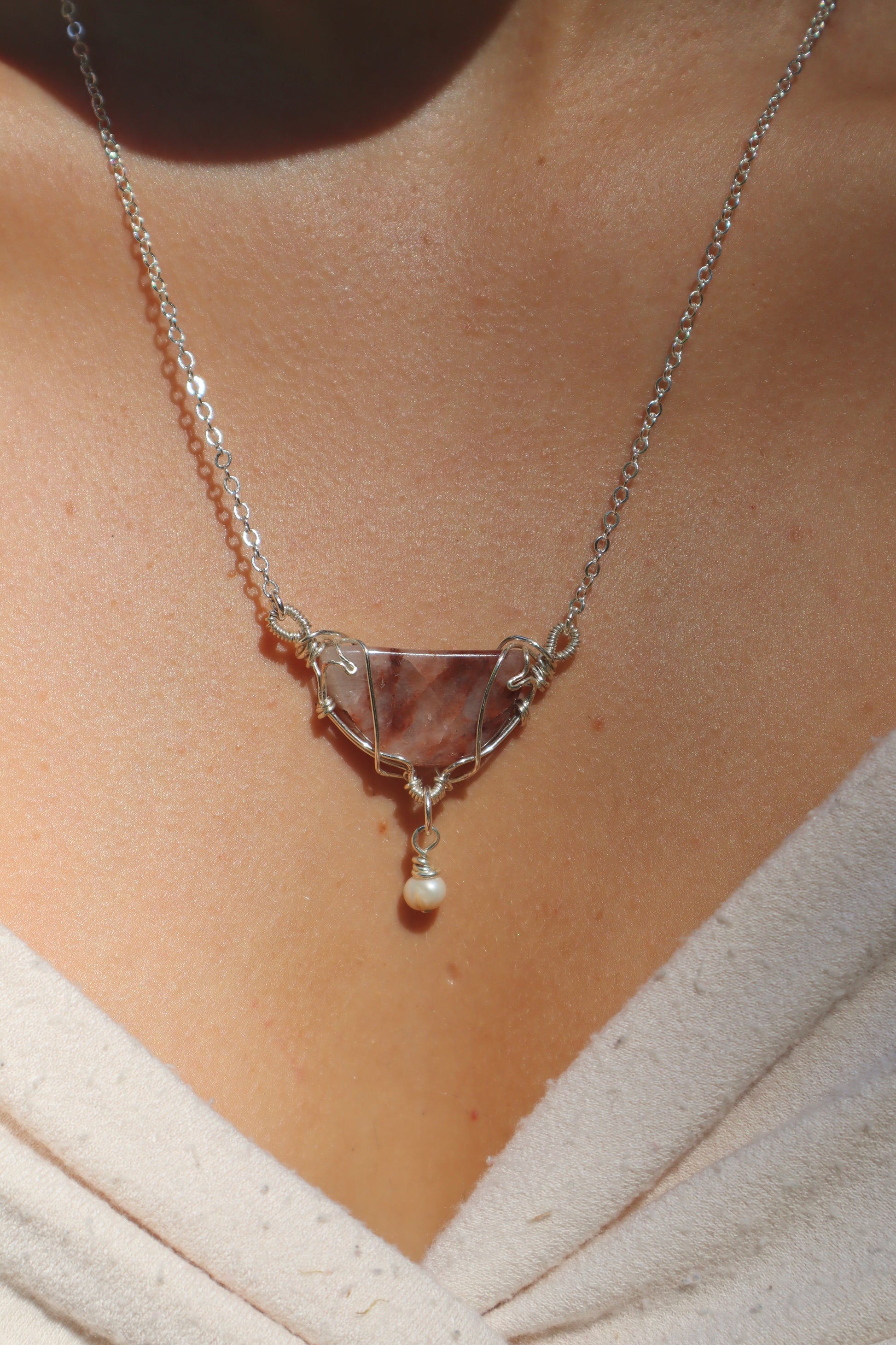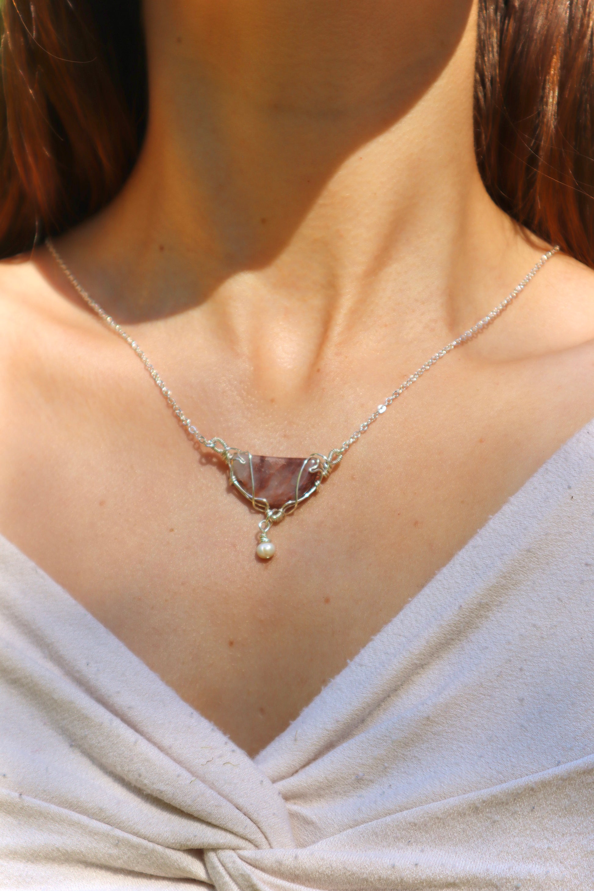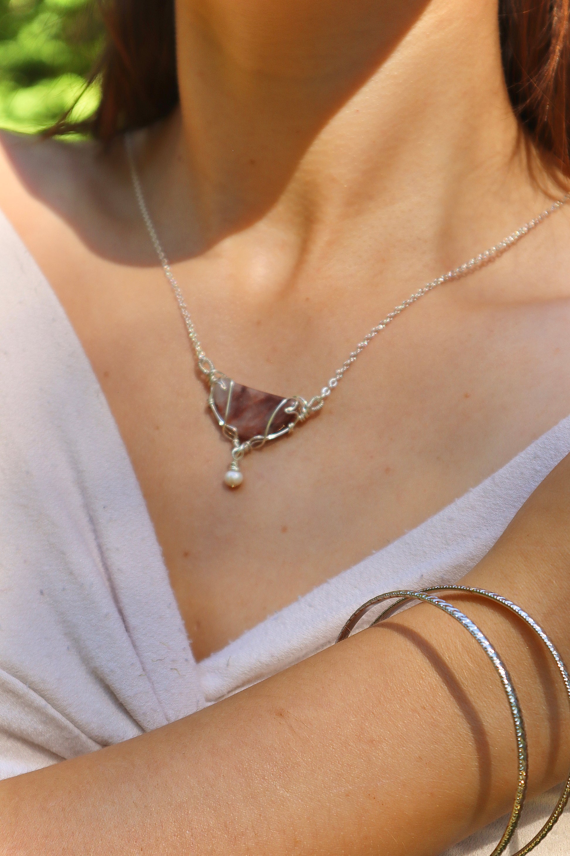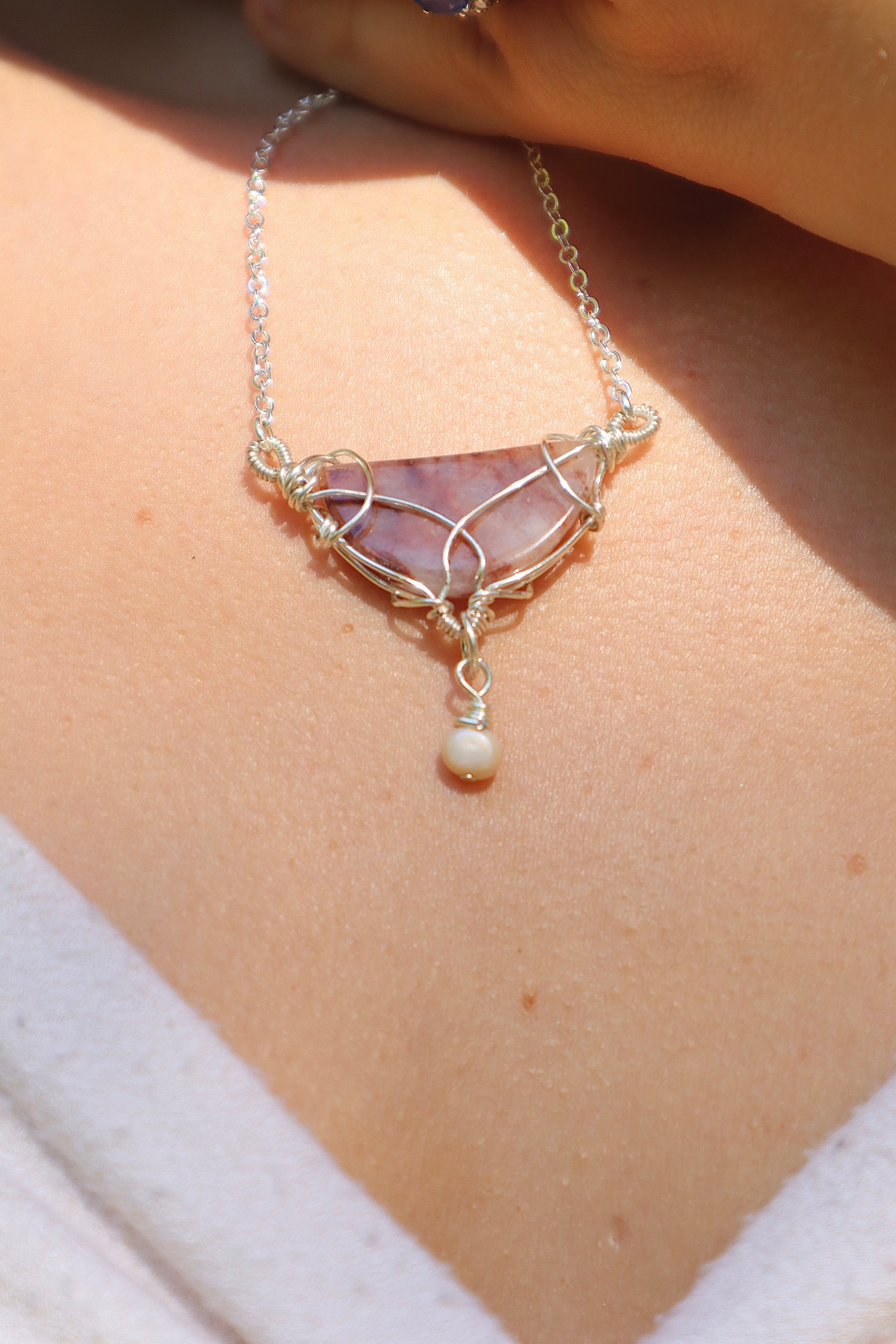 Experience the beauty and uniqueness of our Desert Bloom Agate Pearl Necklace! Made with a natural vibrant sliced agate and a freshwater pearl detail. Intricately wrapped in tarnish-resistant silver wire. The back features a stunning lotus flower wire wrap design. This necklace is made for comfortable wear and crafted for durability-attached to a shiny stainless steel chain.