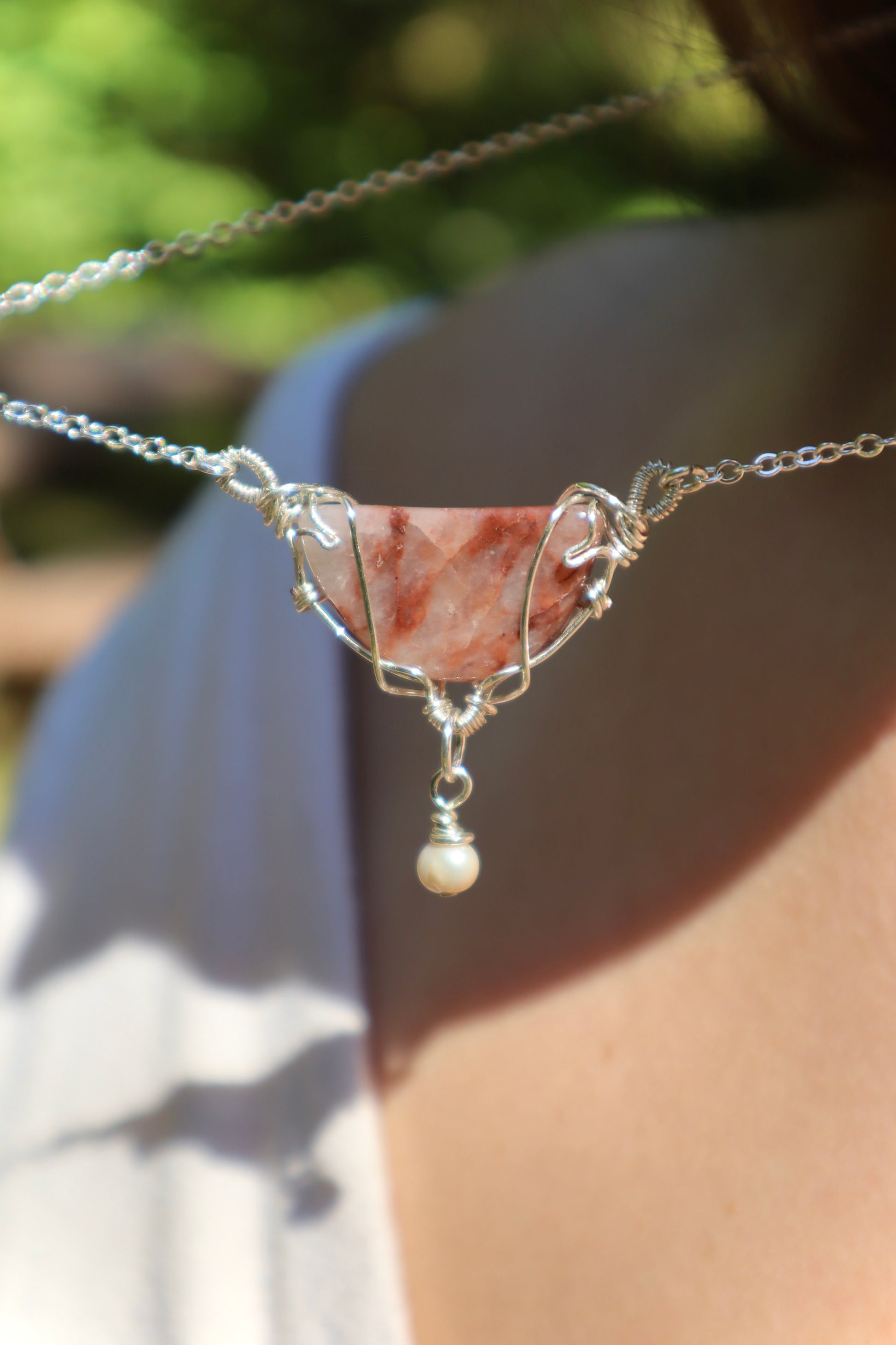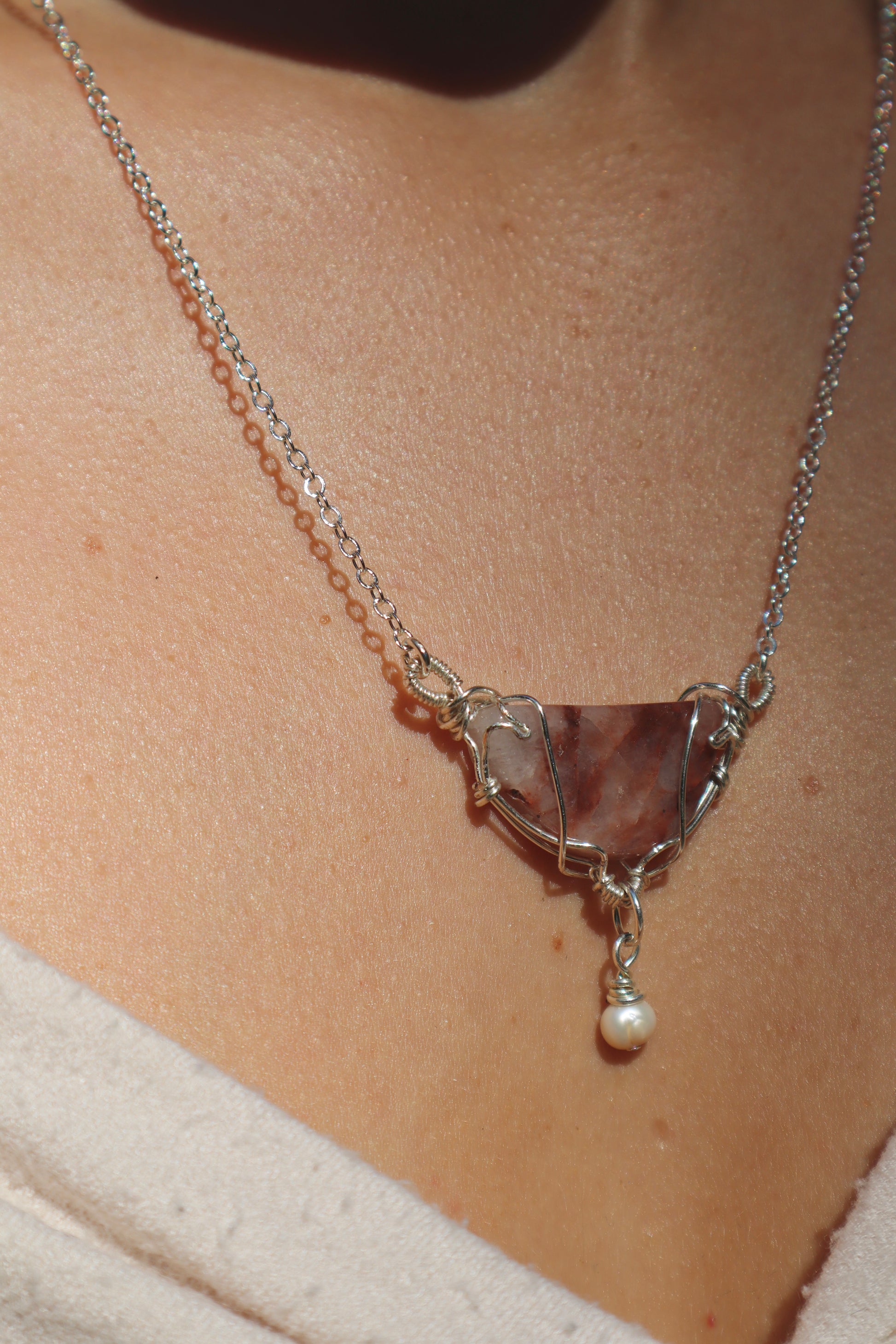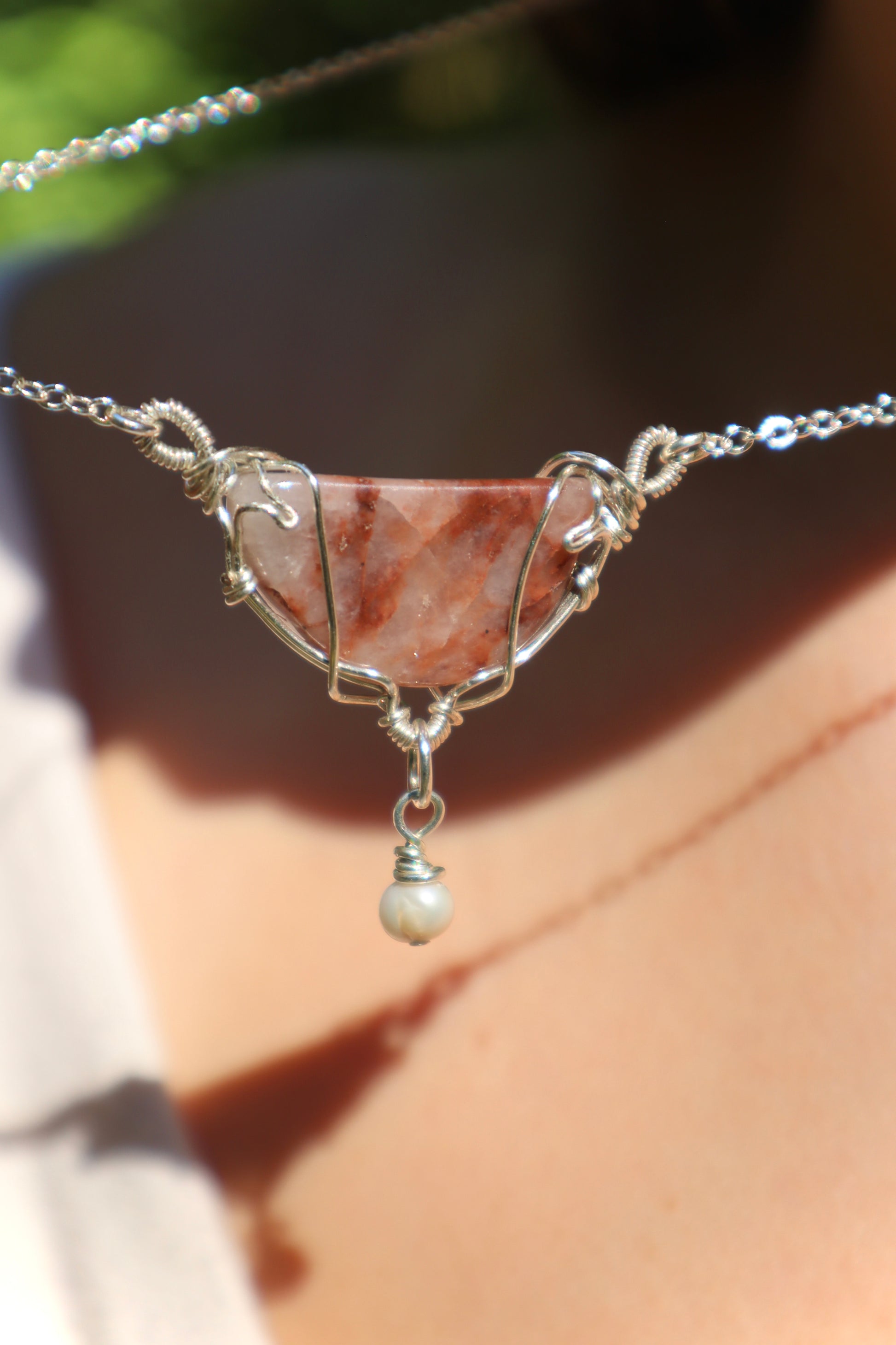 Experience the beauty and uniqueness of our Desert Bloom Agate Pearl Necklace! Made with a natural vibrant sliced agate and a freshwater pearl detail. Intricately wrapped in tarnish-resistant silver wire. The back features a stunning lotus flower wire wrap design. This necklace is made for comfortable wear and crafted for durability-attached to a shiny stainless steel chain.