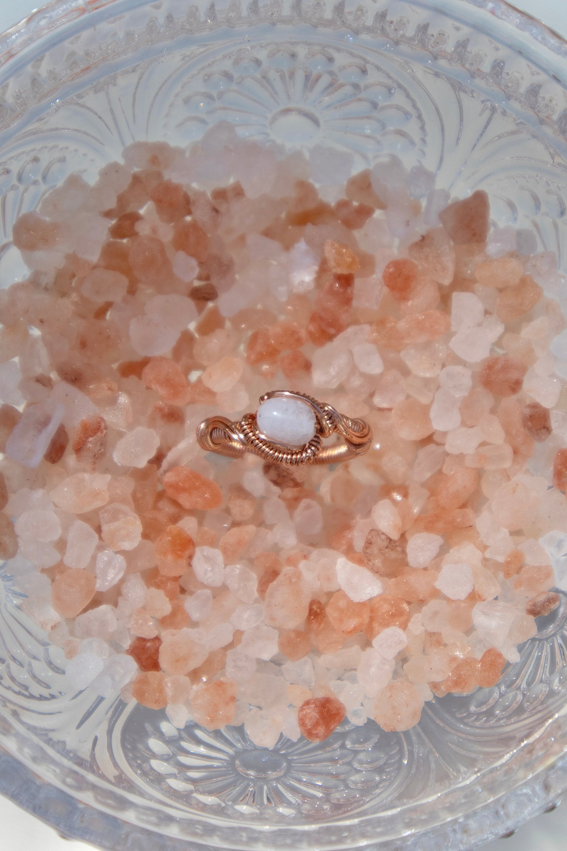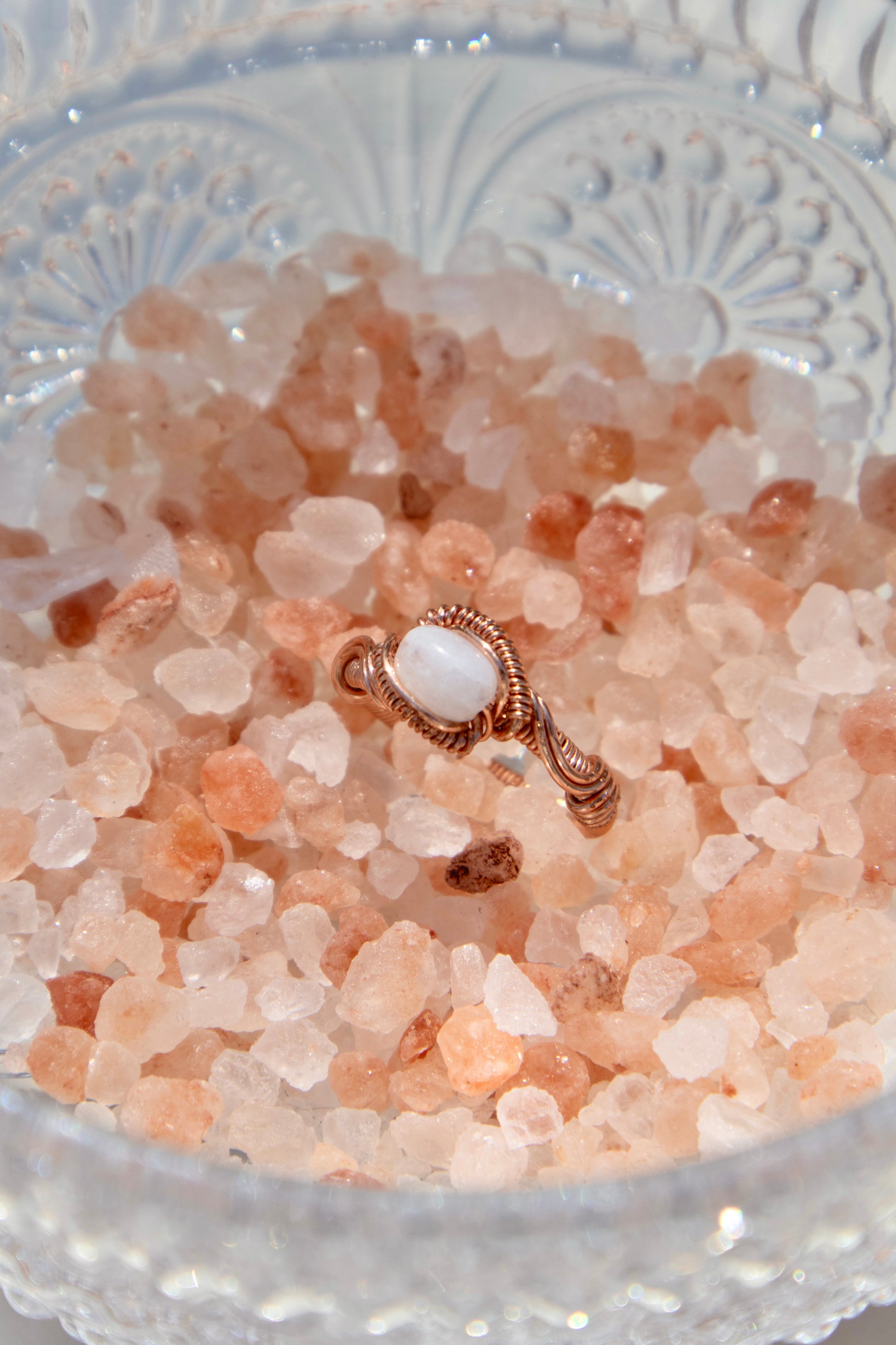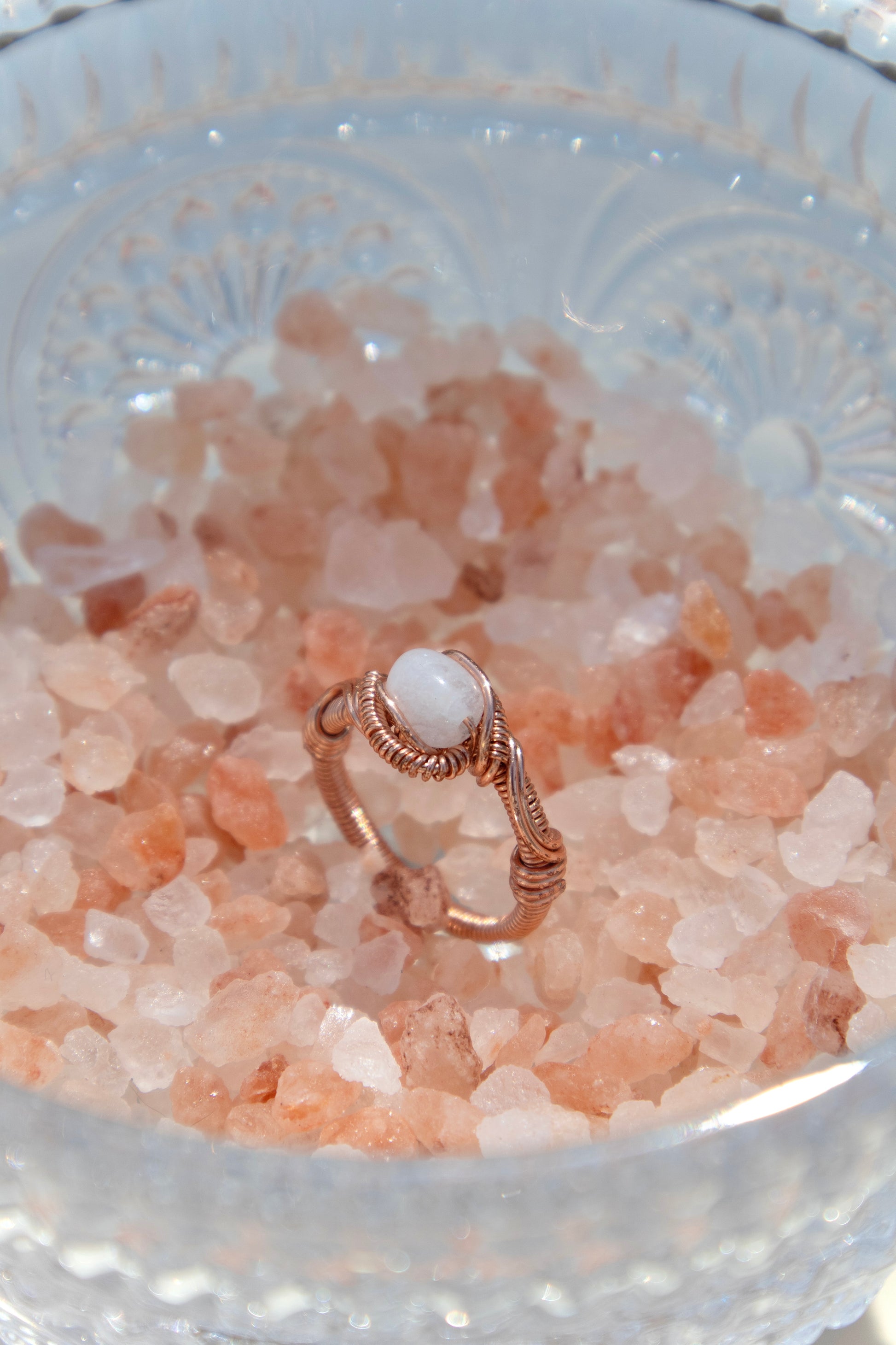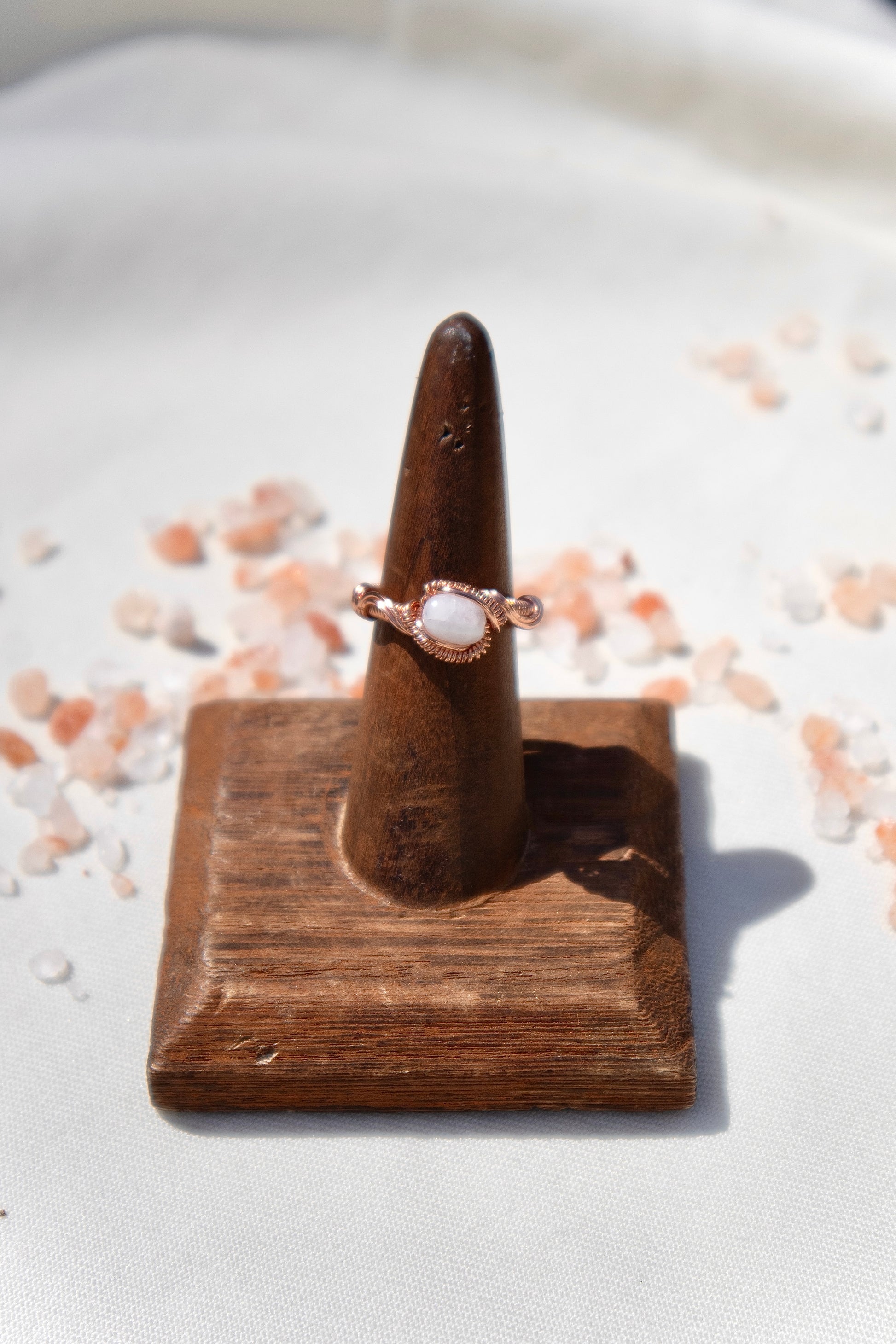 Introducing the mesmerizing beauty of our Iridescent Pearl Copper Intricate Wrapped Ring . Handcrafted with a uniquely shaped Pearl crystal, delicately wrapped in tarnish-resistant copper wire. This ring features a stunning rose gold accent that will maintain its color over time. Lightweight and comfortable this ring will add a touch of elegance to your everyday wear.