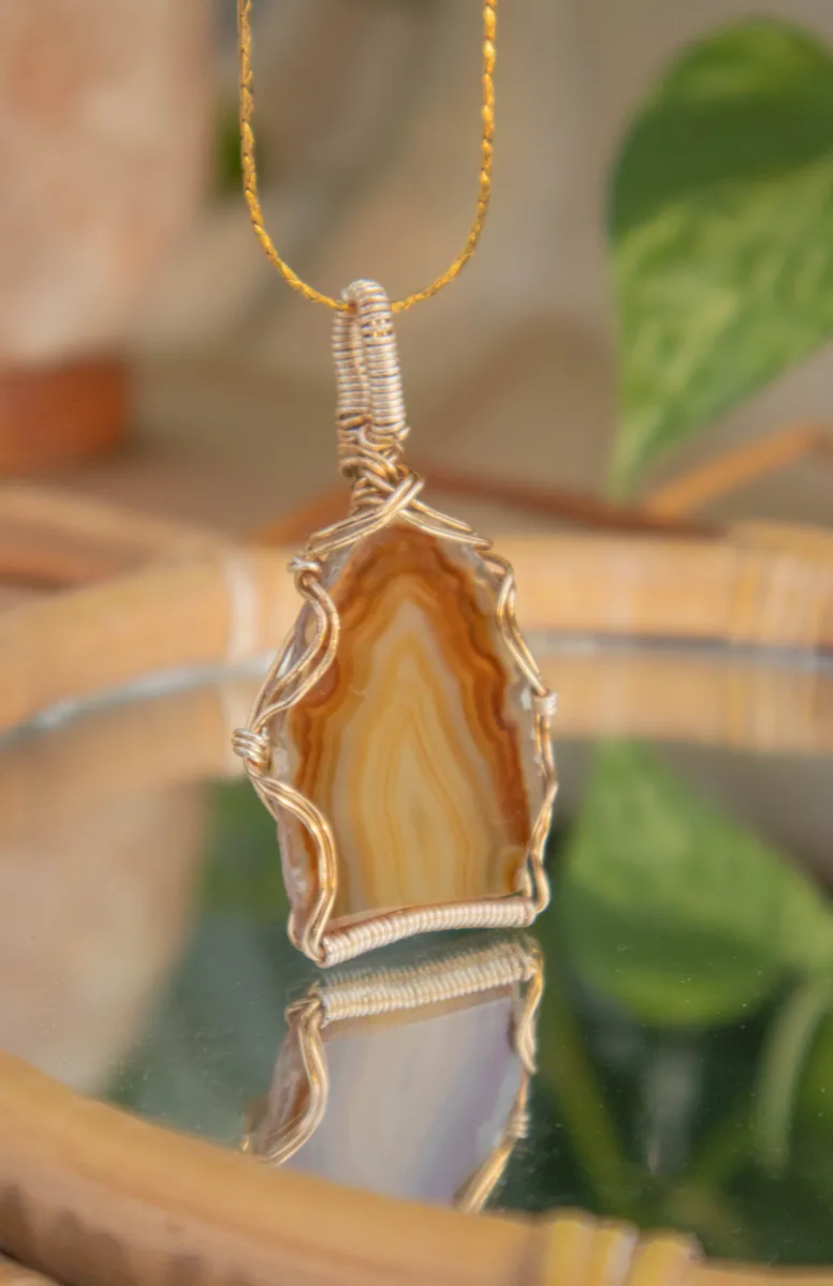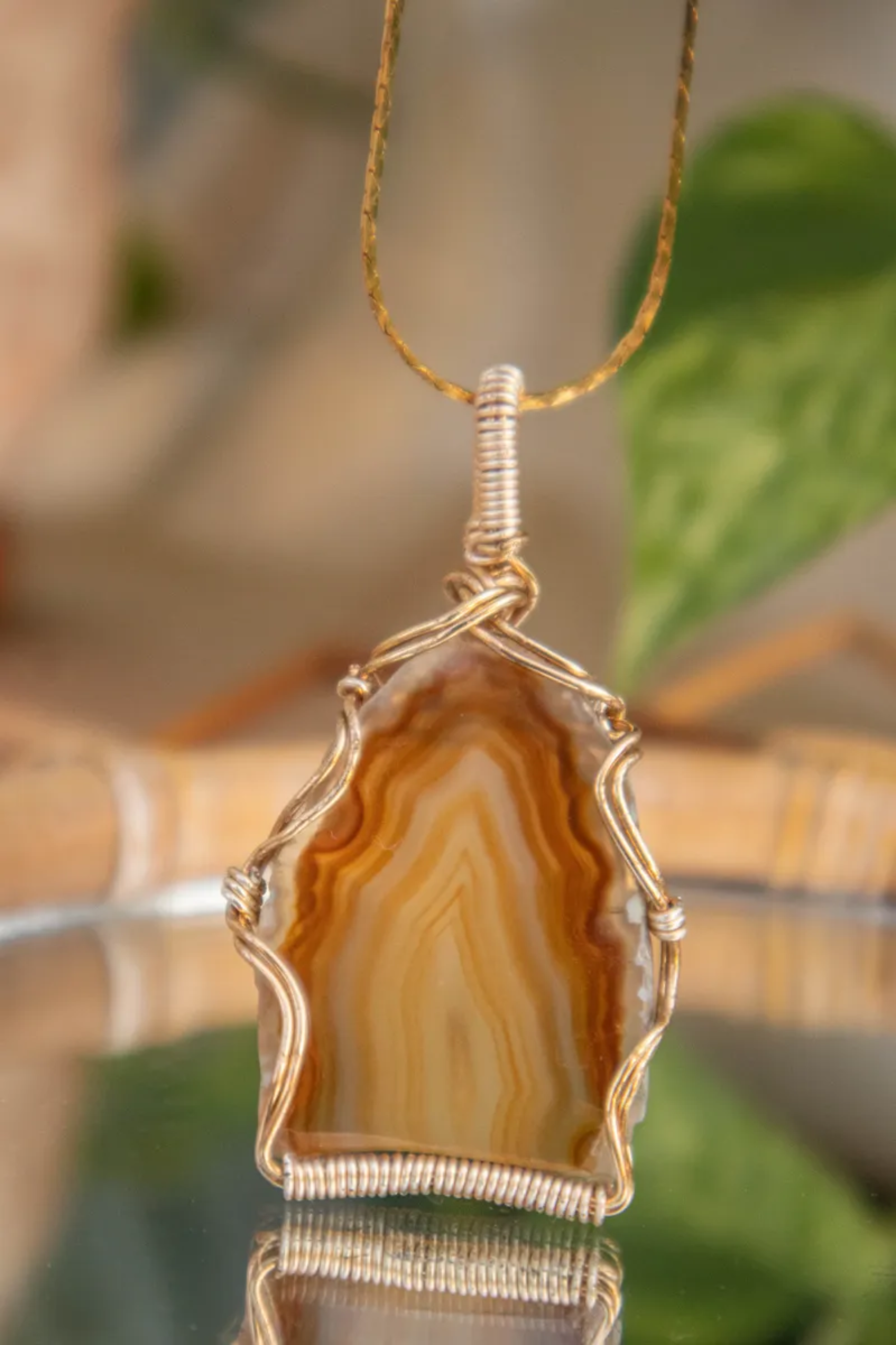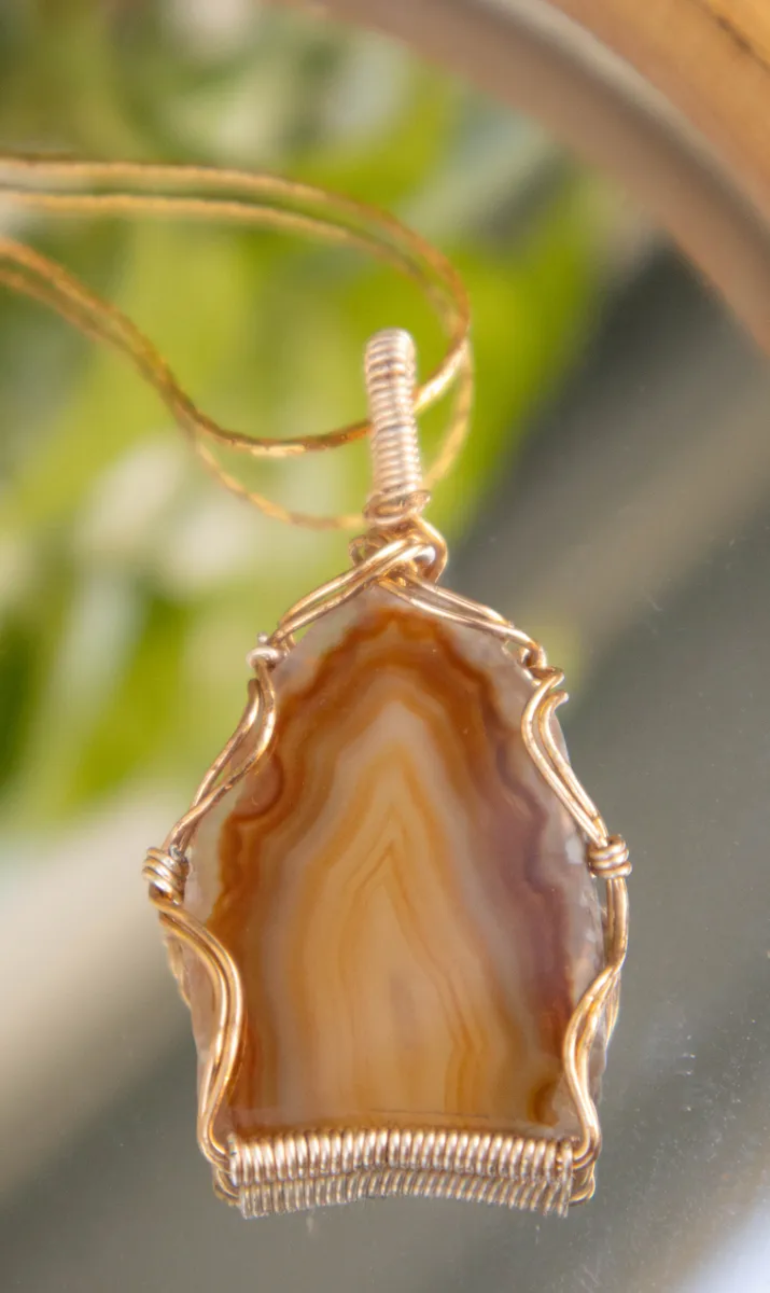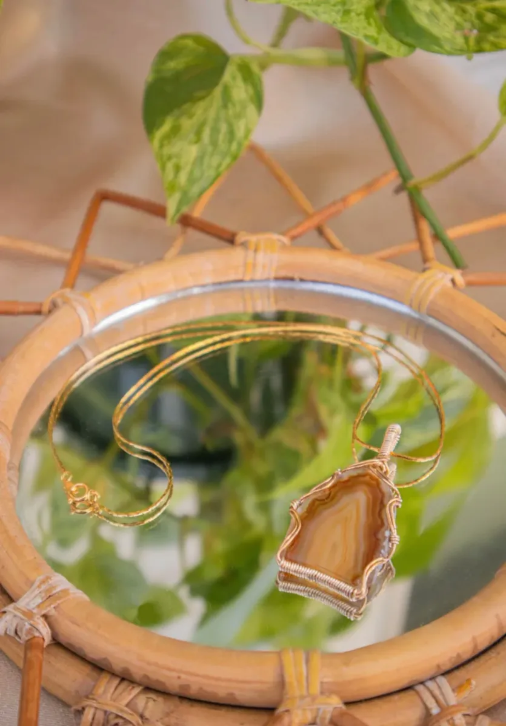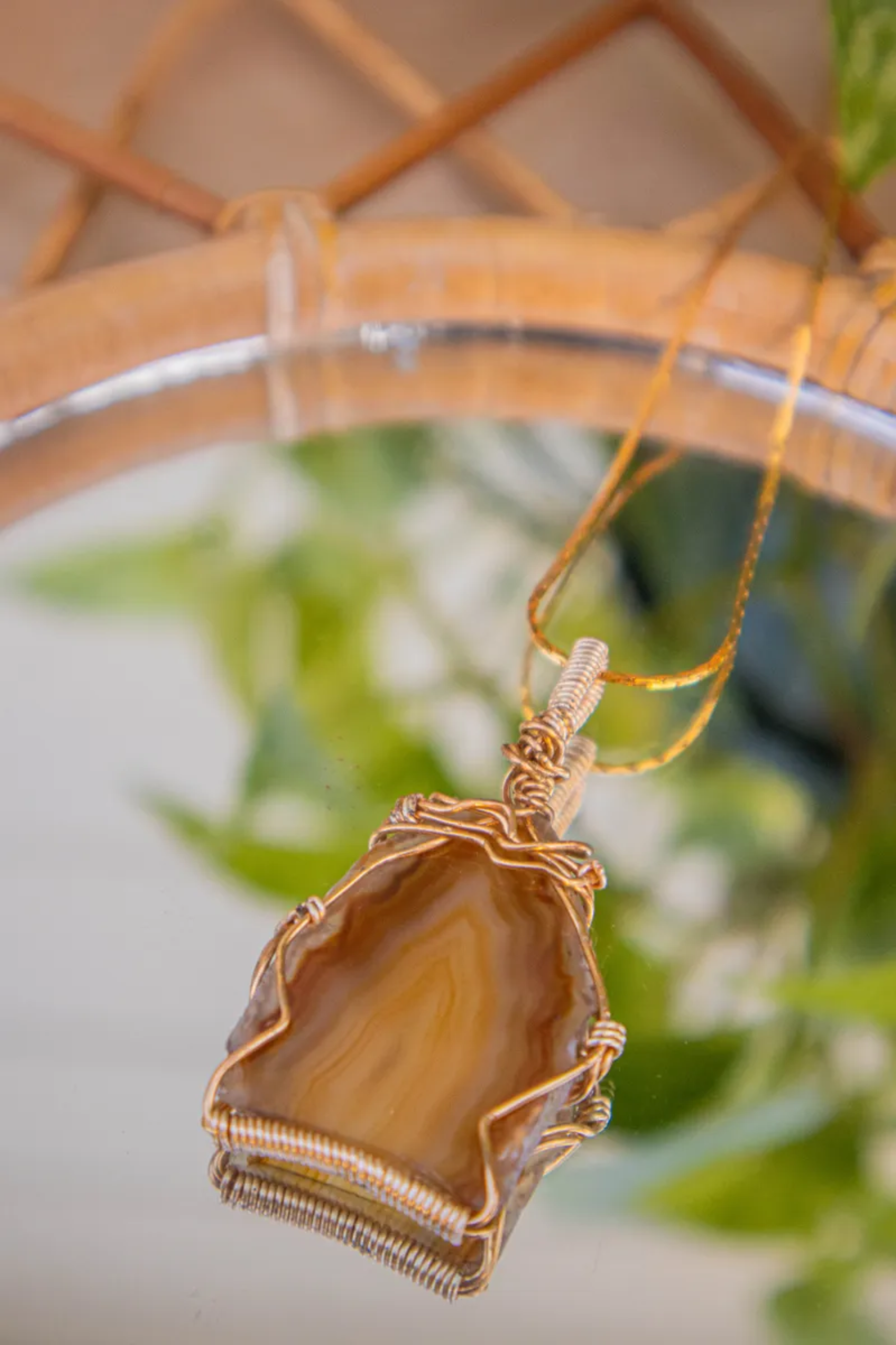 Introducing the Natural Agate Pendant. This stunning necklace features a warm tone agate gemstone beautifully wire wrapped and hanging from a gold chain. ✨Embrace nature's beauty with this captivating piece of jewelry.