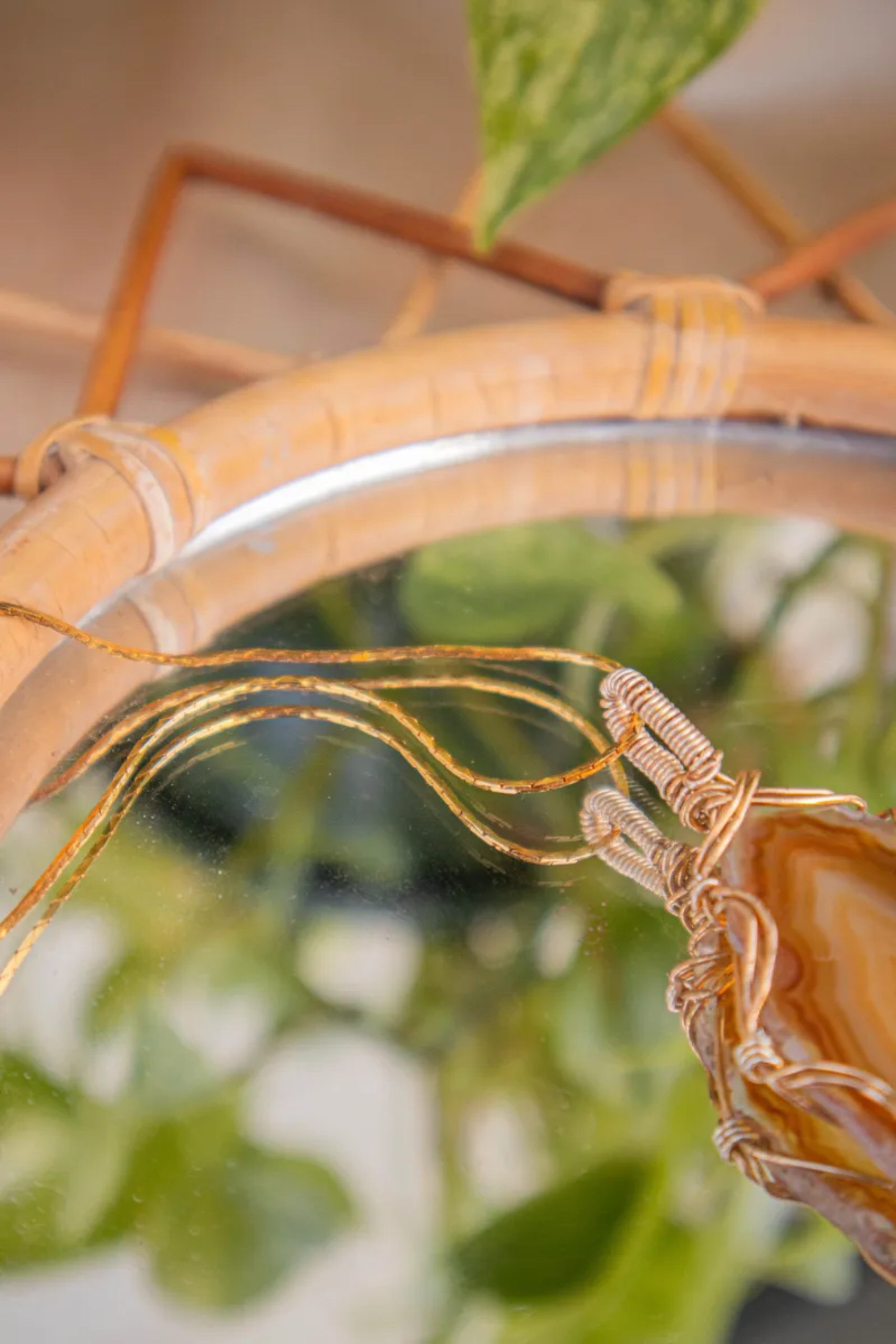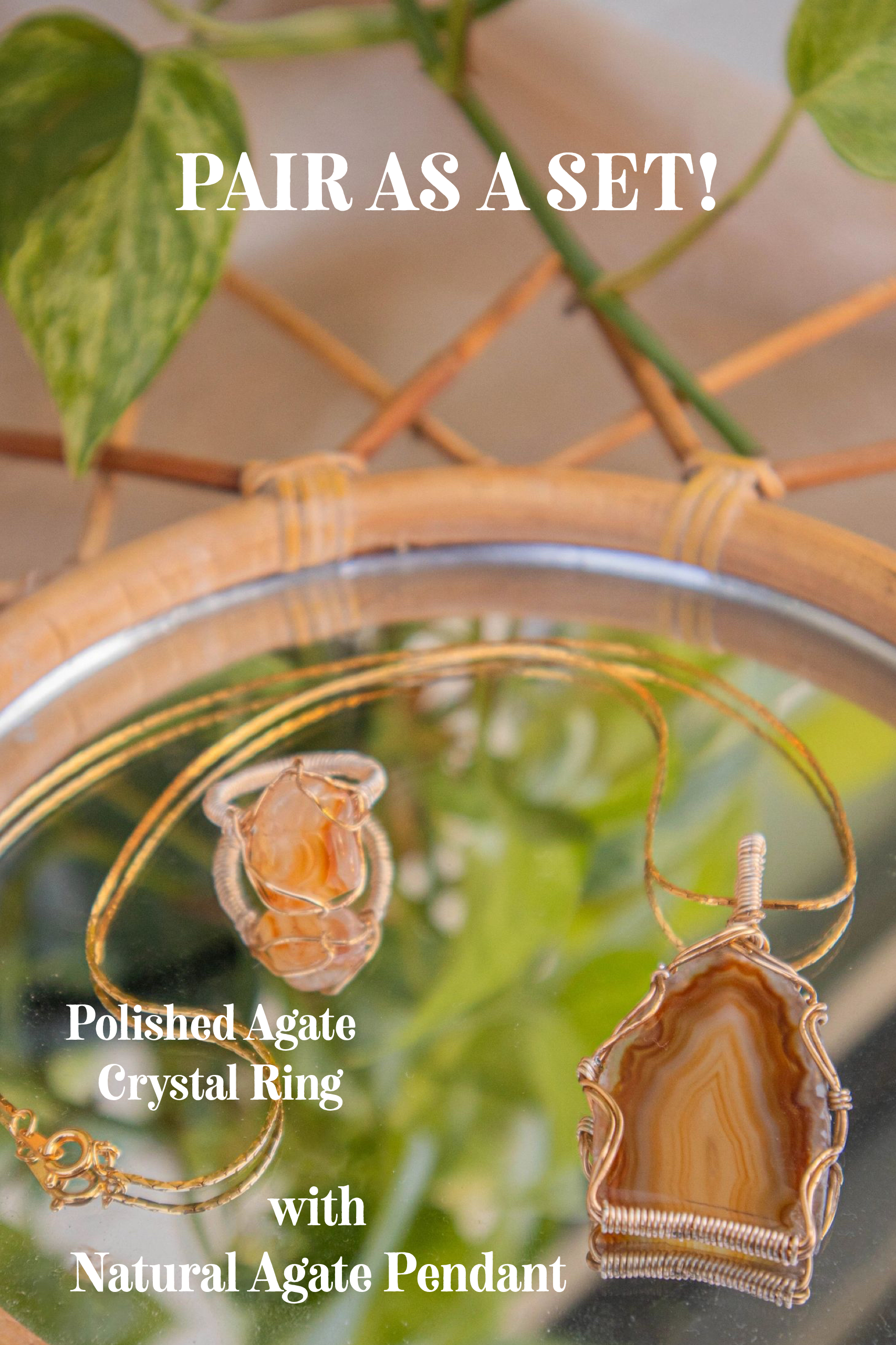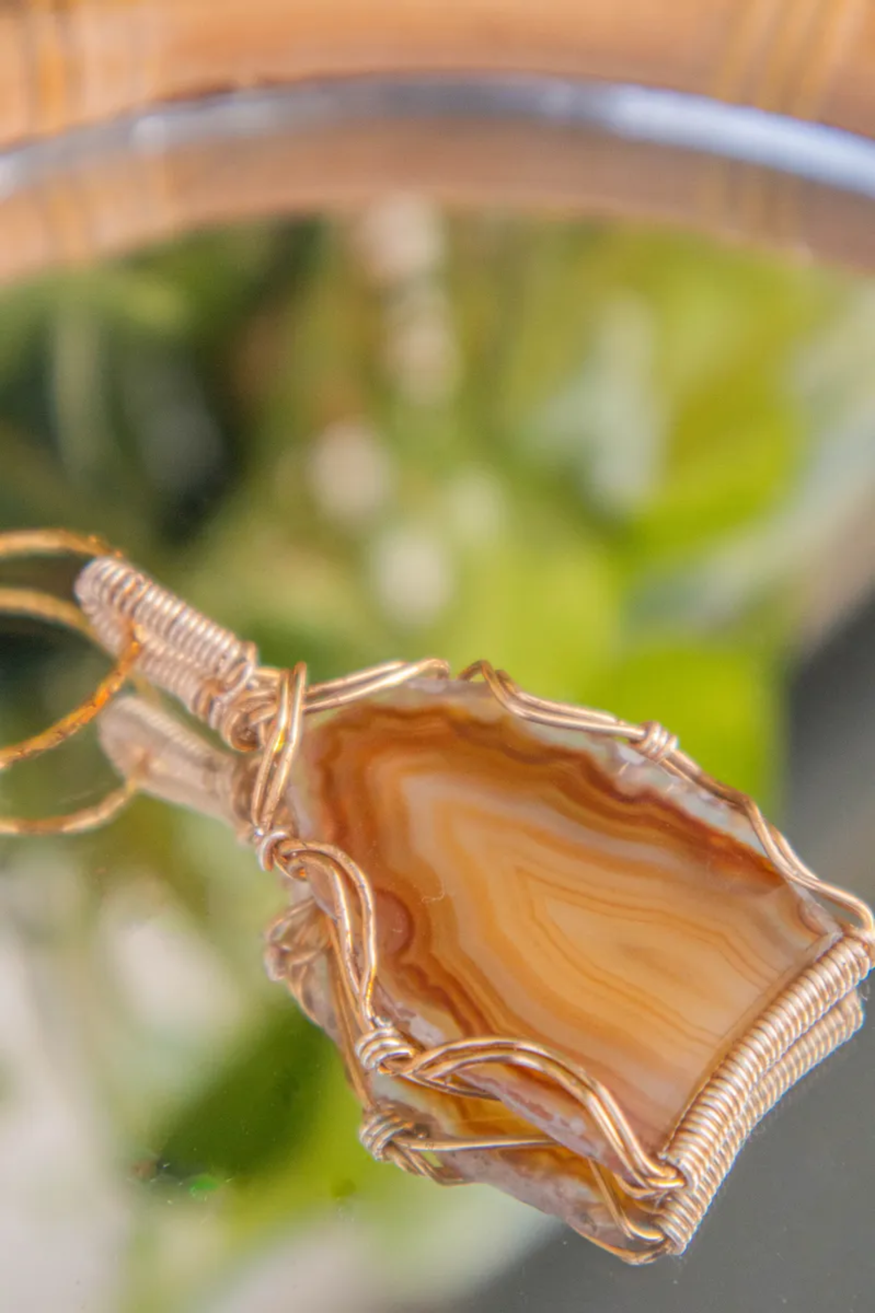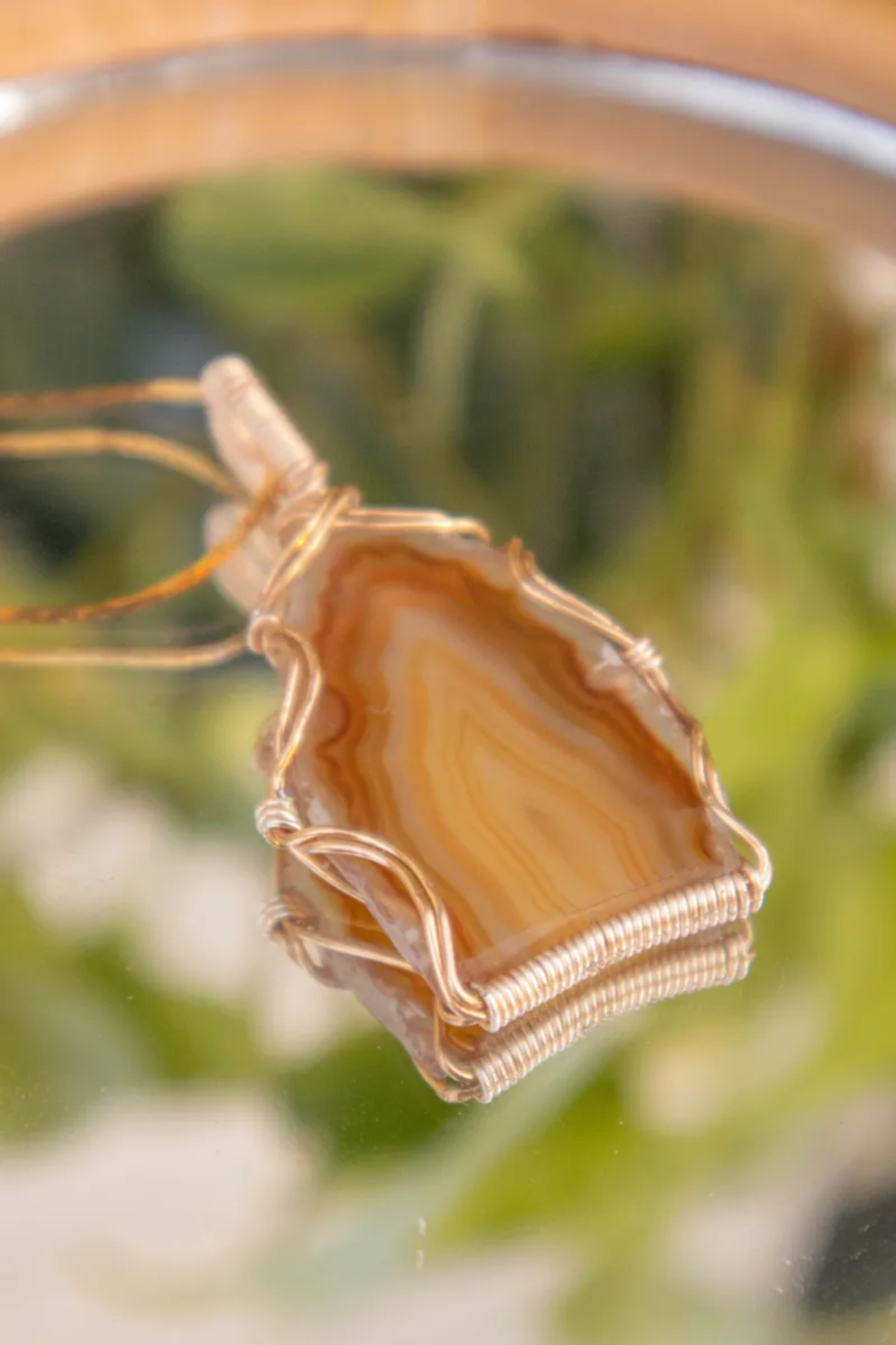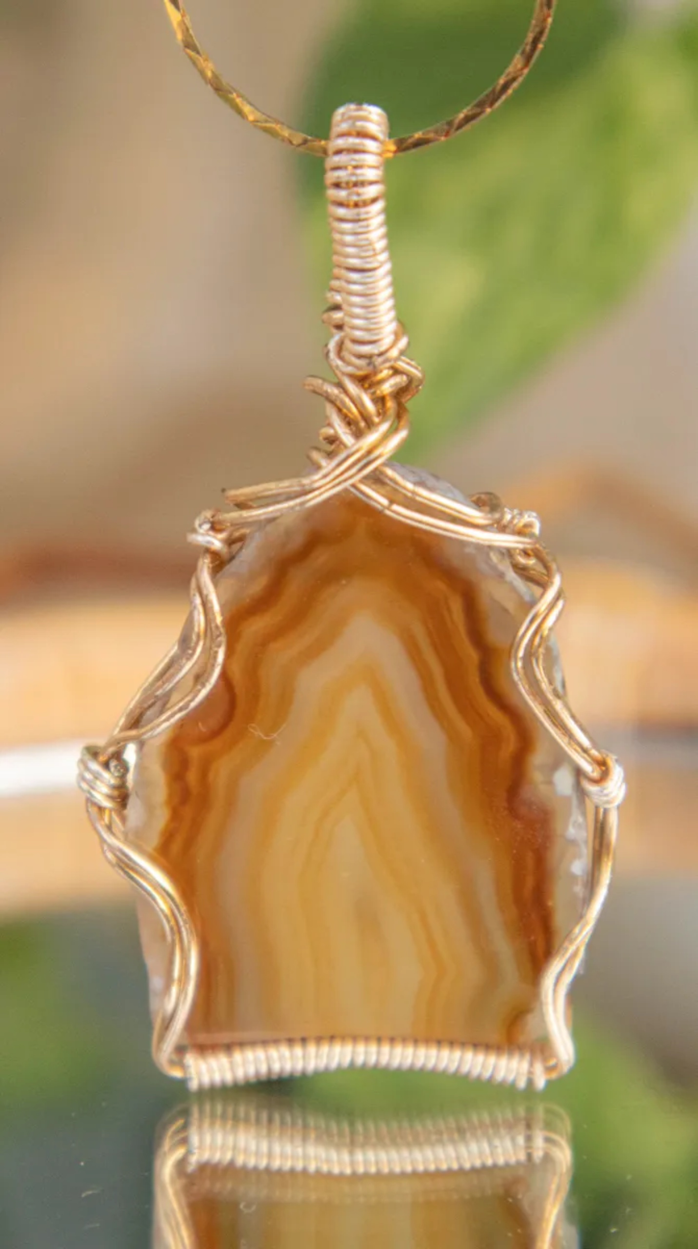 Introducing the Natural Agate Pendant. This stunning necklace features a warm tone agate gemstone beautifully wire wrapped and hanging from a gold chain. ✨Embrace nature's beauty with this captivating piece of jewelry.