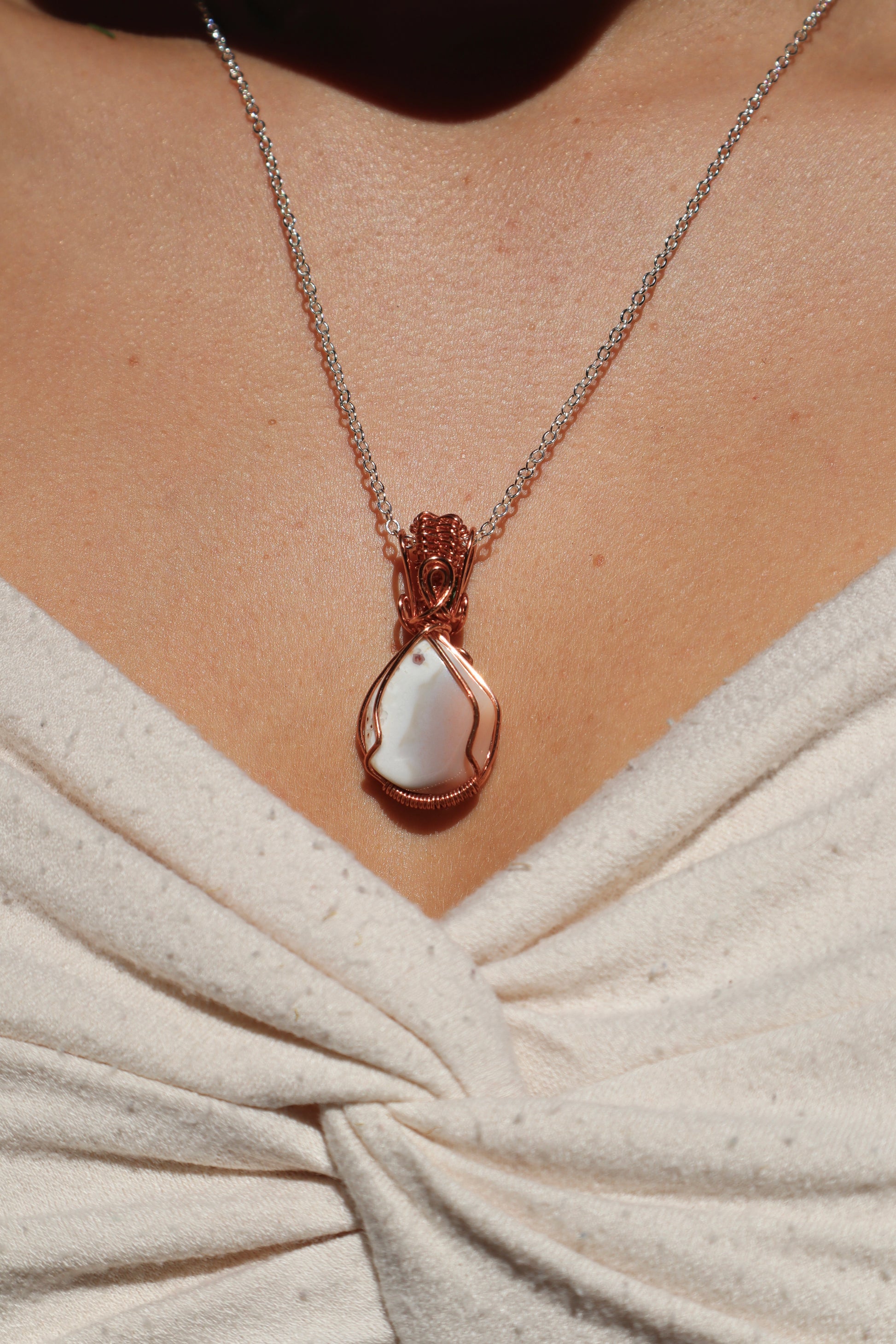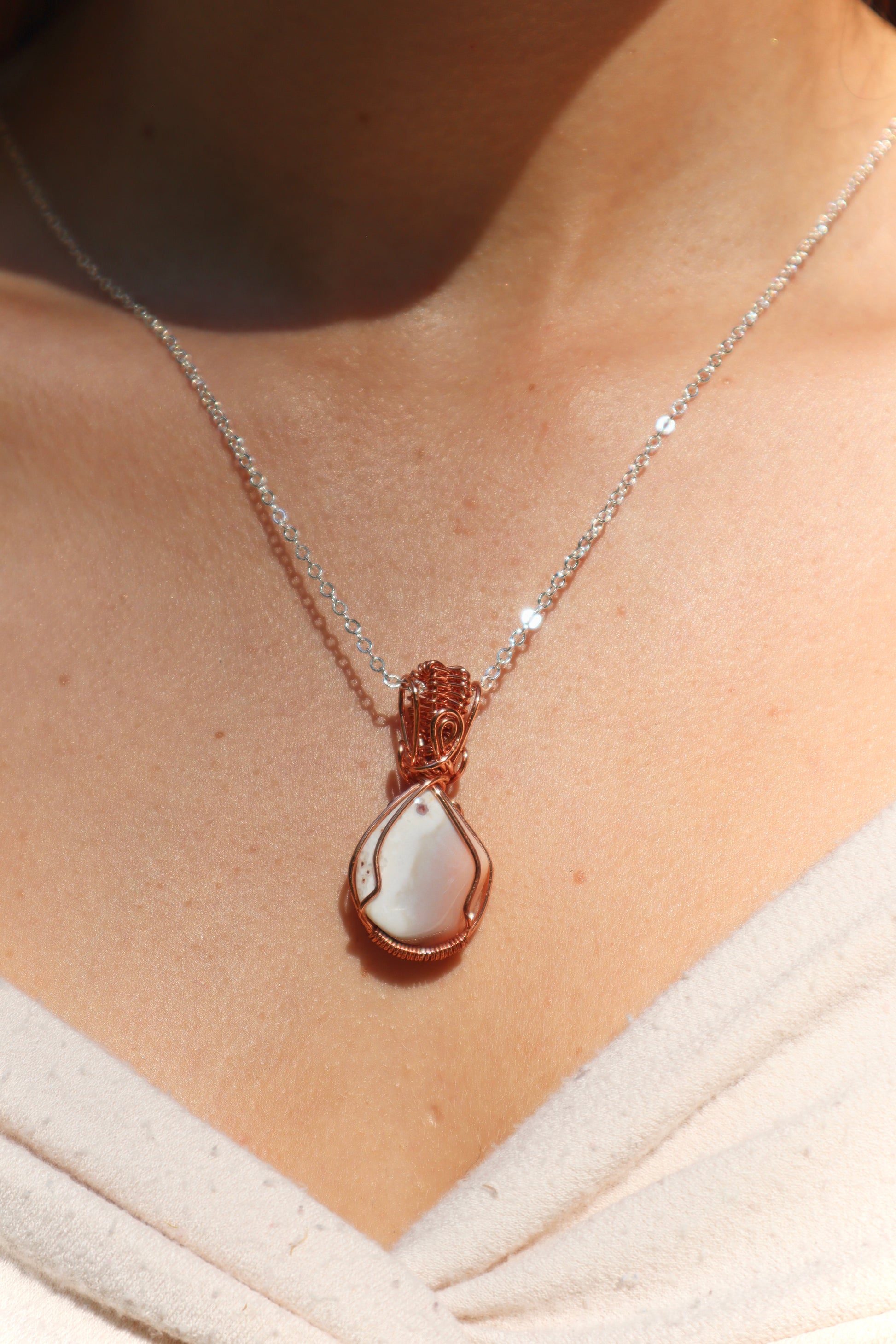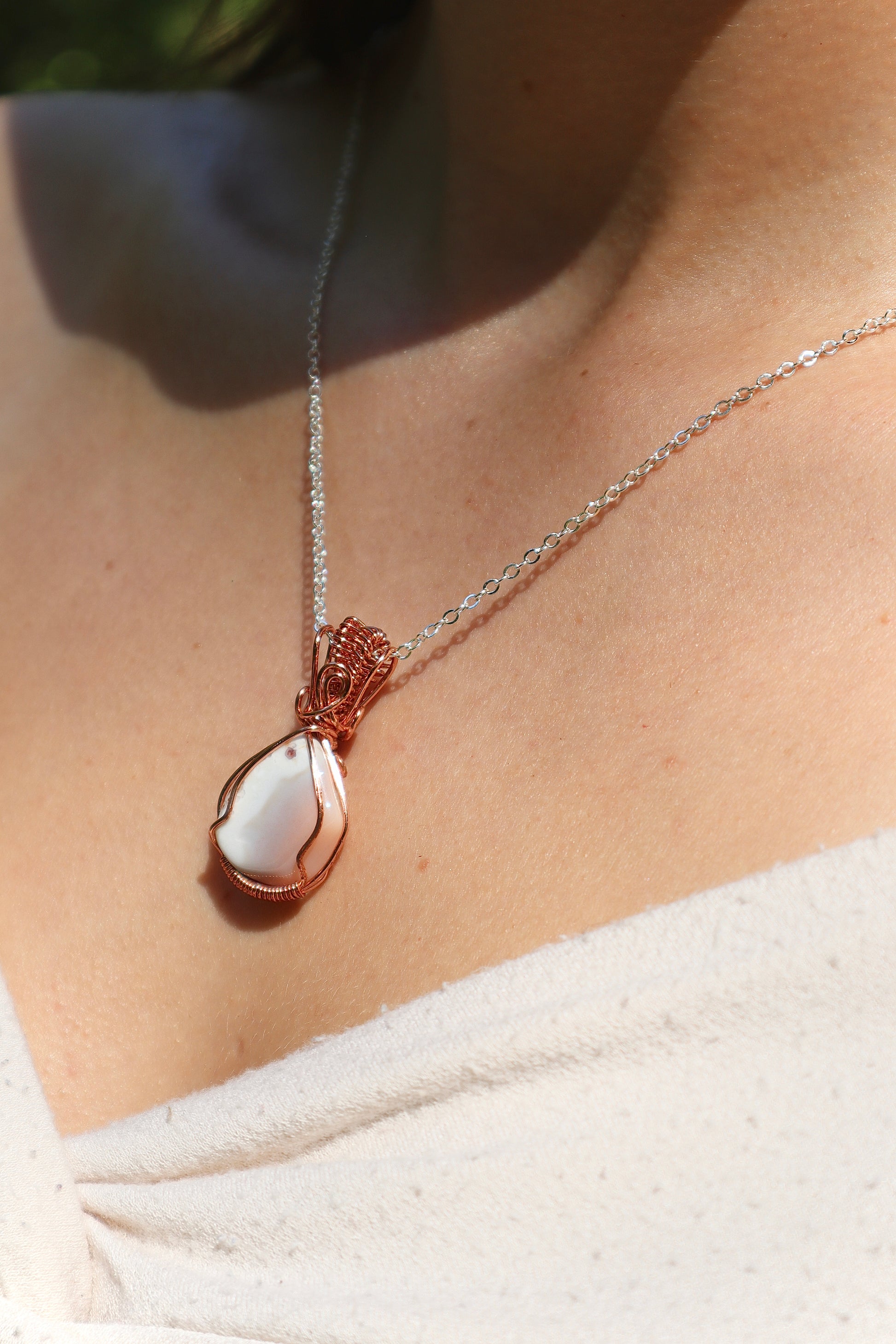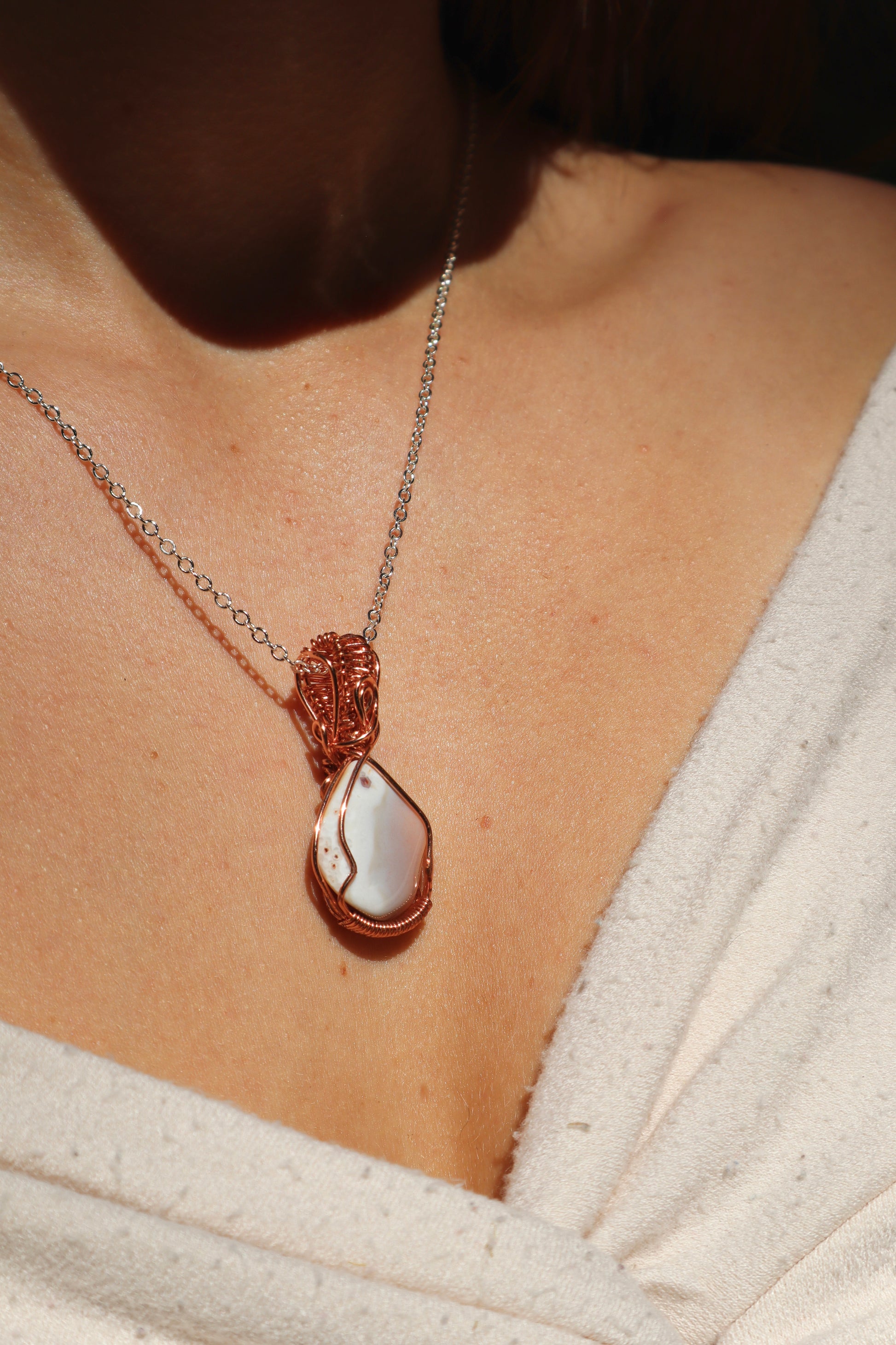 Introducing our Pink Botswana Agate Pendant. This pendant showcases a range of stunning pastel pink colors. Its intricate design is wrapped with tarnish-resistant copper wire, adding a touch of beauty and elegance. Paired with your choice of chain, this pendant is the perfect addition to your collection.