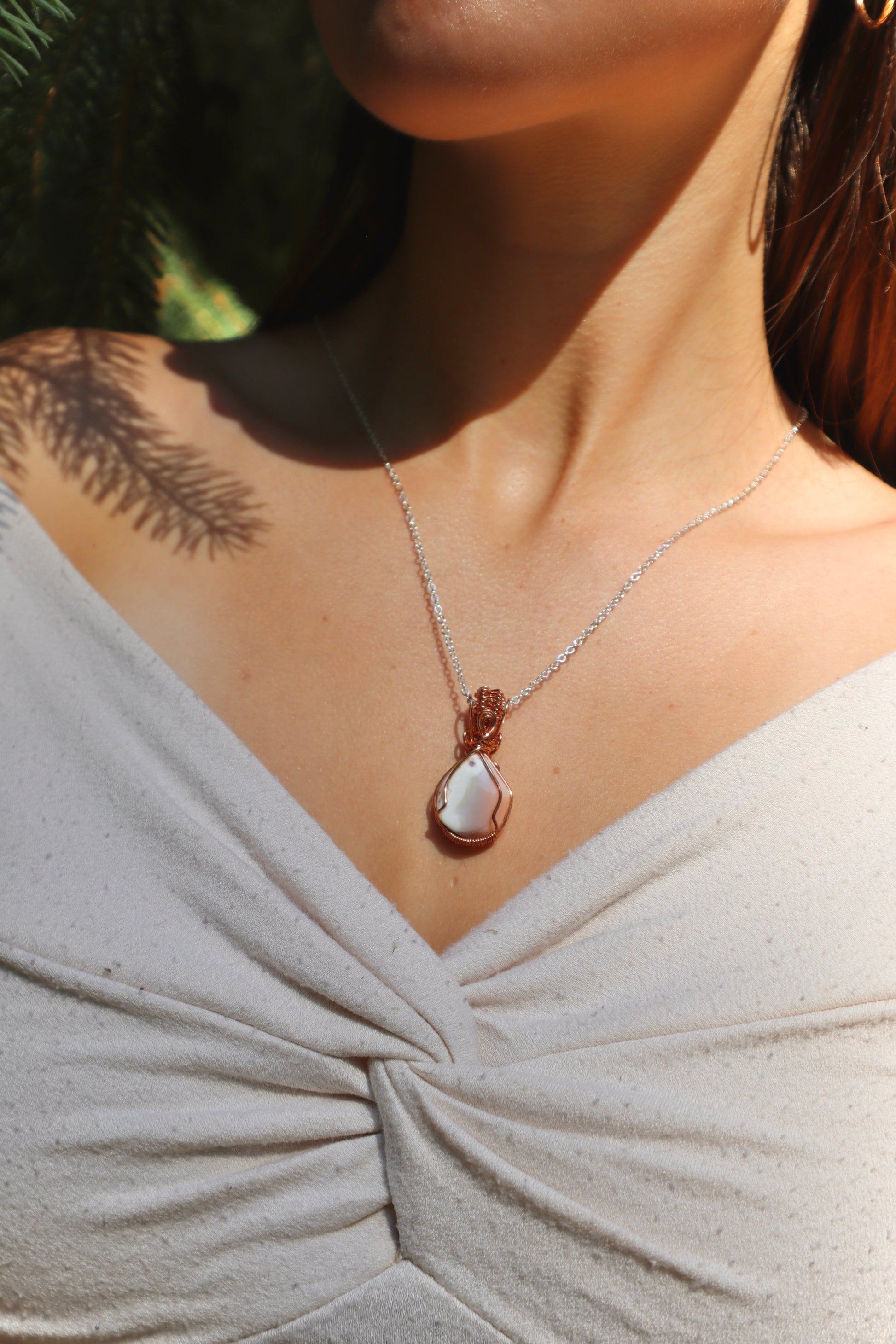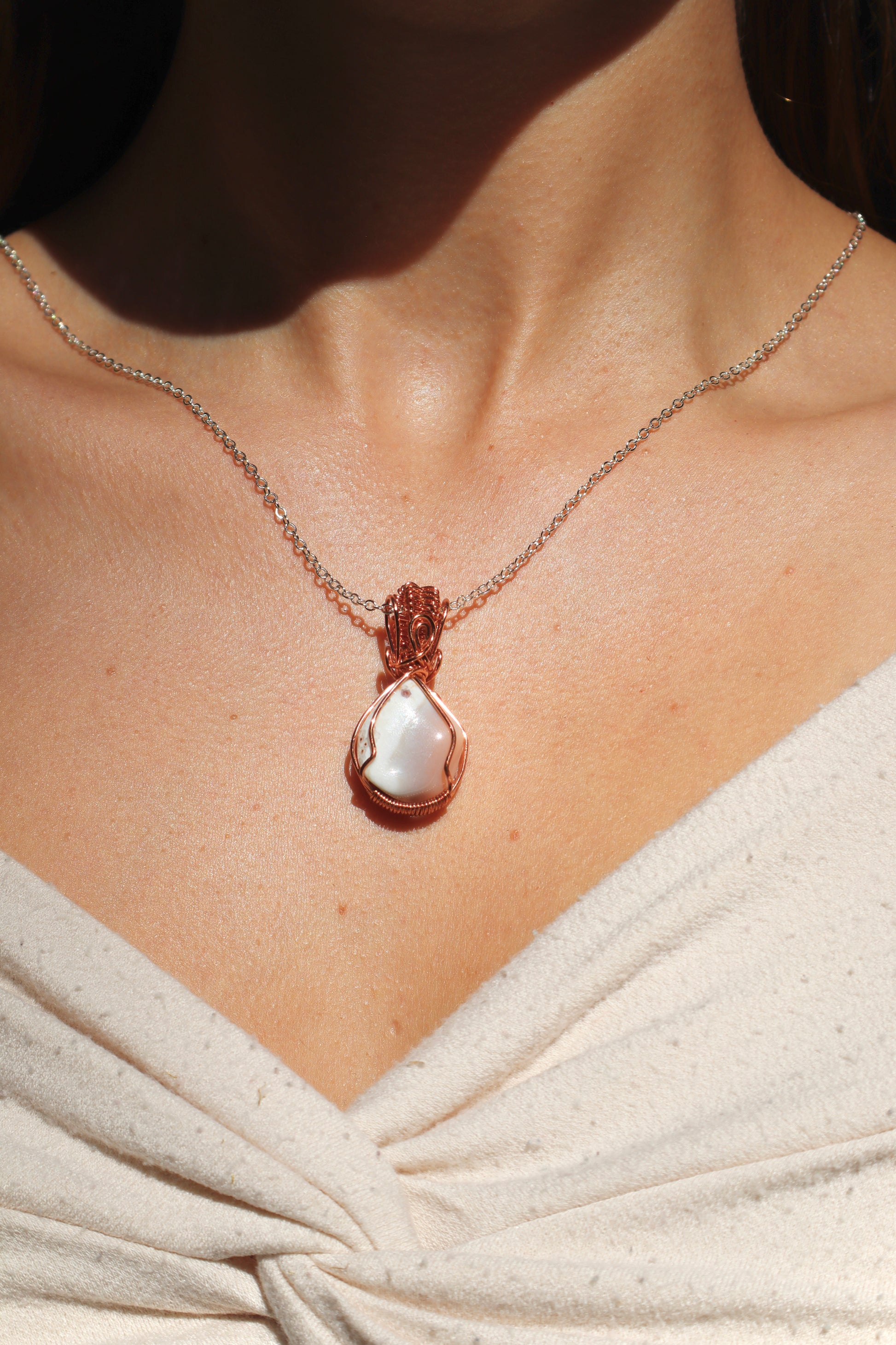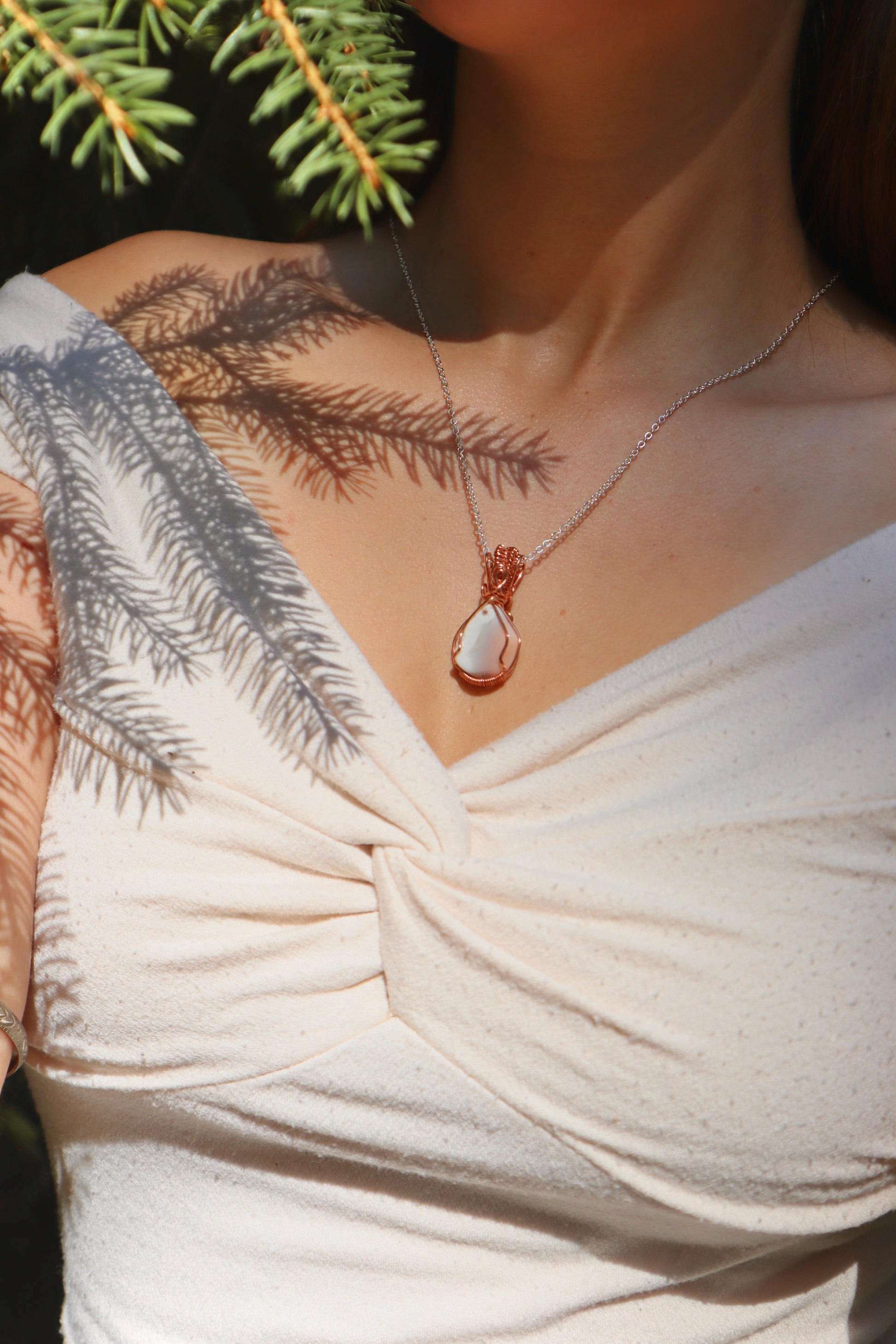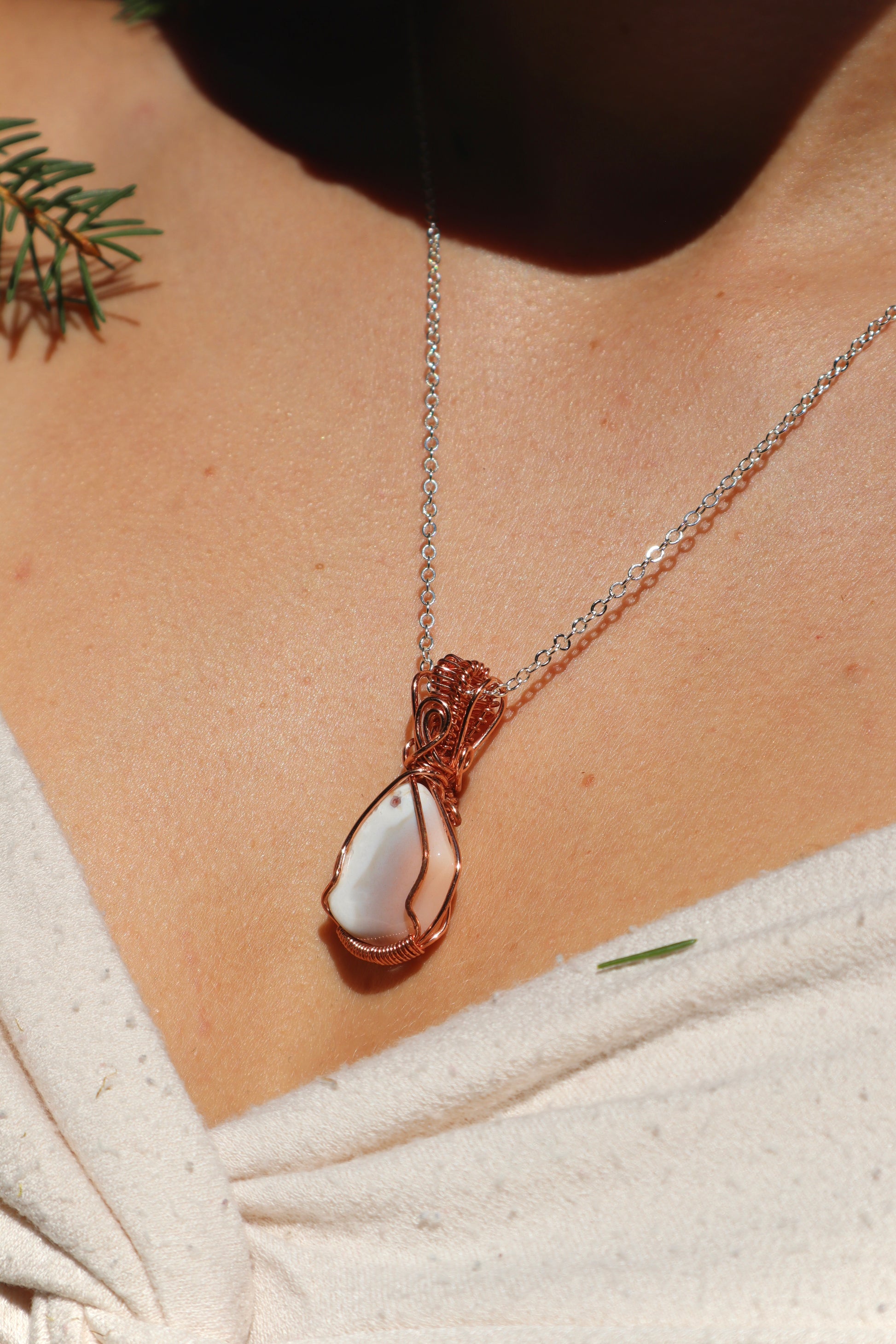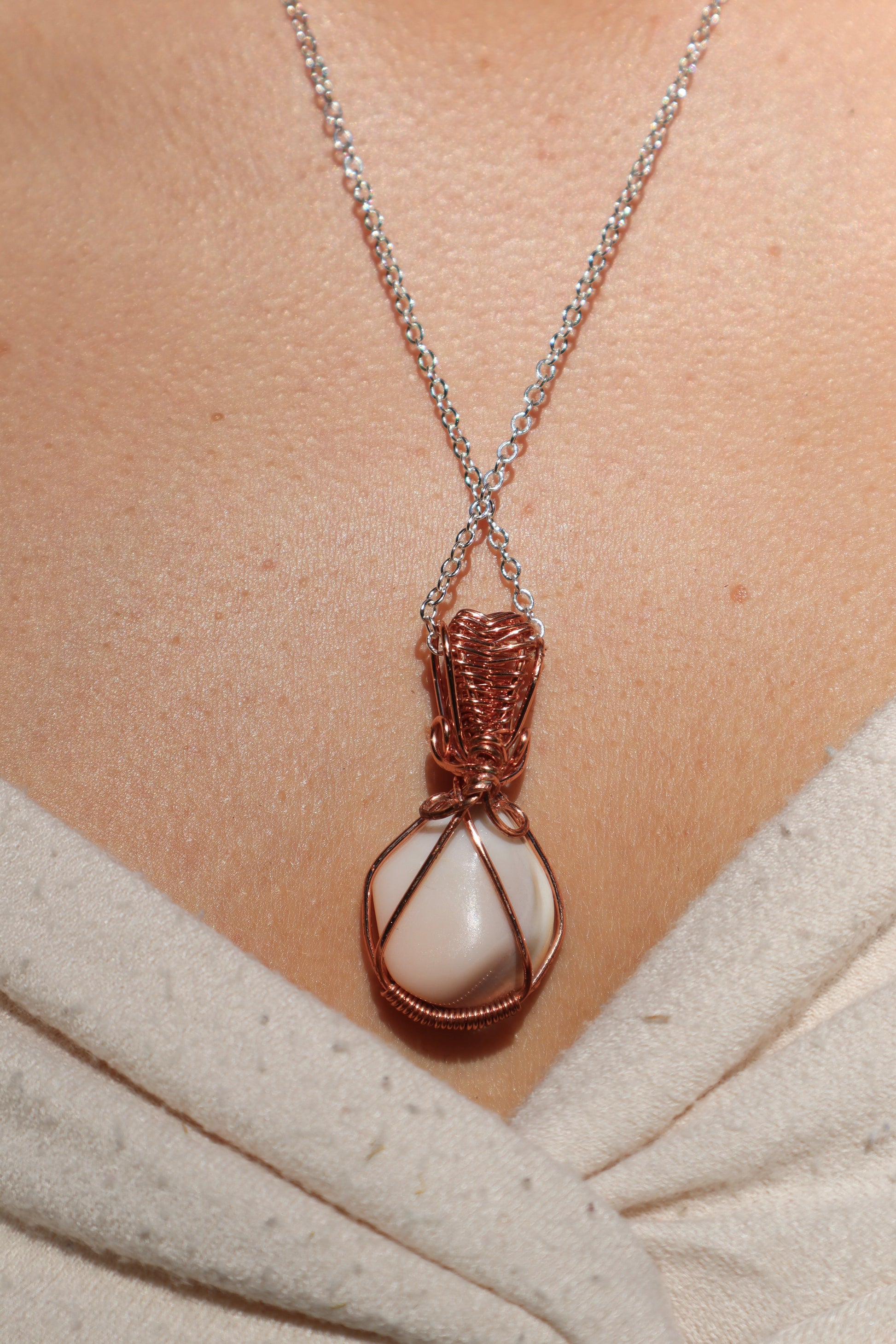Introducing our Pink Botswana Agate Pendant. This pendant showcases a range of stunning pastel pink colors. Its intricate design is wrapped with tarnish-resistant copper wire, adding a touch of beauty and elegance. Paired with your choice of chain, this pendant is the perfect addition to your collection.