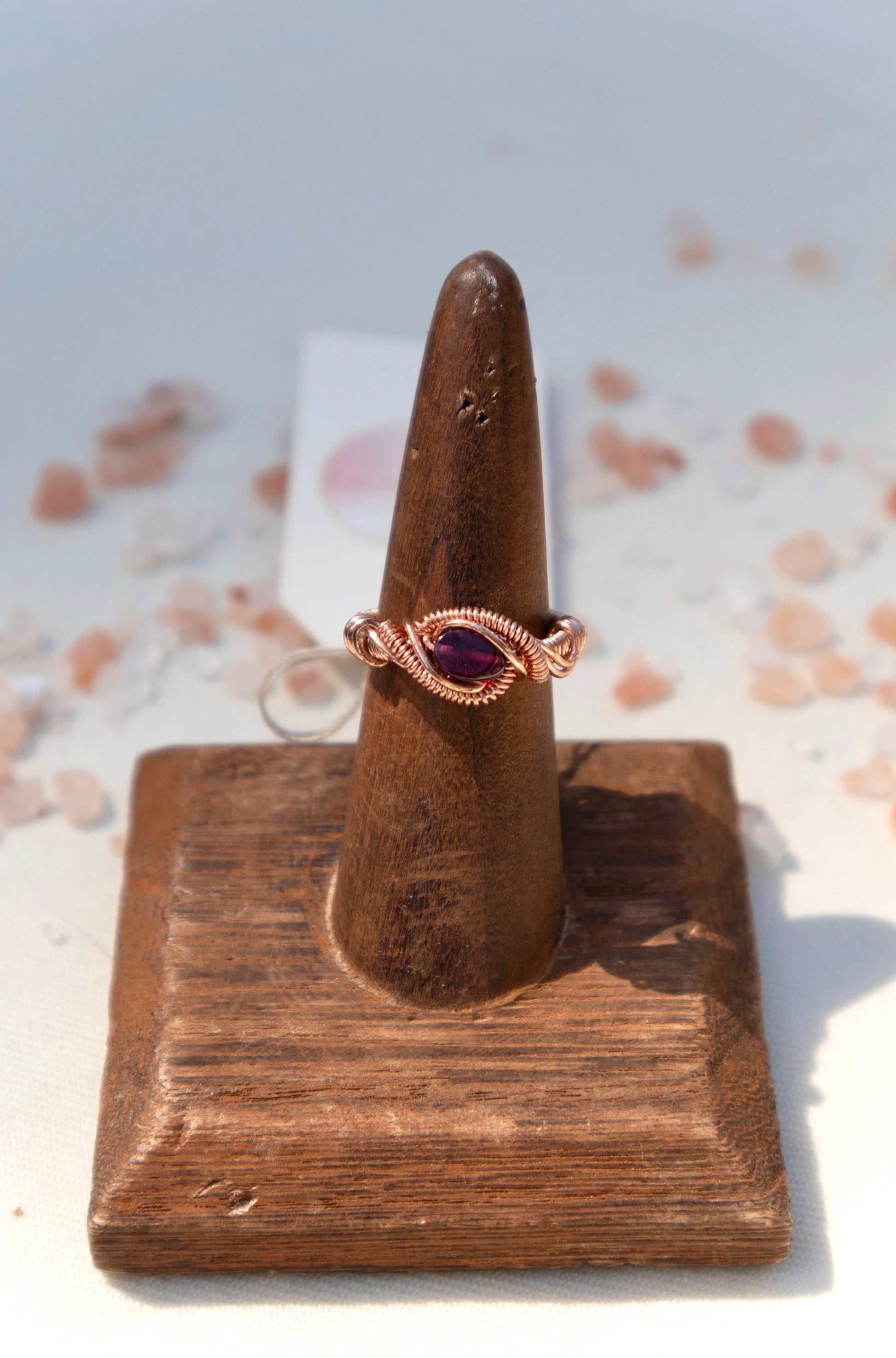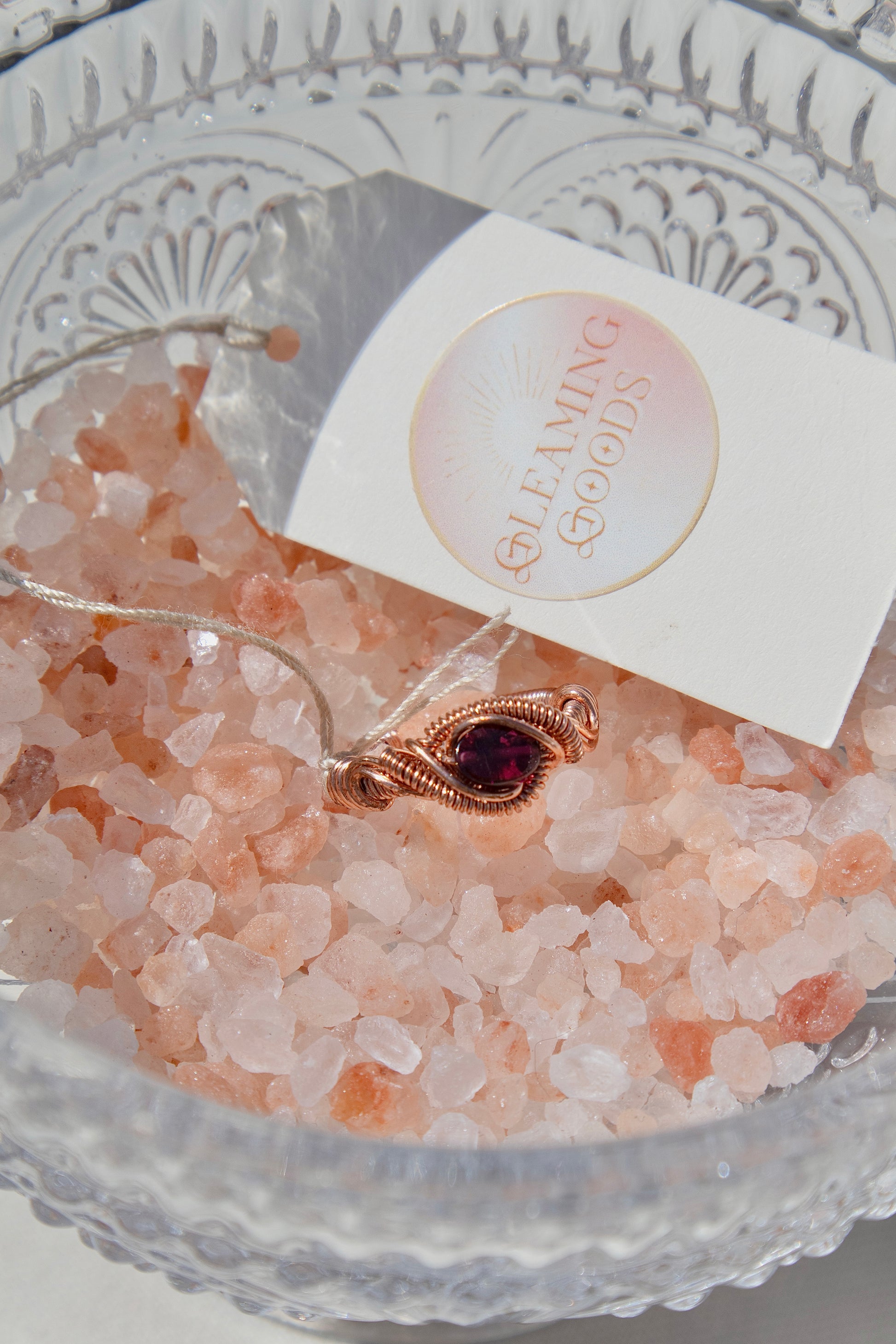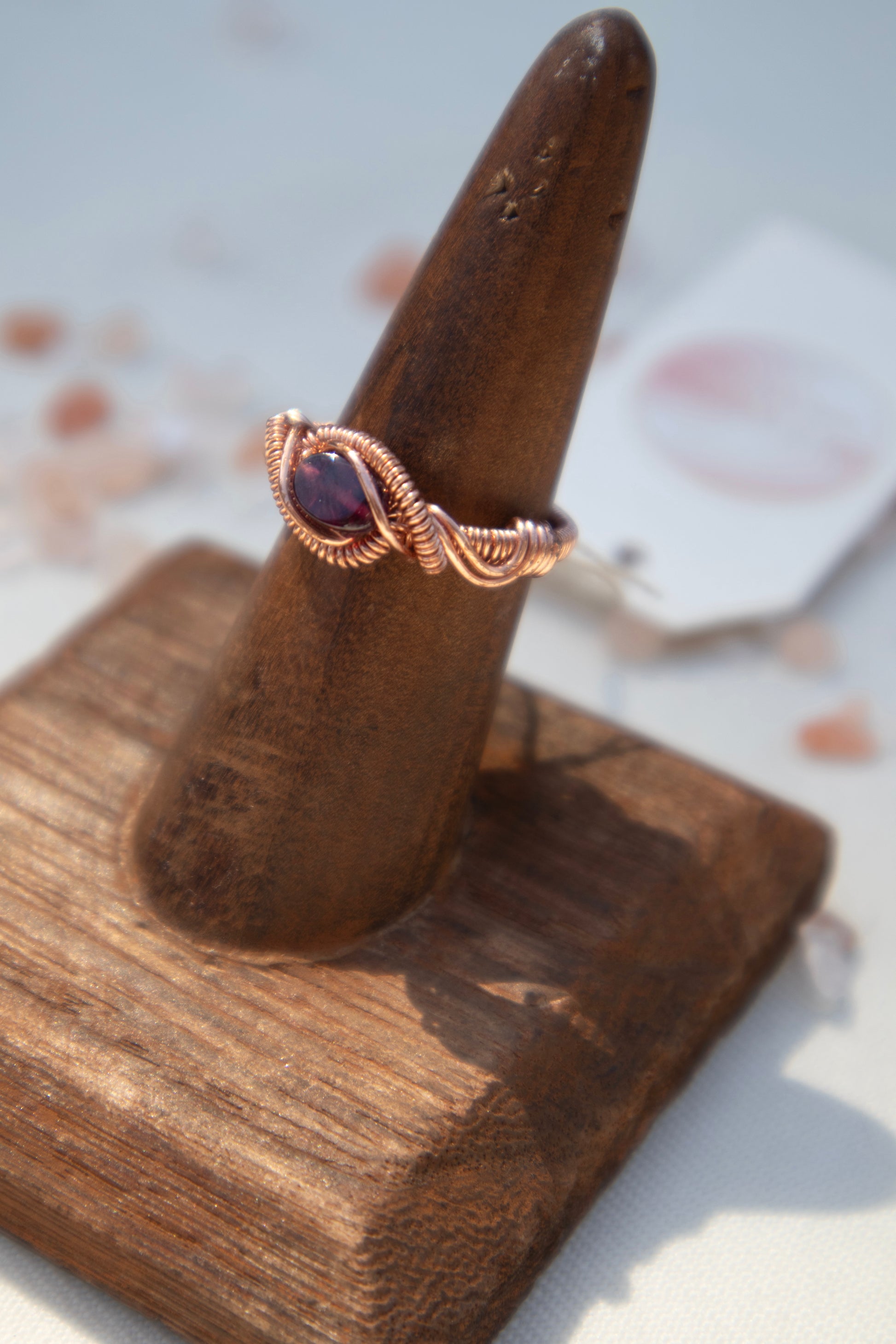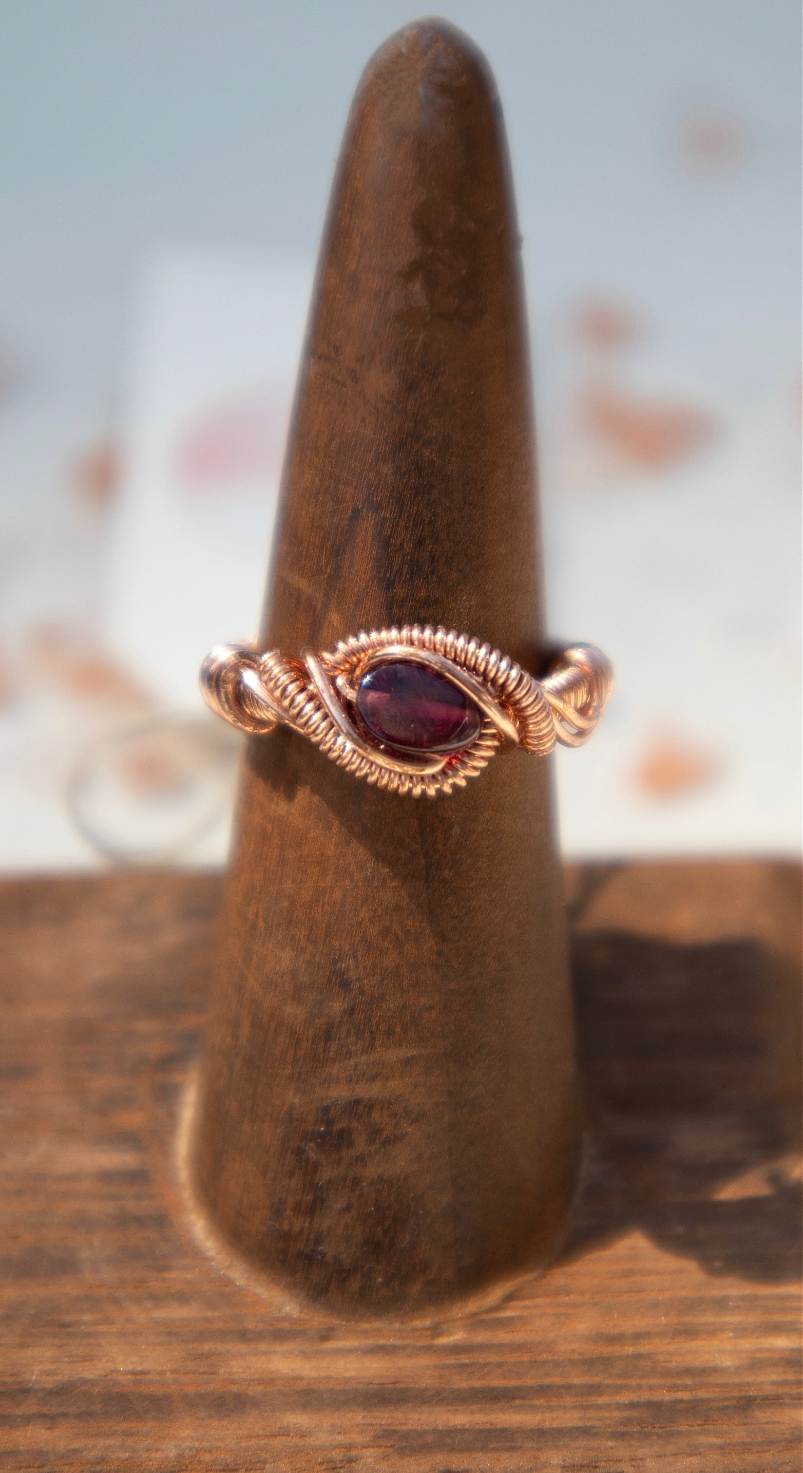 Introducing the mesmerizing beauty of our Red Garnet Intricate Ring. Handcrafted with genuine red garnet crystal, delicately wrapped in tarnish-resistant copper wire. This ring features a stunning rose gold accent that will maintain its color over time. Lightweight and comfortable this ring will add a touch of elegance to your everyday wear.