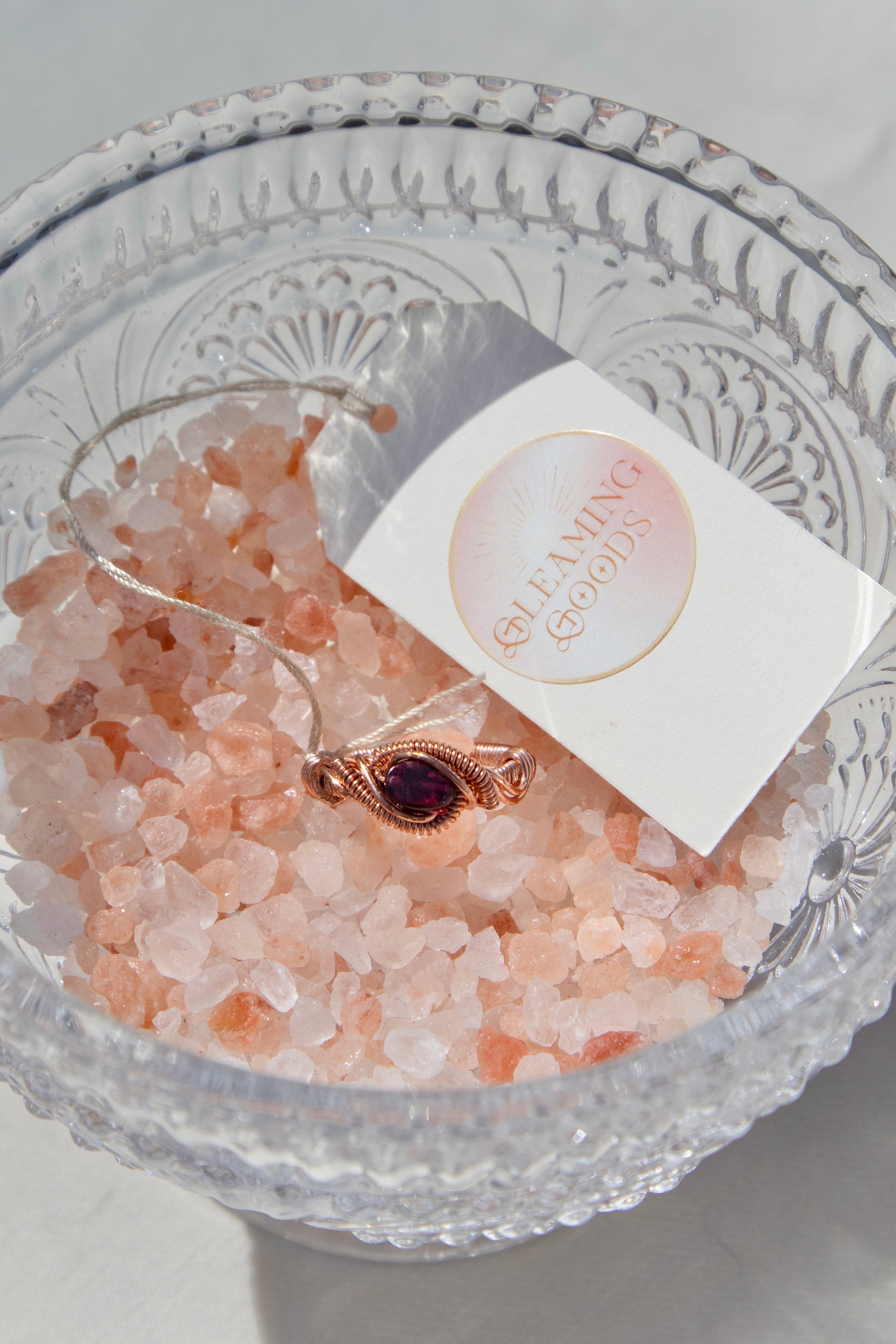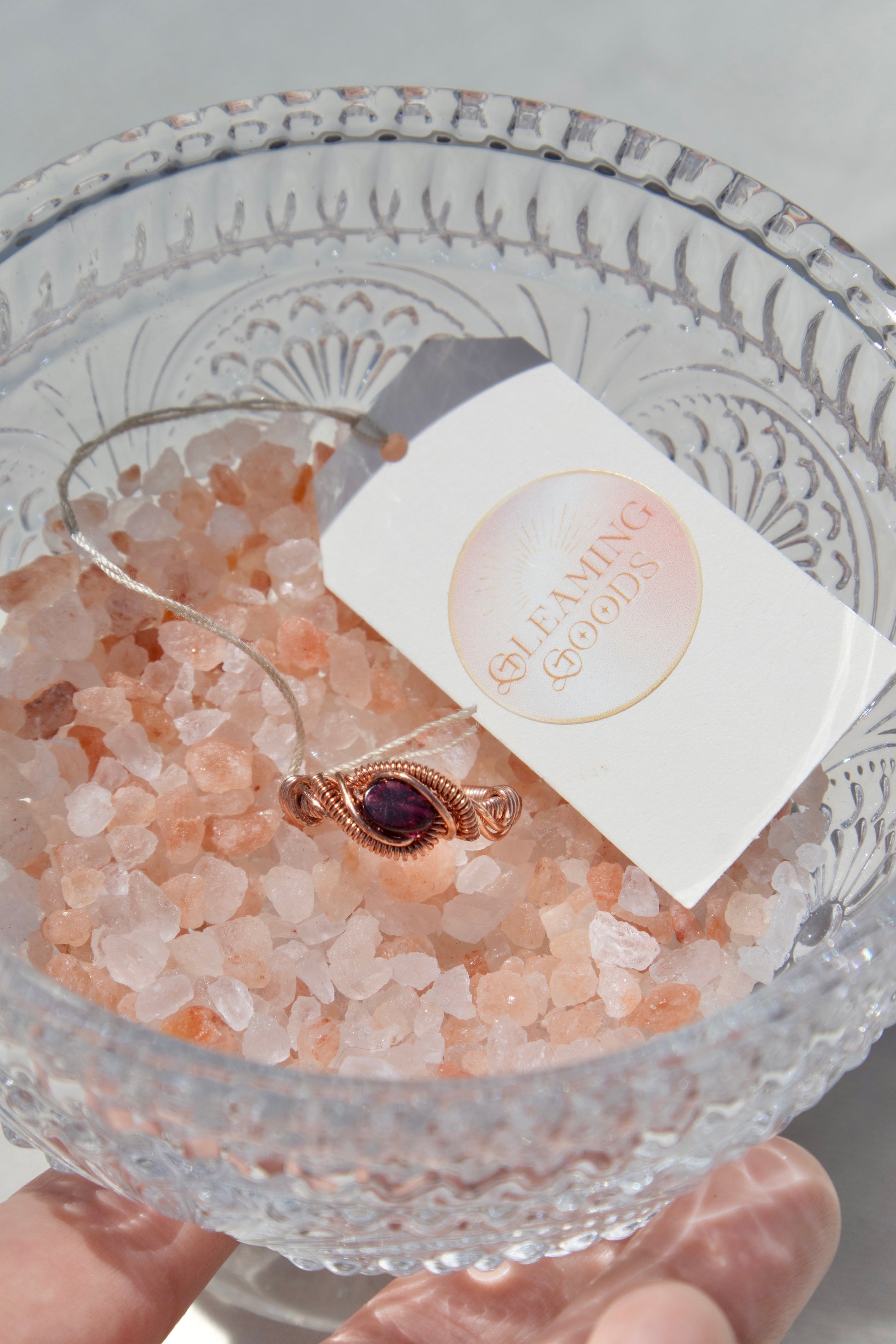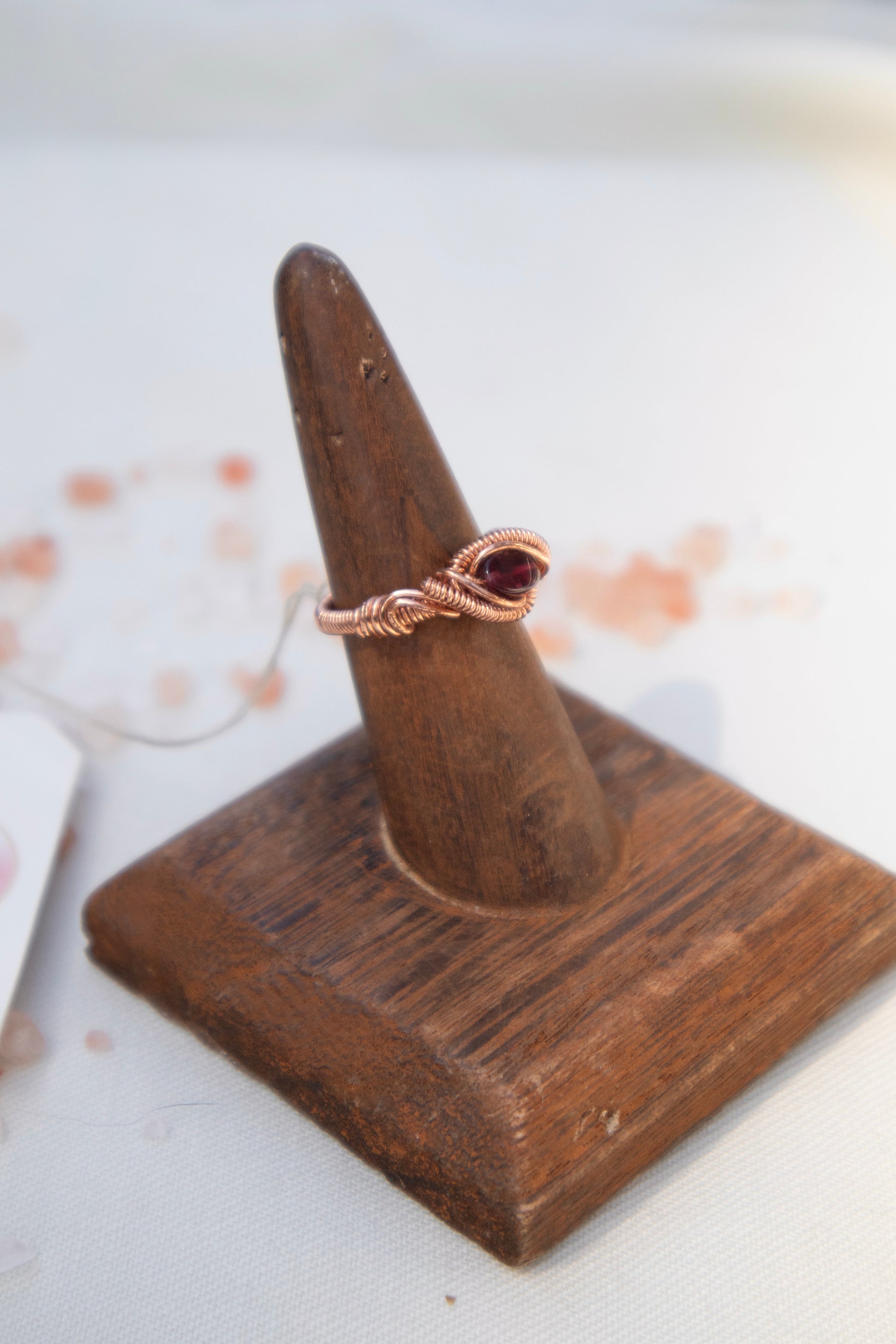 Introducing the mesmerizing beauty of our Red Garnet Intricate Ring. Handcrafted with genuine red garnet crystal, delicately wrapped in tarnish-resistant copper wire. This ring features a stunning rose gold accent that will maintain its color over time. Lightweight and comfortable this ring will add a touch of elegance to your everyday wear.