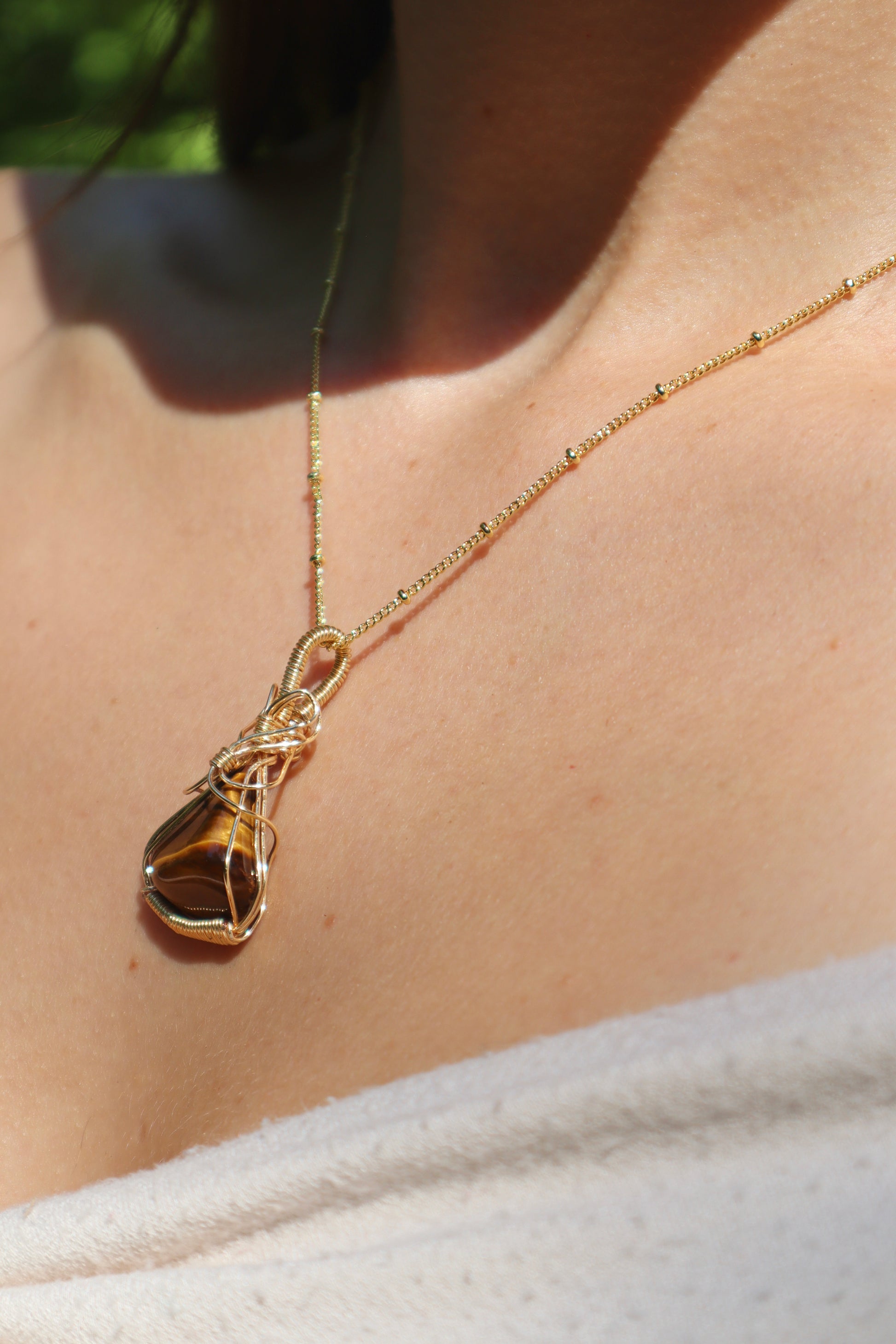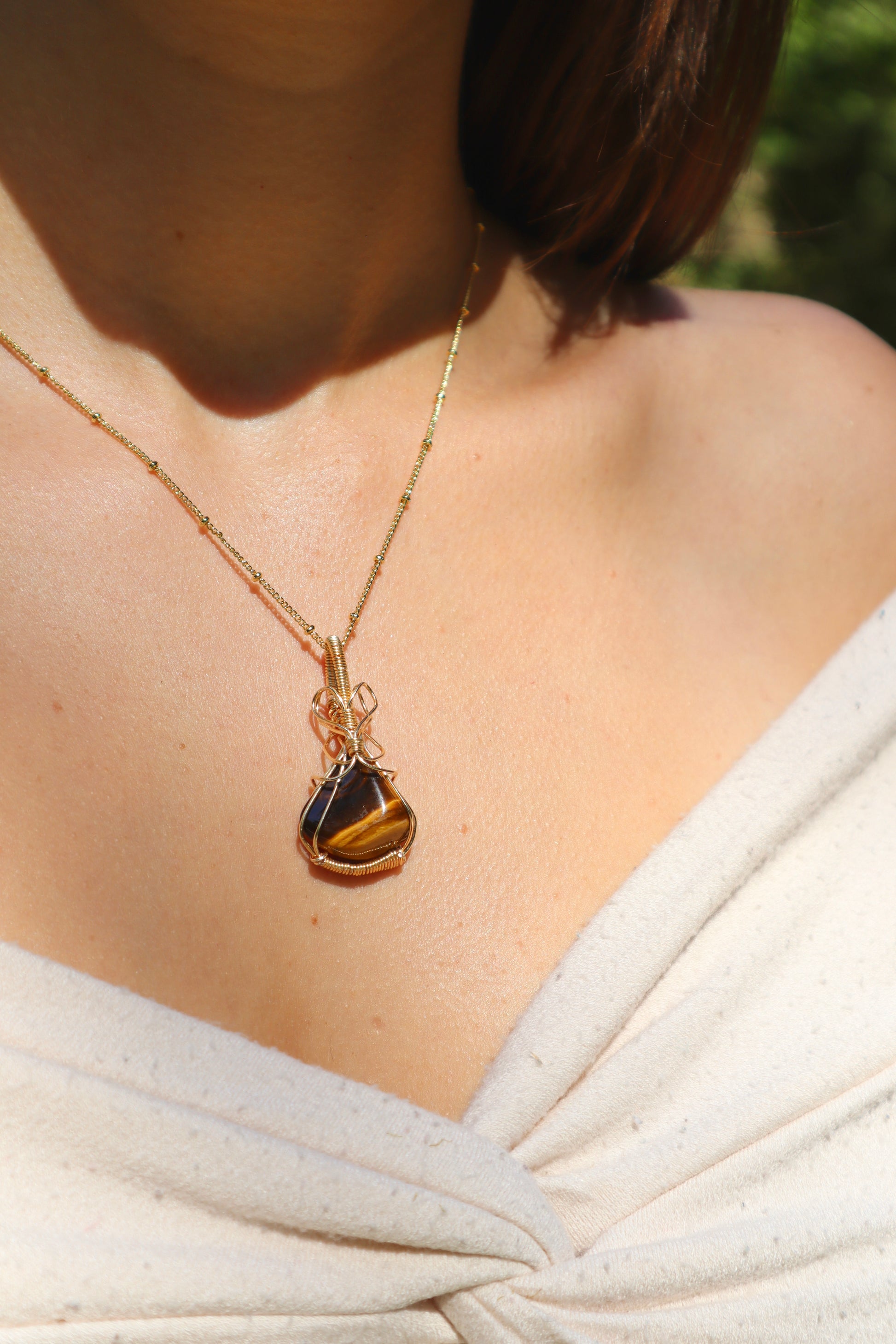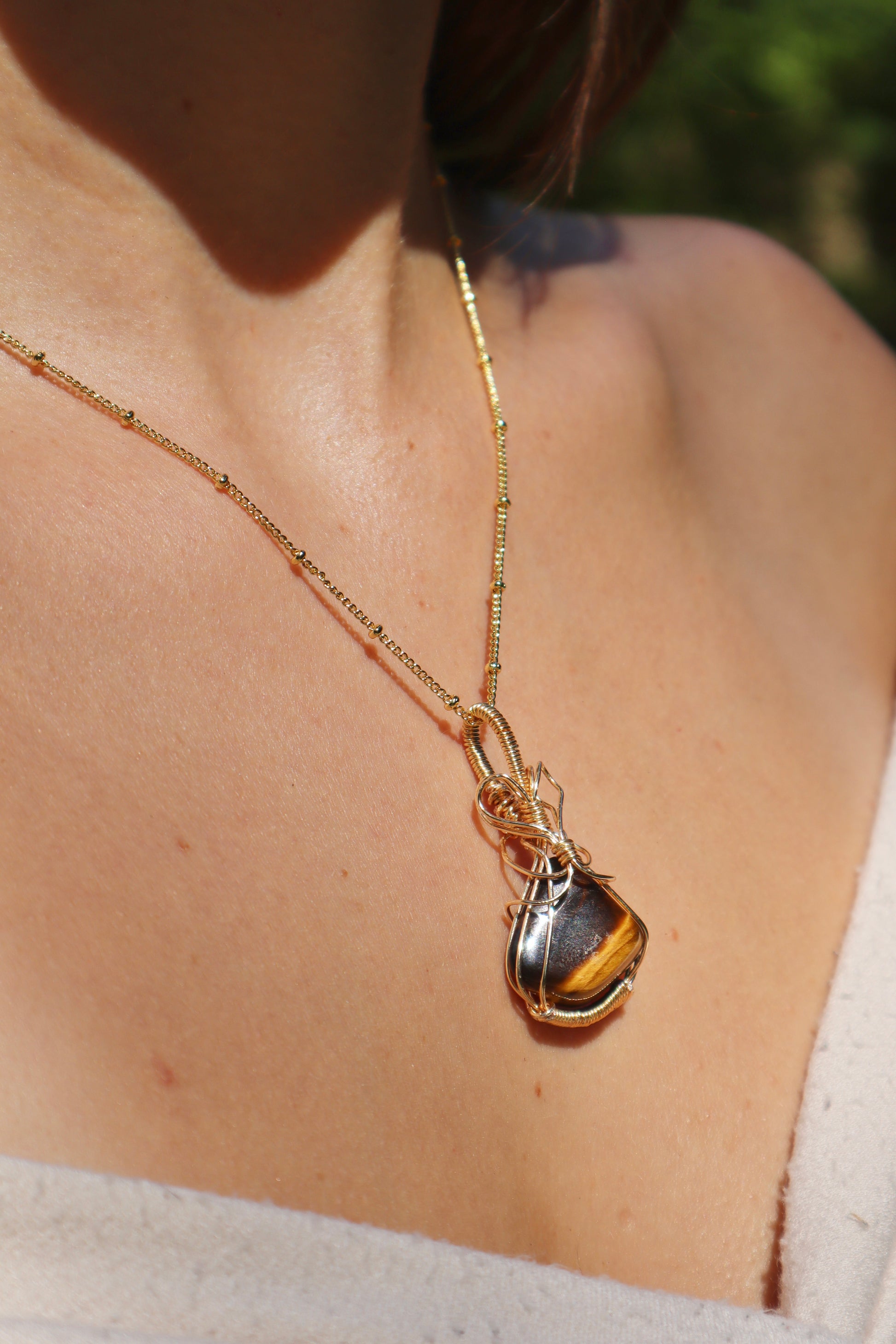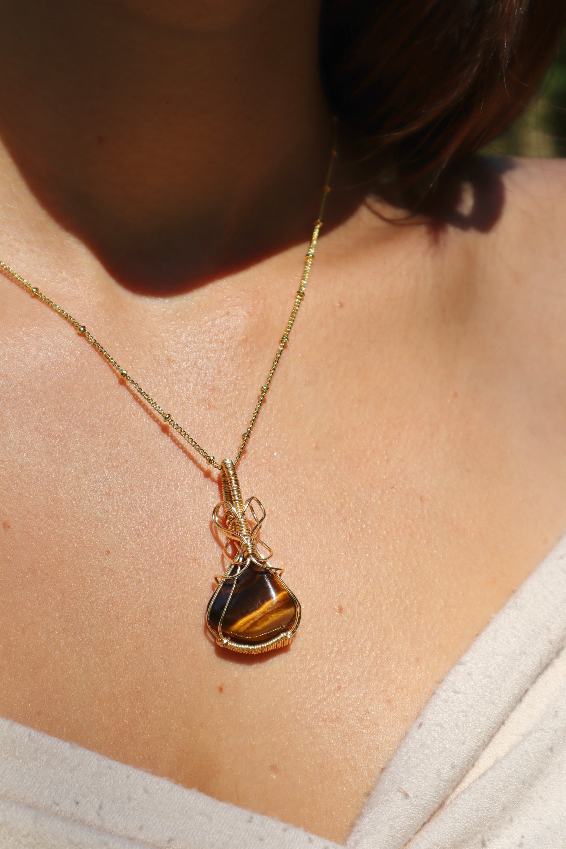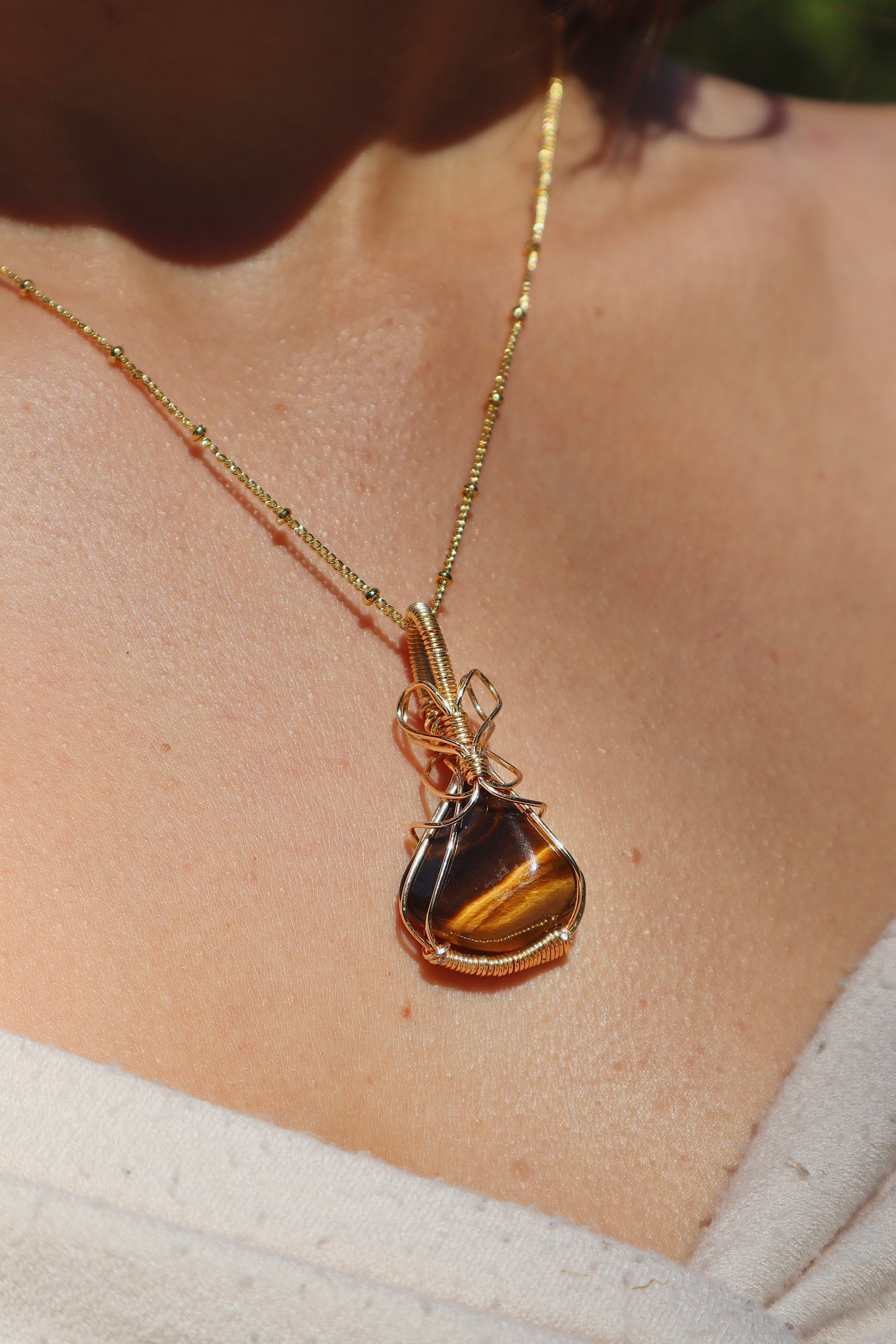 Crafted with elegance, this Tigers Eye Gemstone Pendant is a stunning addition to any jewelry collection. This genuine crystal is wrapped in radiant tarnish resistant gold wire with your choice of necklace chain. This beautiful pendant is the perfect piece for timeless and everyday wear.