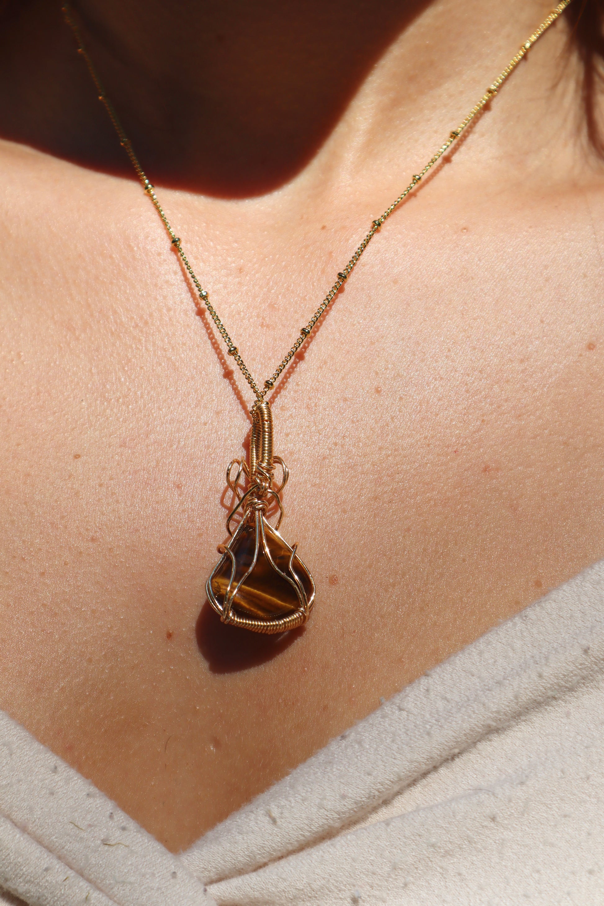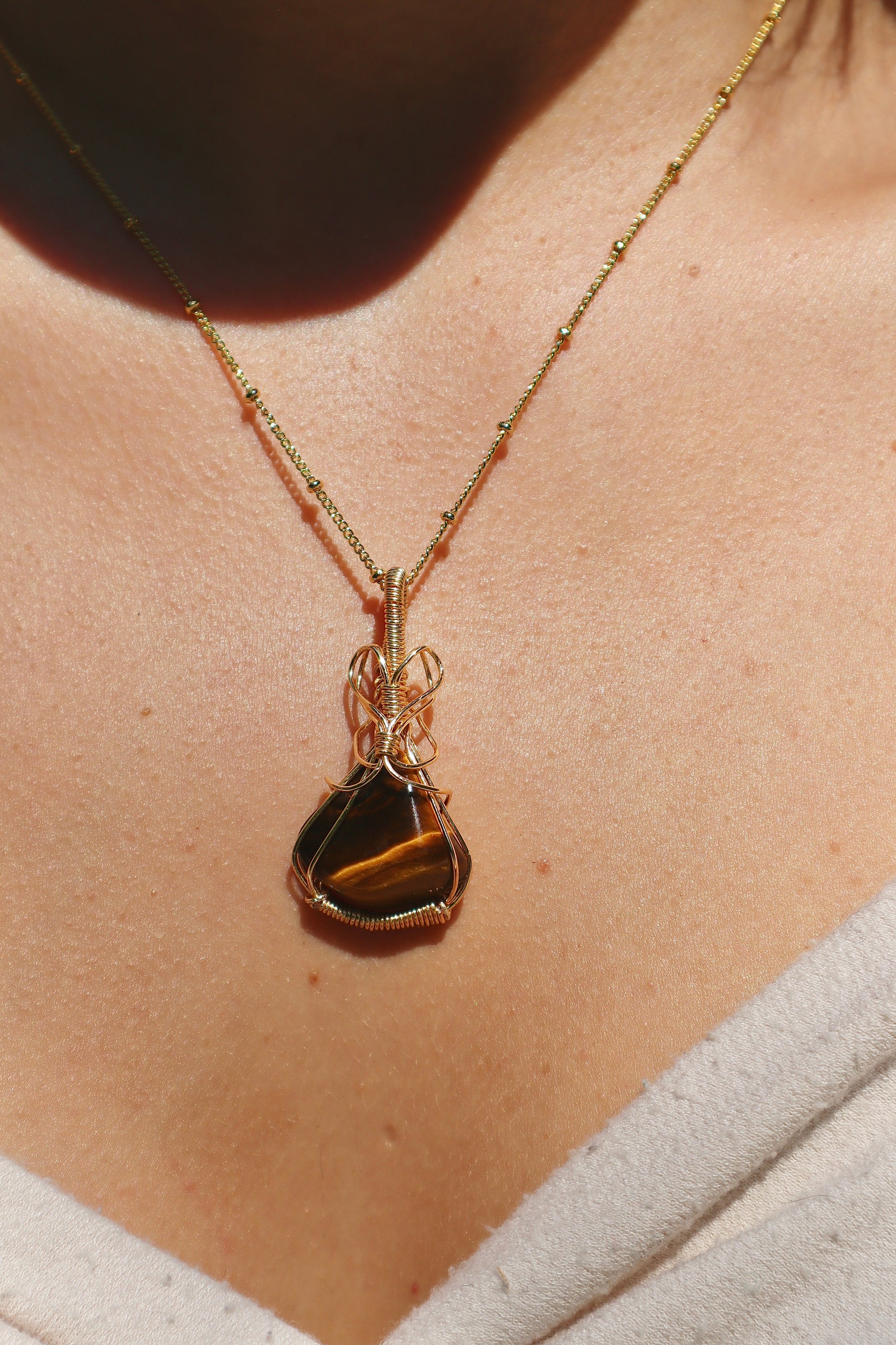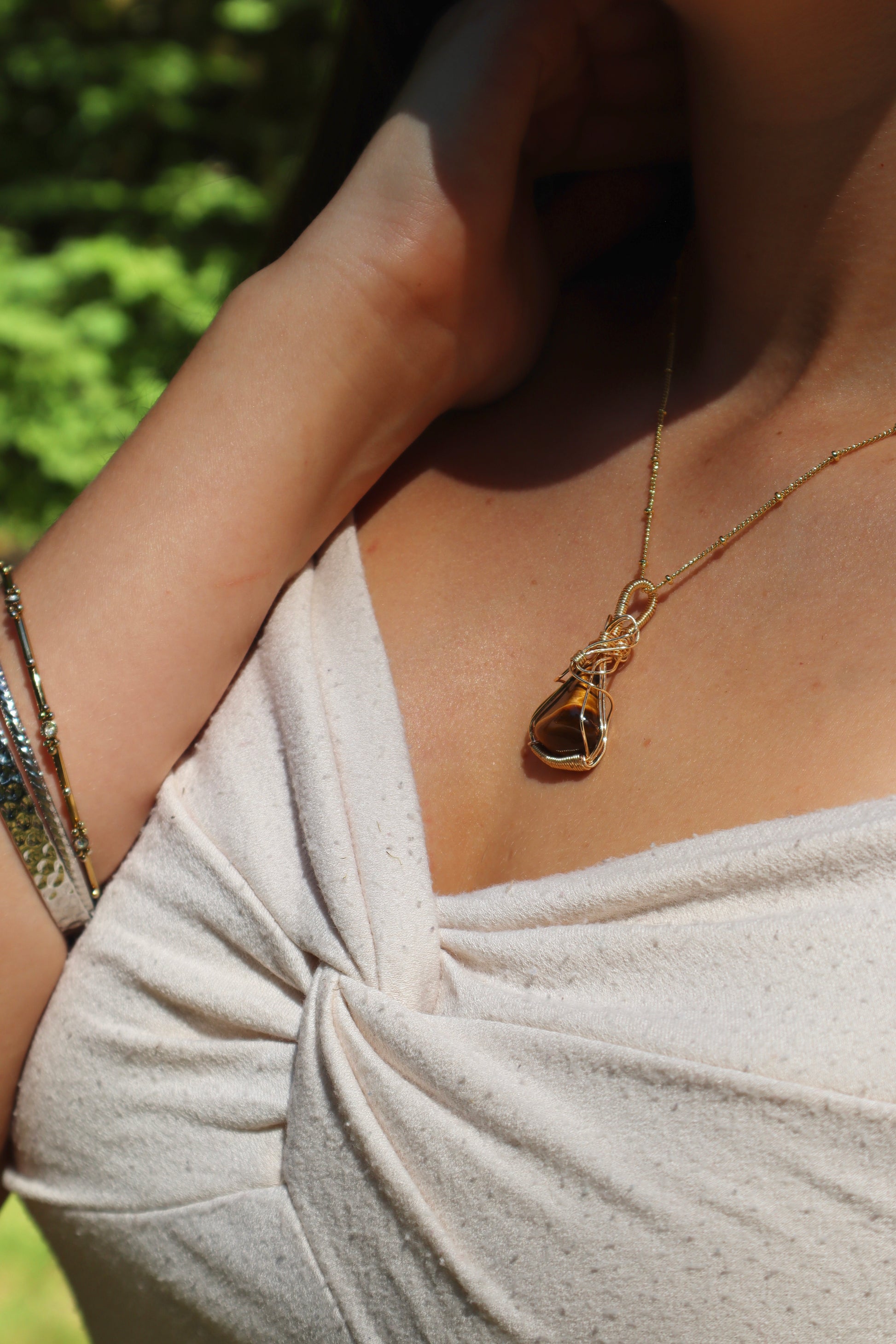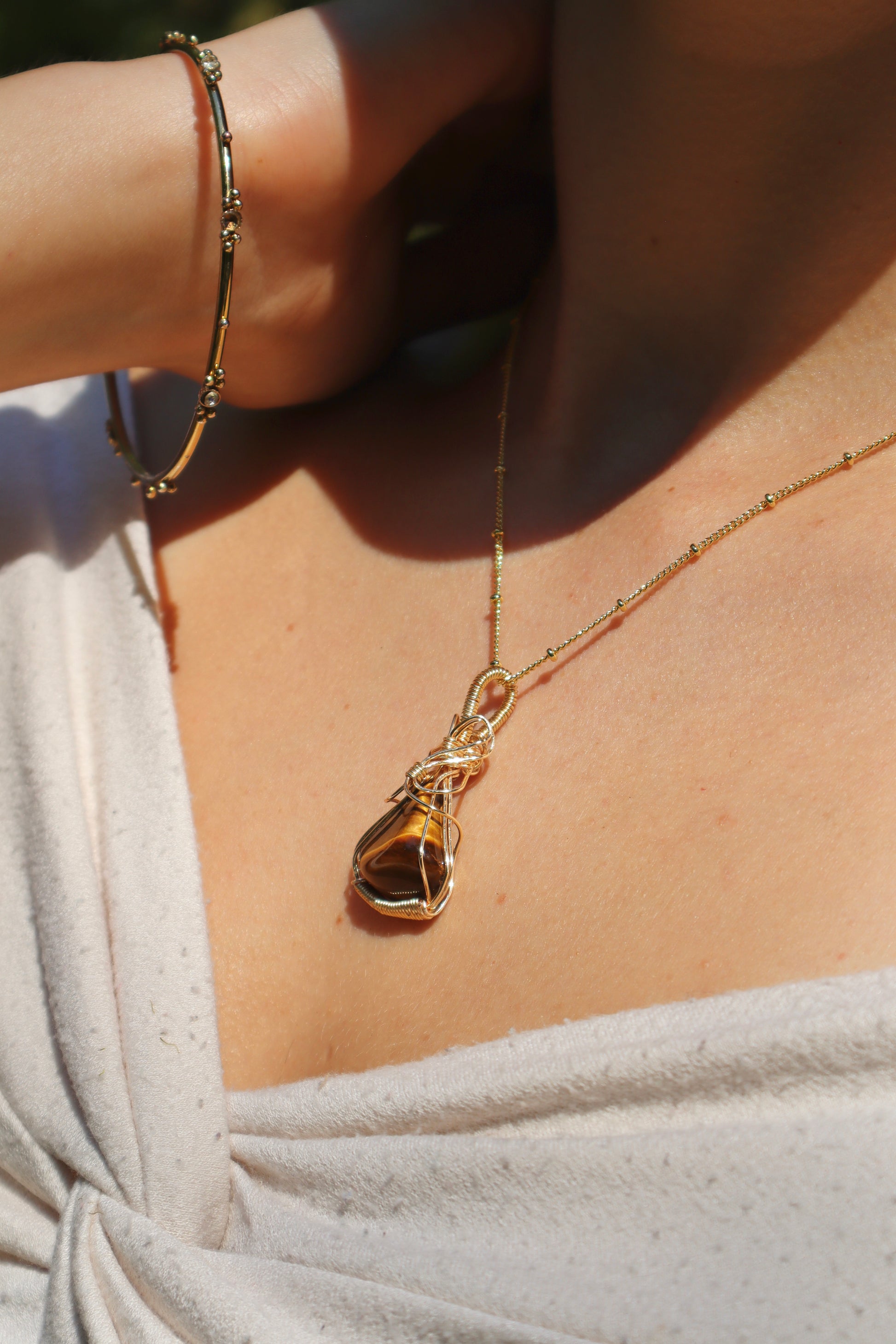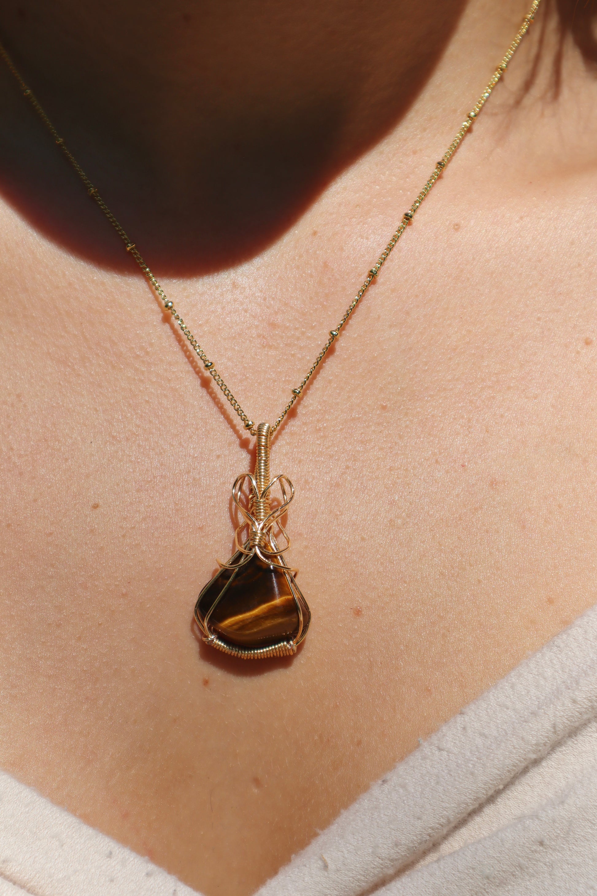 Crafted with elegance, this Tigers Eye Gemstone Pendant is a stunning addition to any jewelry collection. This genuine crystal is wrapped in radiant tarnish resistant gold wire with your choice of necklace chain. This beautiful pendant is the perfect piece for timeless and everyday wear.